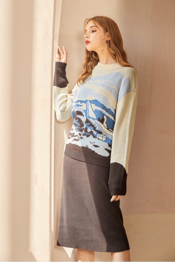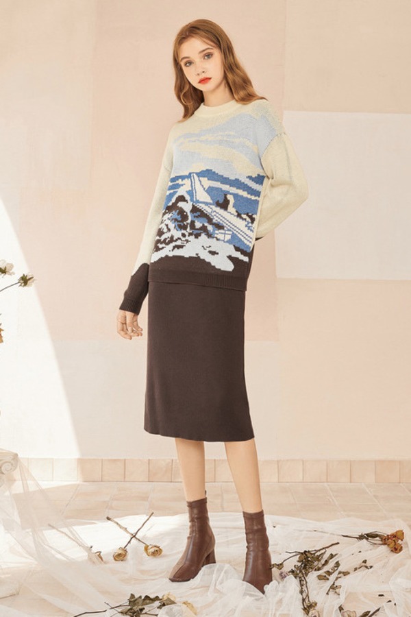 MEETLADY/米莱达 时髦复古印花毛衣包臀裙套装 15134