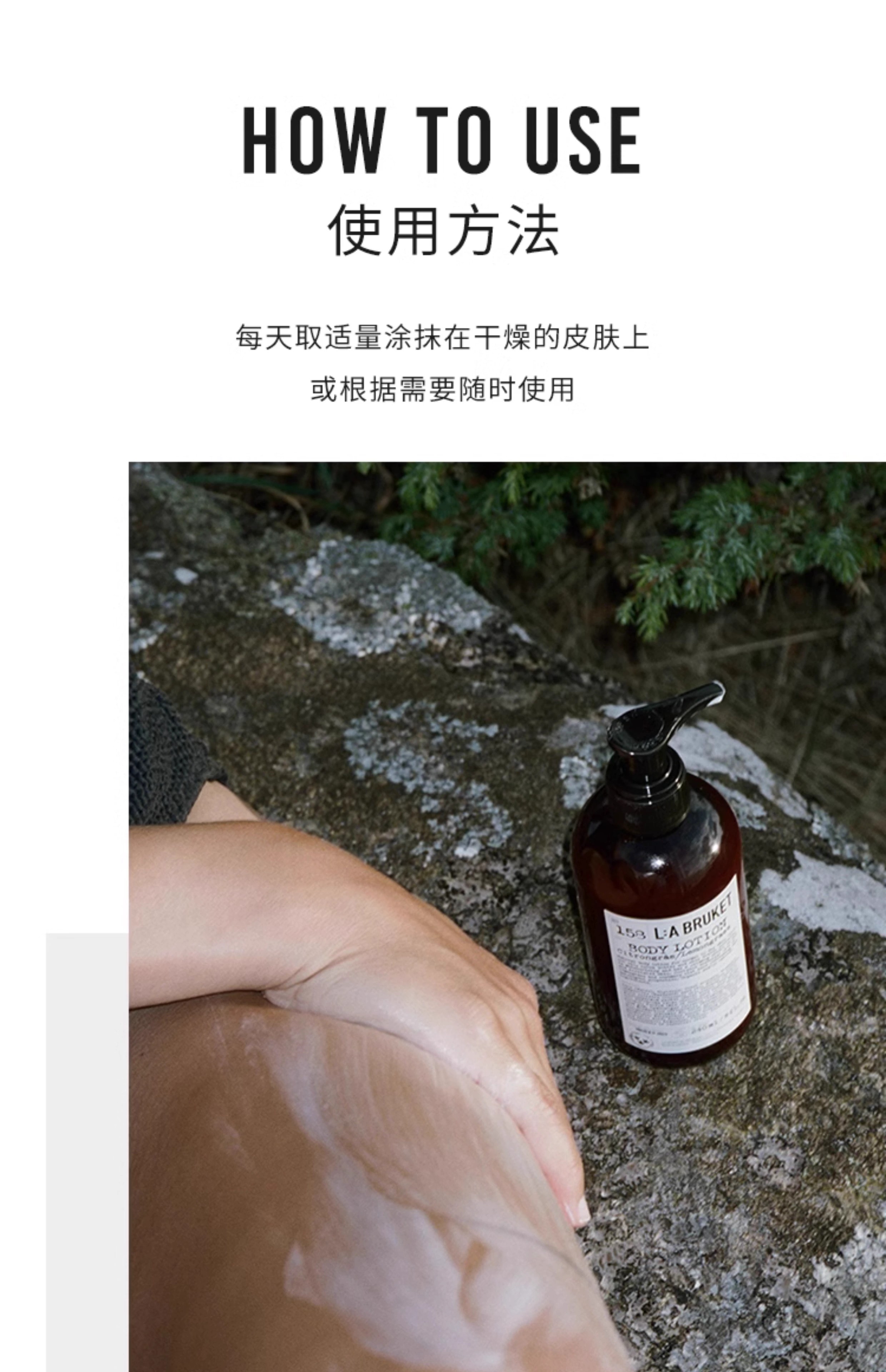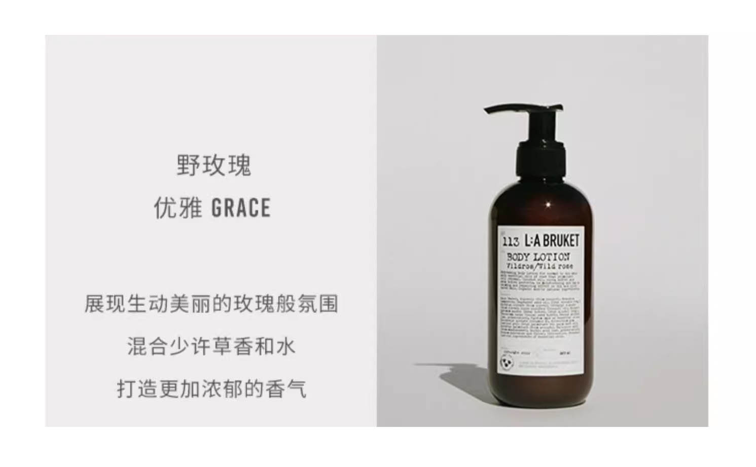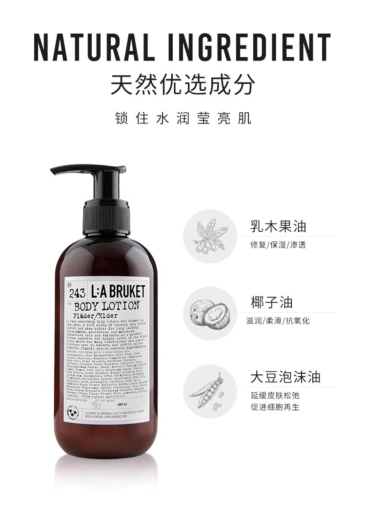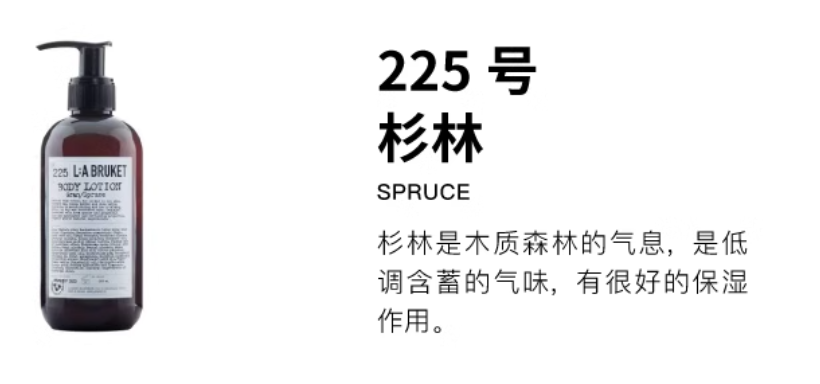 【品名】L:A BRUKET身体乳240ml 225 云杉\113 野玫瑰
