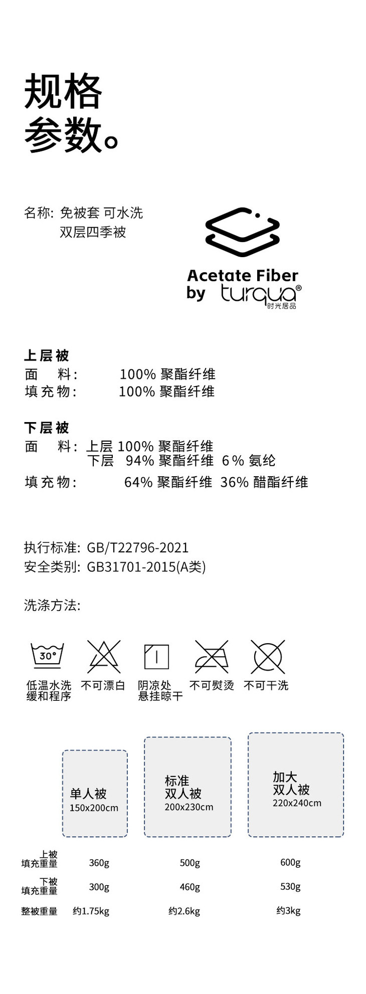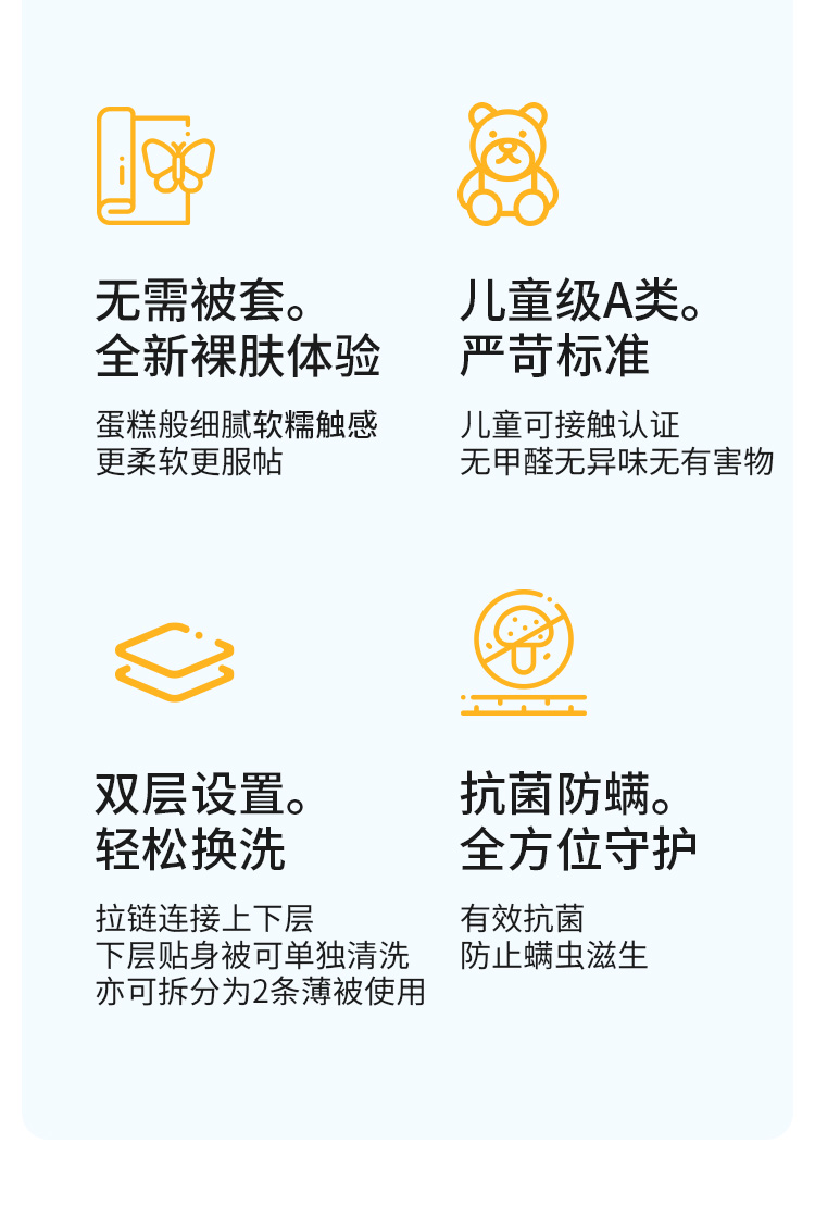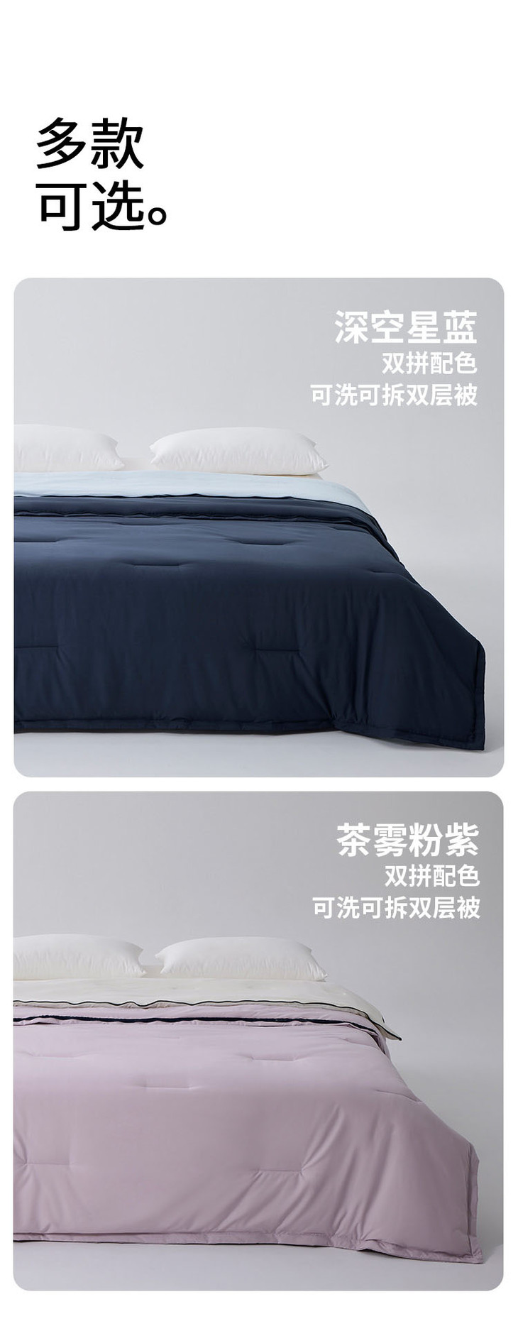 【优选家纺 | 双层水洗四季被】儿童级A类面料标准,细腻亲肤,蓬松柔软,透湿透气,无需被套,全新裸肤体验。双层设置轻松换洗,抗菌防螨,耐用好洗,方便维护~