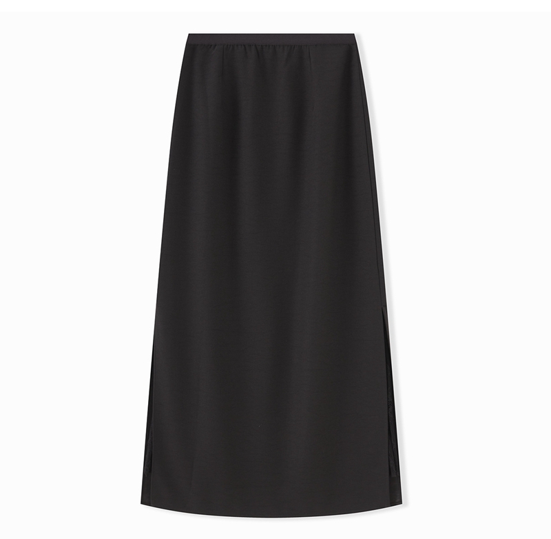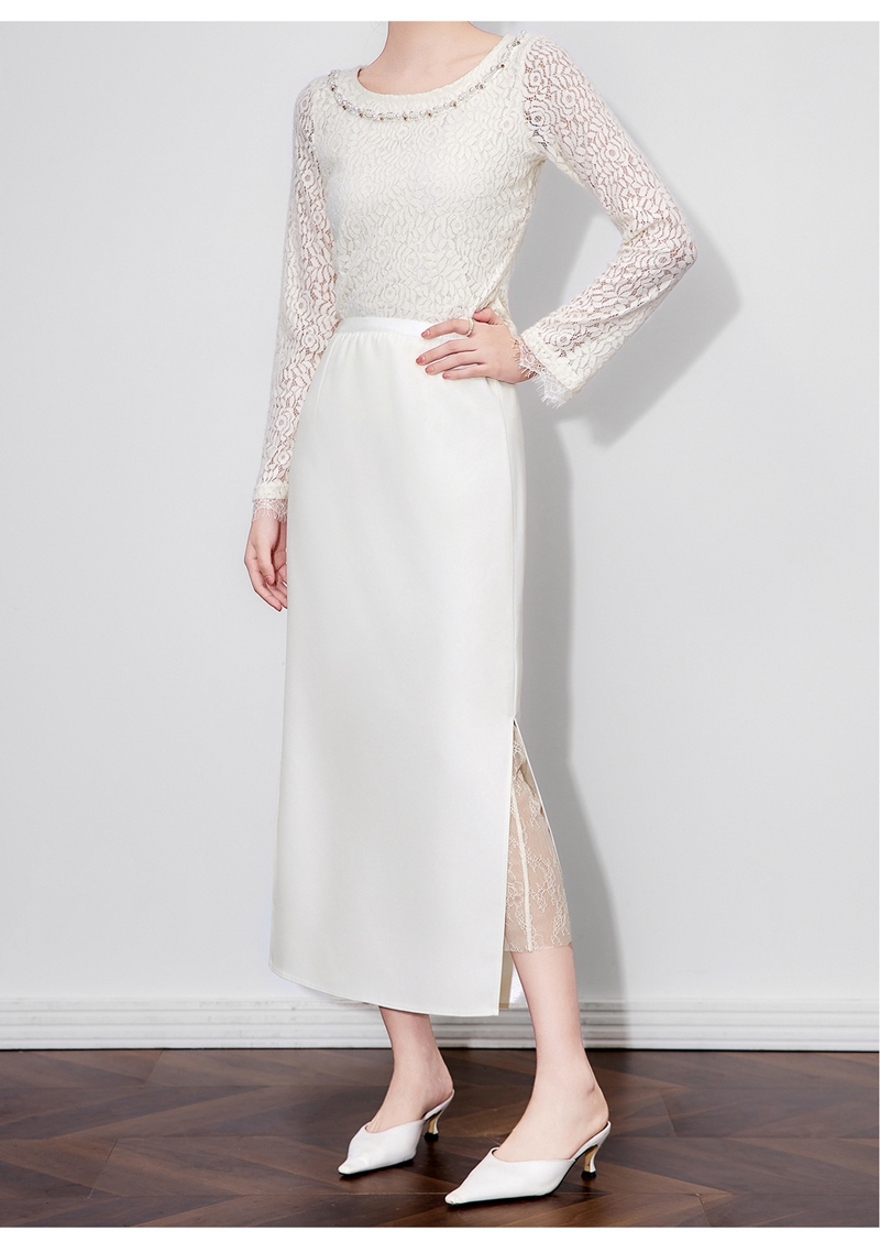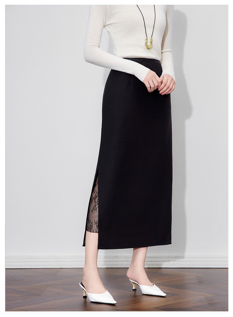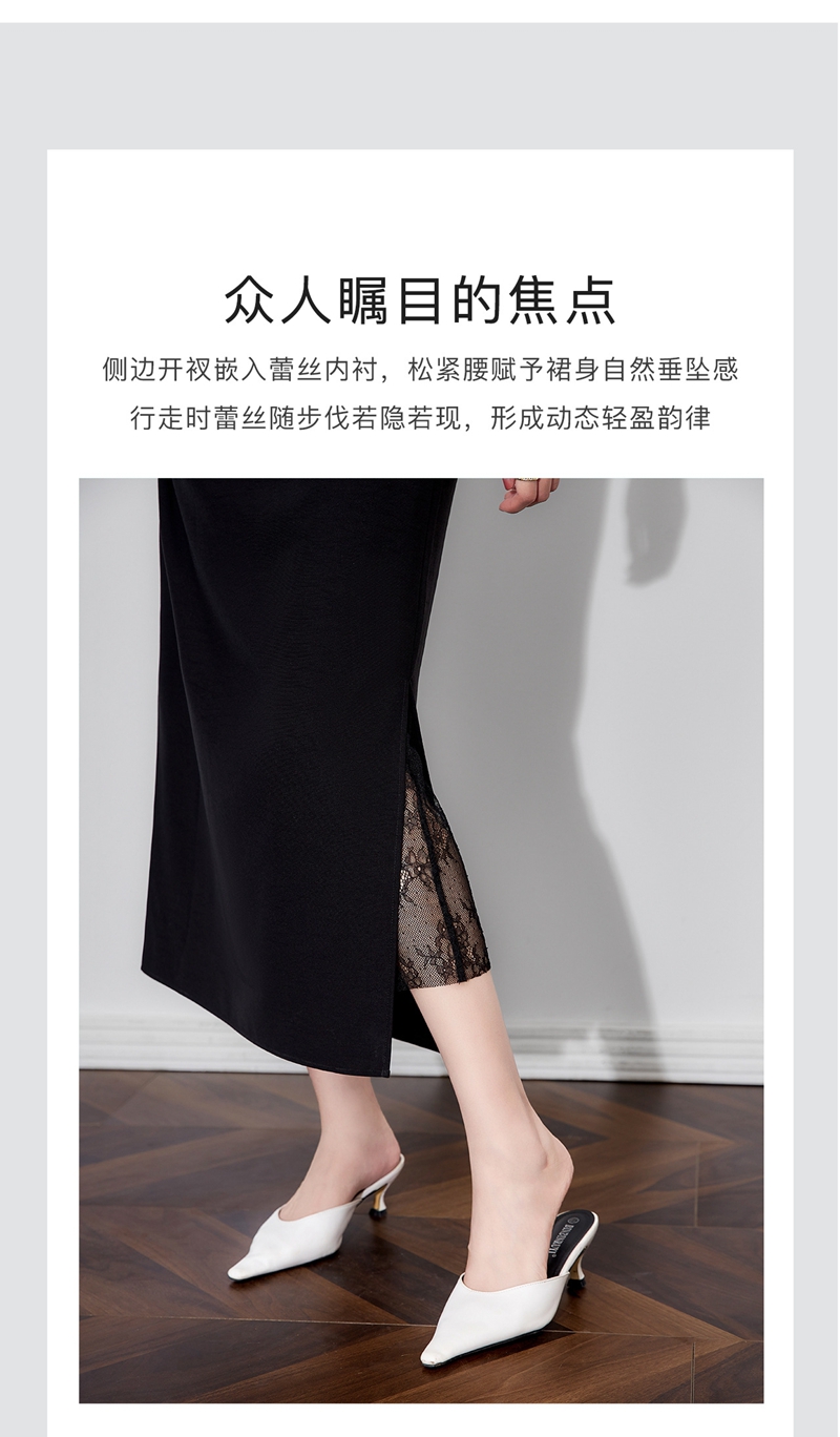 极简知性拼接蕾丝高腰松紧腰开衩修身半身裙