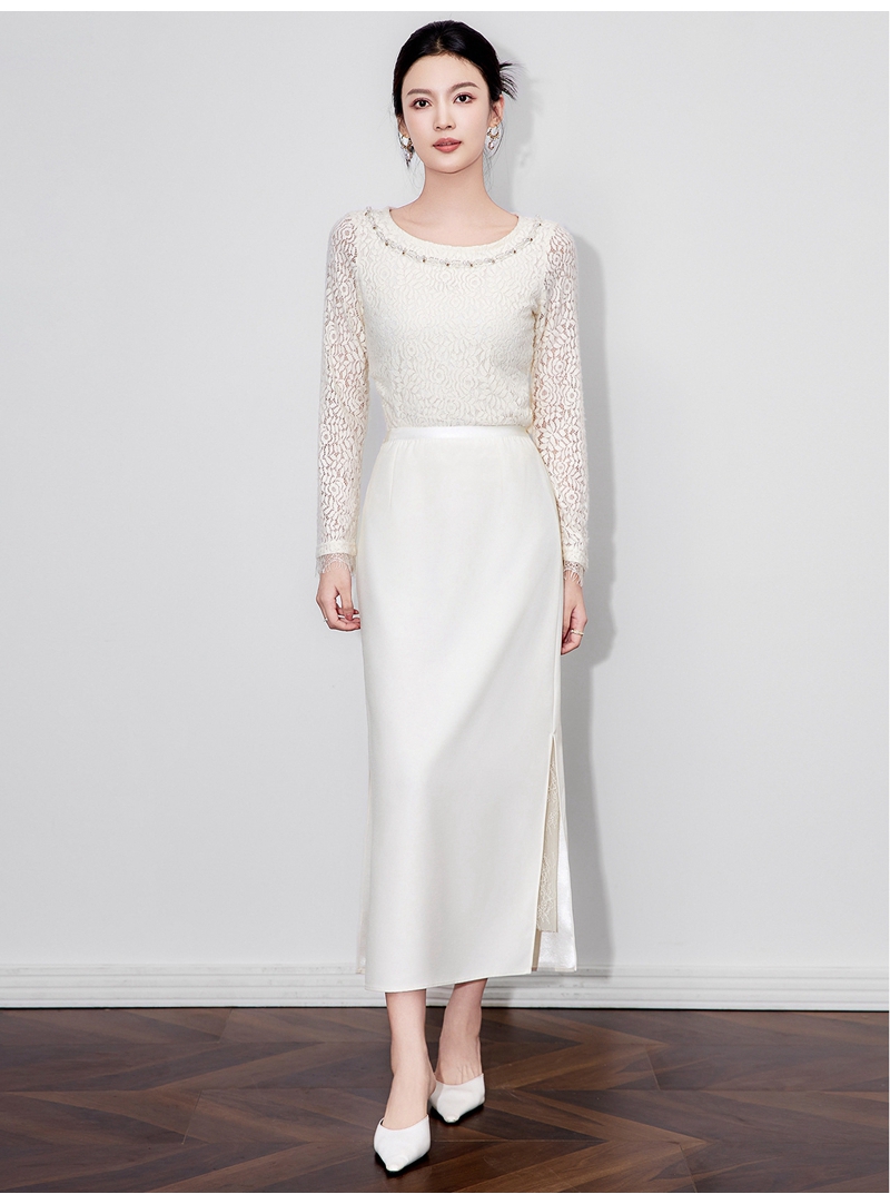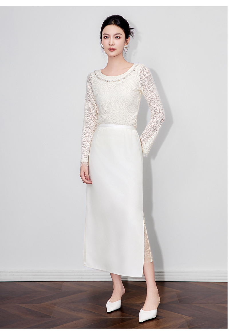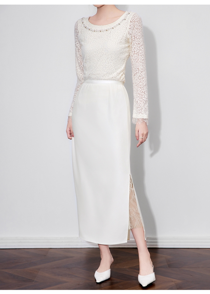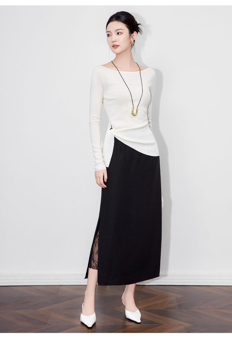 极简知性拼接蕾丝高腰松紧腰开衩修身半身裙
