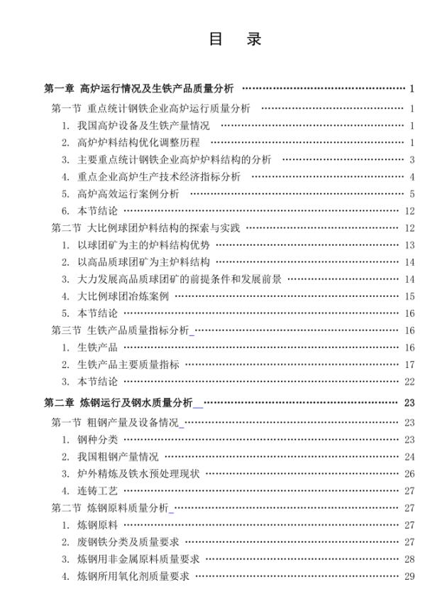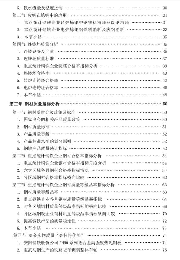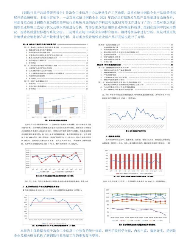 《钢铁行业产品质量研究报告》是冶金工业信息中心从钢铁生产工艺角度,对重点统计钢铁企业产品质量情况展开的系统研究,主要内容如下:一是对重点统计钢铁企业2021年高炉运行情况及生铁产品质量进行系统分析,对部分重点统计钢铁企业为提高高炉运行质量所开展的高炉炉料结构优化研究等工作进行了介绍;二是对重点统计钢铁企业炼钢工艺运行状况及钢水质量进行分析,对部分重点统计钢铁企业炼钢原料质量、废钢在炼钢中的应用情况、连铸坯质量指标进行系统分析;三是对重点统计钢铁企业钢材合格率、钢材等级品率进行分析;四是对重点统计钢铁企业钢材新产品产量率进行分析,并对重点统计钢铁企业新产品开发情况进行了介绍。