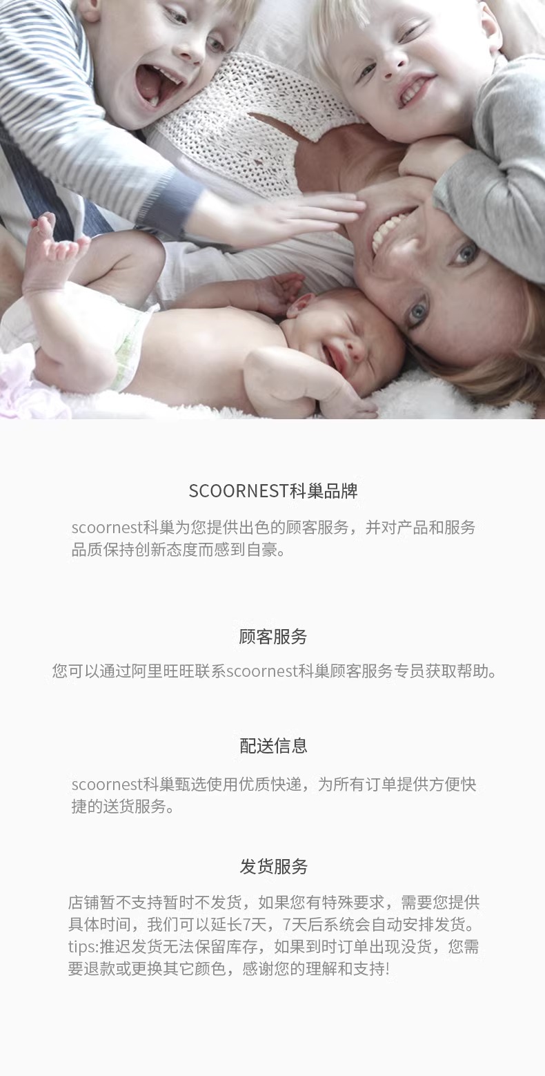 - Scoornest始终秉承给每一位宝宝送去科学的、关心的、创新的成长体验,通过提供商品和服务,使顾客形成守护、发展、巩固这种弥足珍贵的亲情的爱。