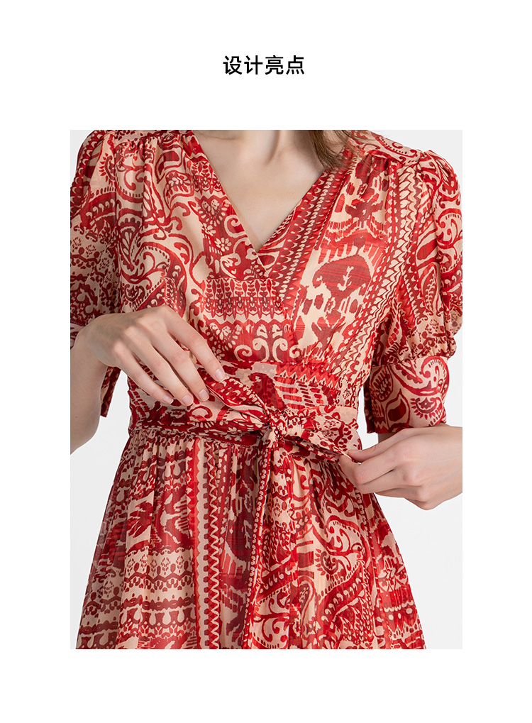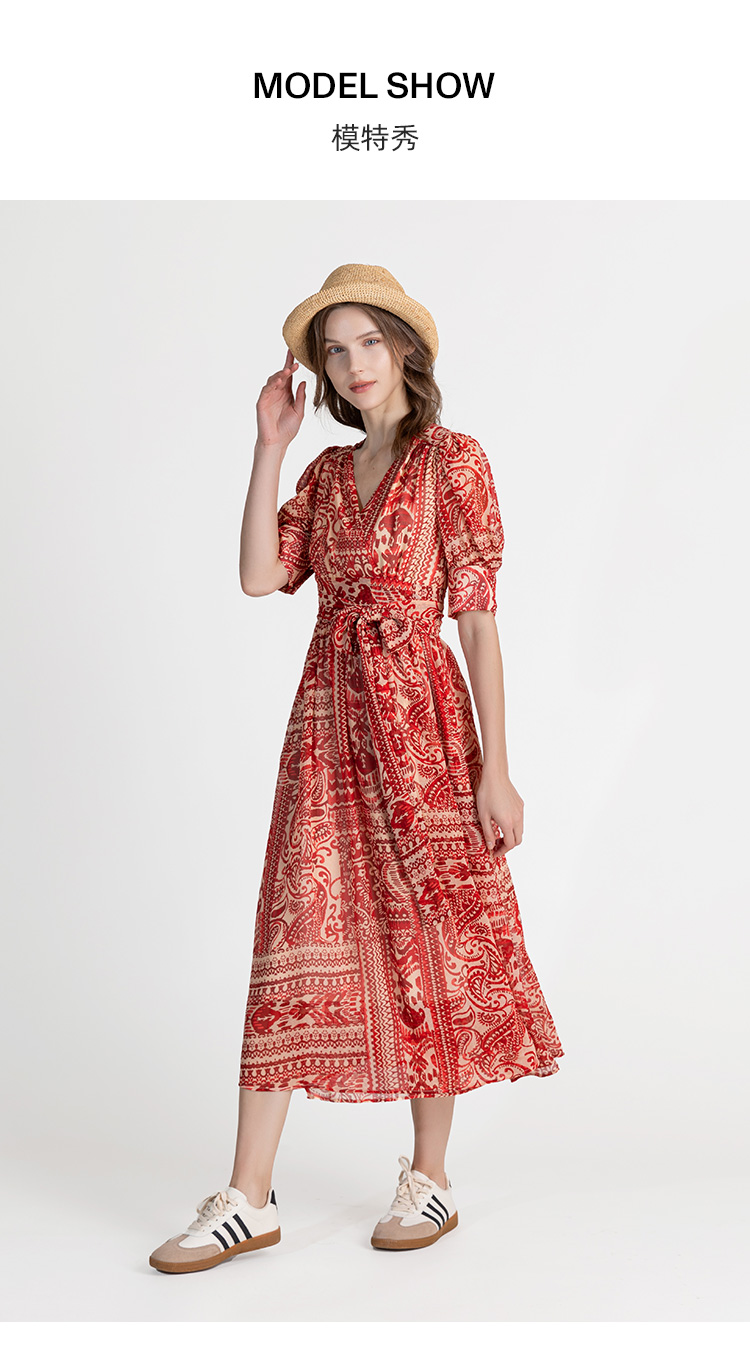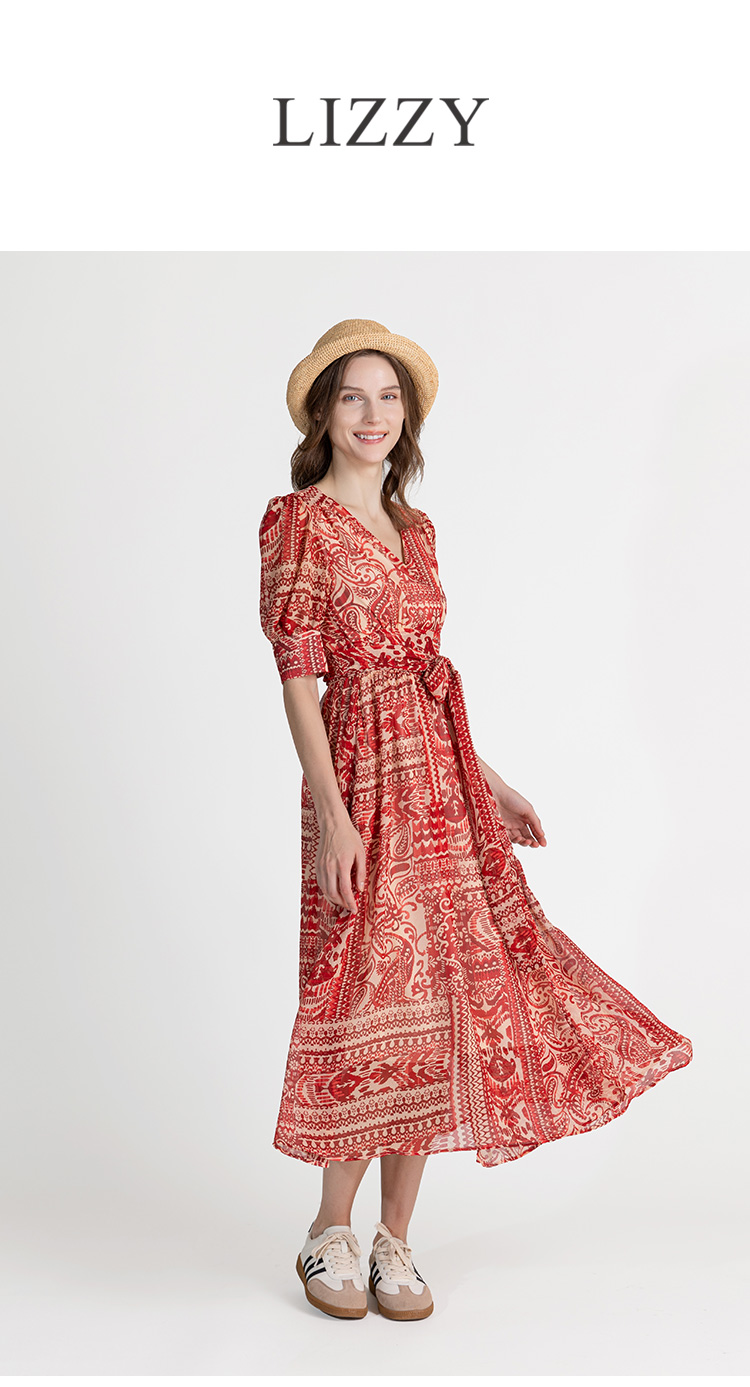 LIZZY优雅法式时尚V领裹身裙印花雪纺一片式度假连衣裙8071