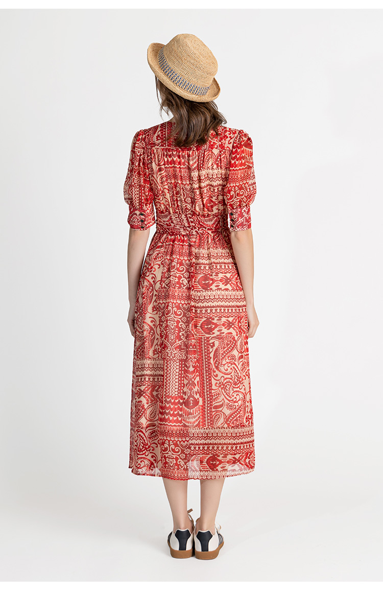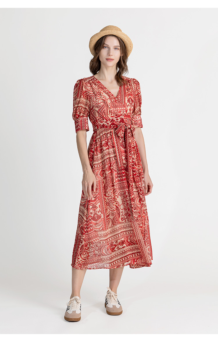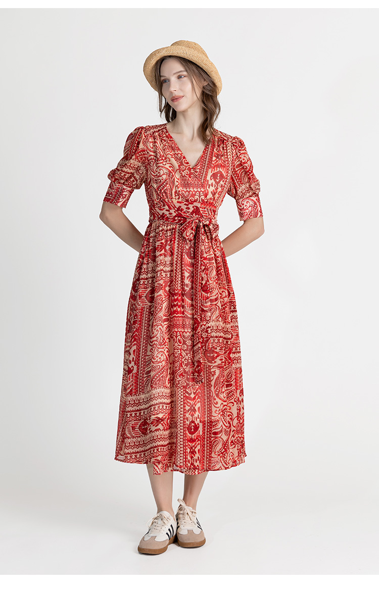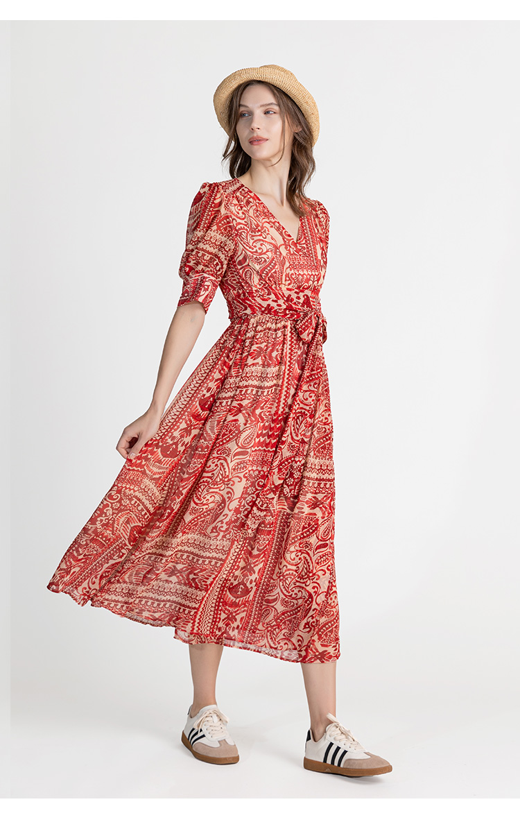 LIZZY优雅法式时尚V领裹身裙印花雪纺一片式度假连衣裙8071