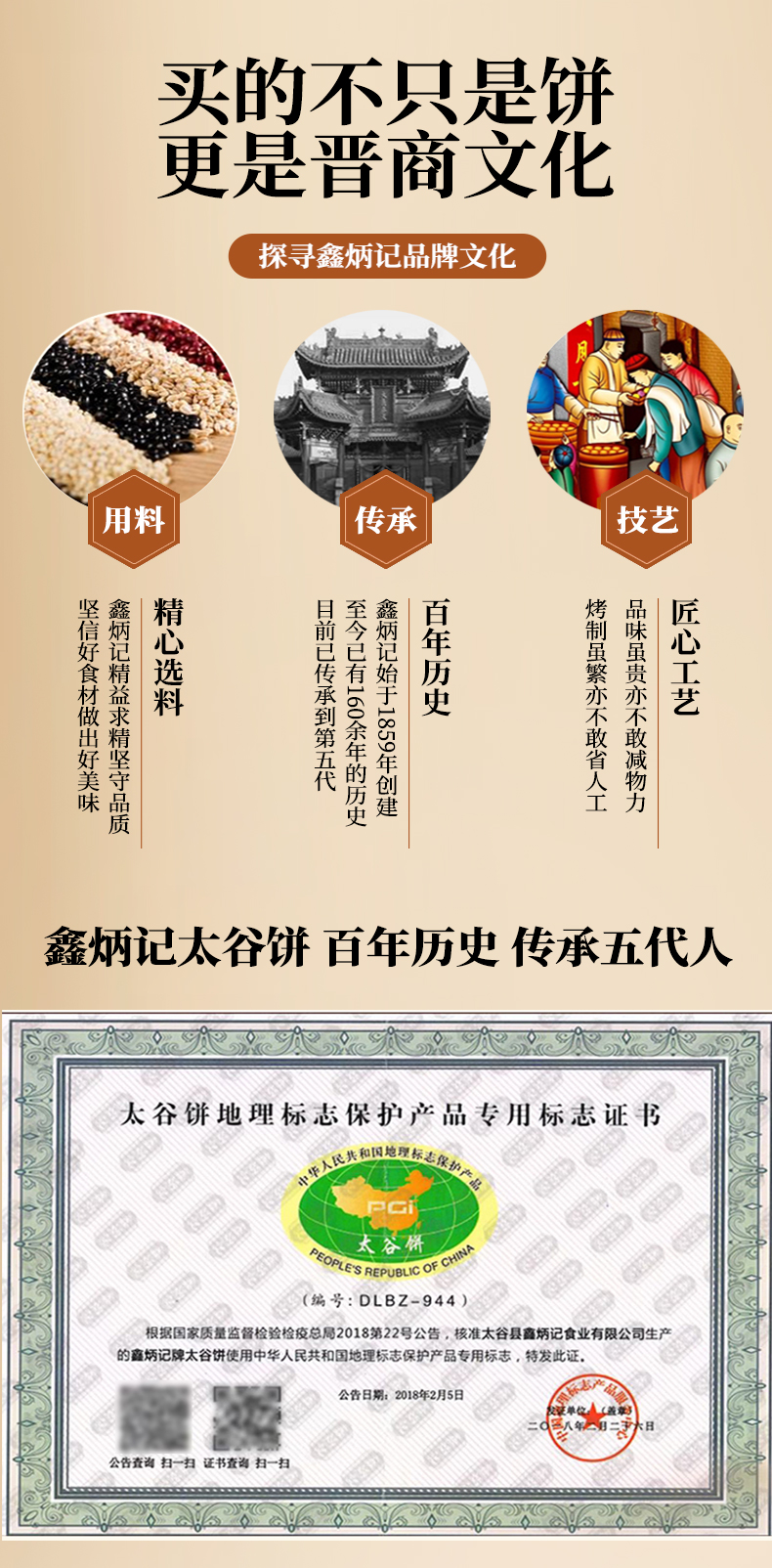 鑫炳记始于1859年,历经五代传承,传承百年工艺,从选取原料到烘烤出炉,都严格遵守祖传古方,让百年太谷饼焕发新的魅力。