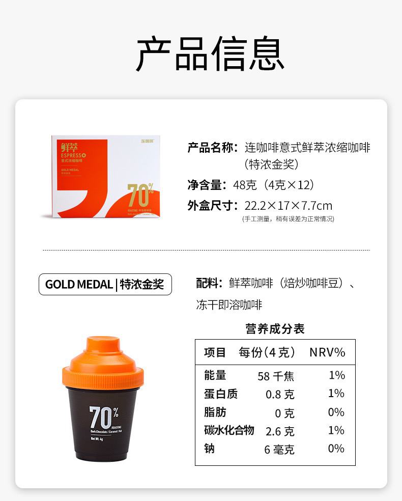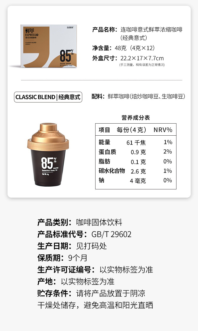 连咖啡鲜萃意式浓缩纯咖啡12杯