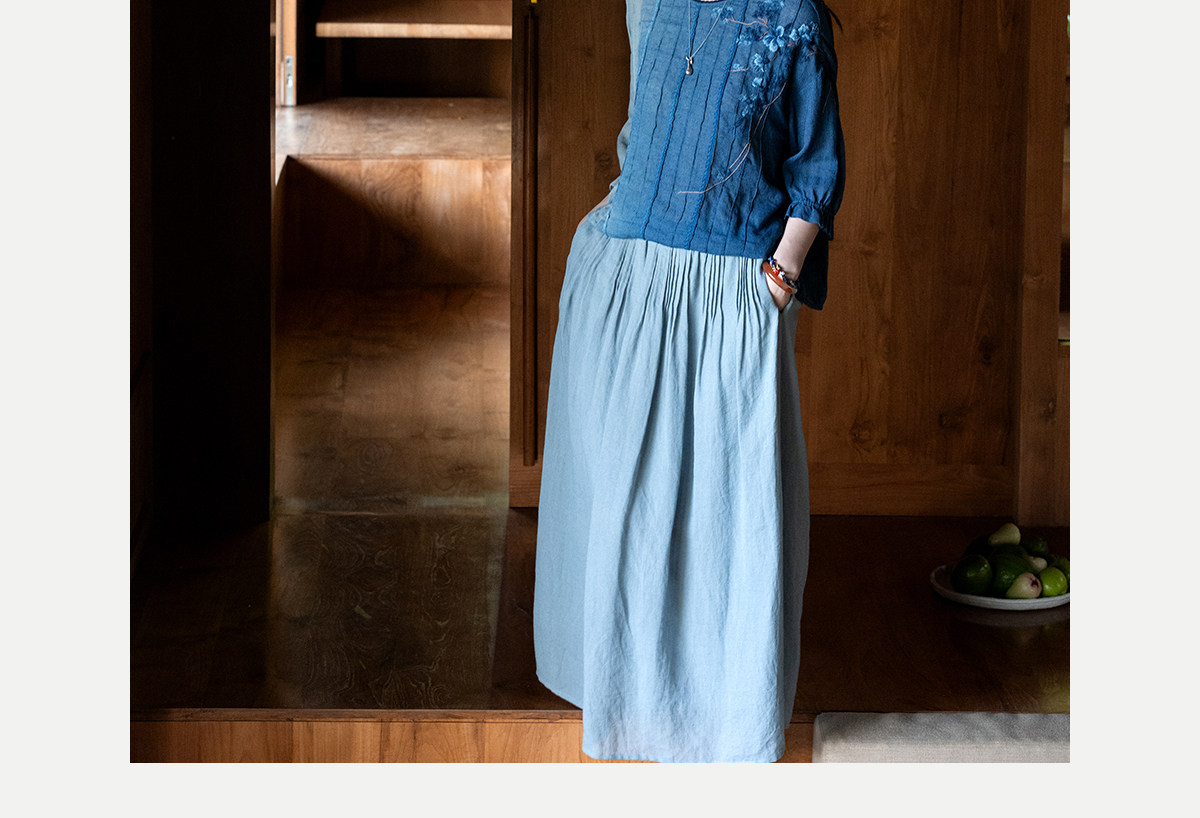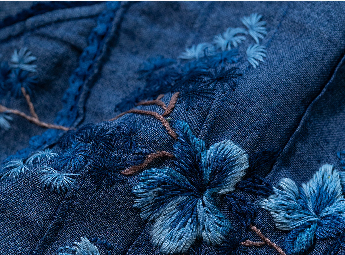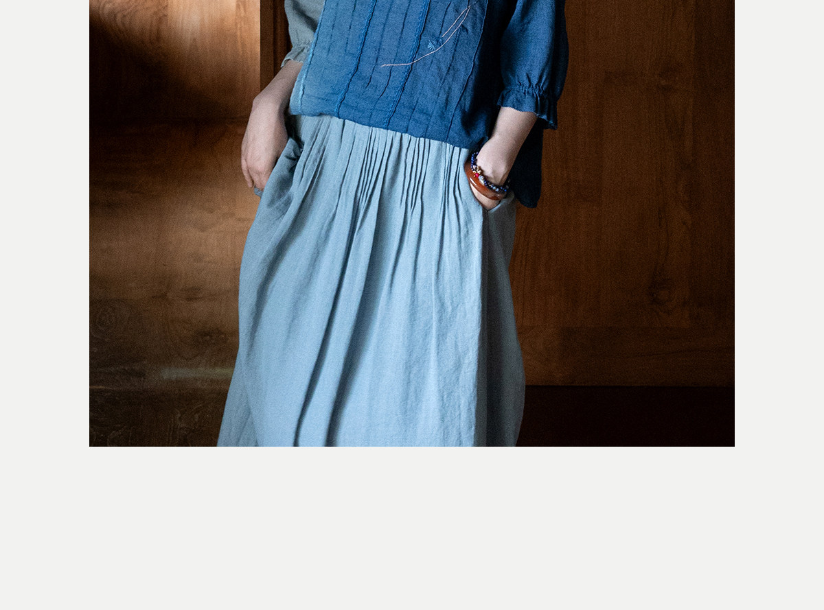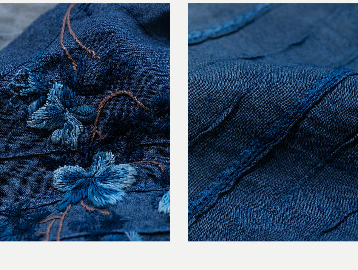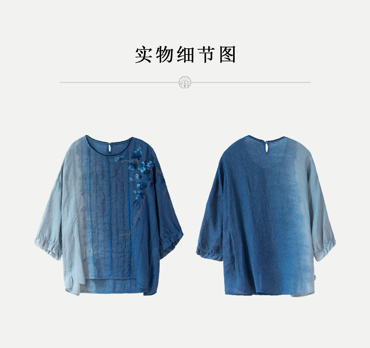艺术家联名款 牧衣游原创吊蓝染亚麻混纺刺绣小衫文艺上衣 桃逸