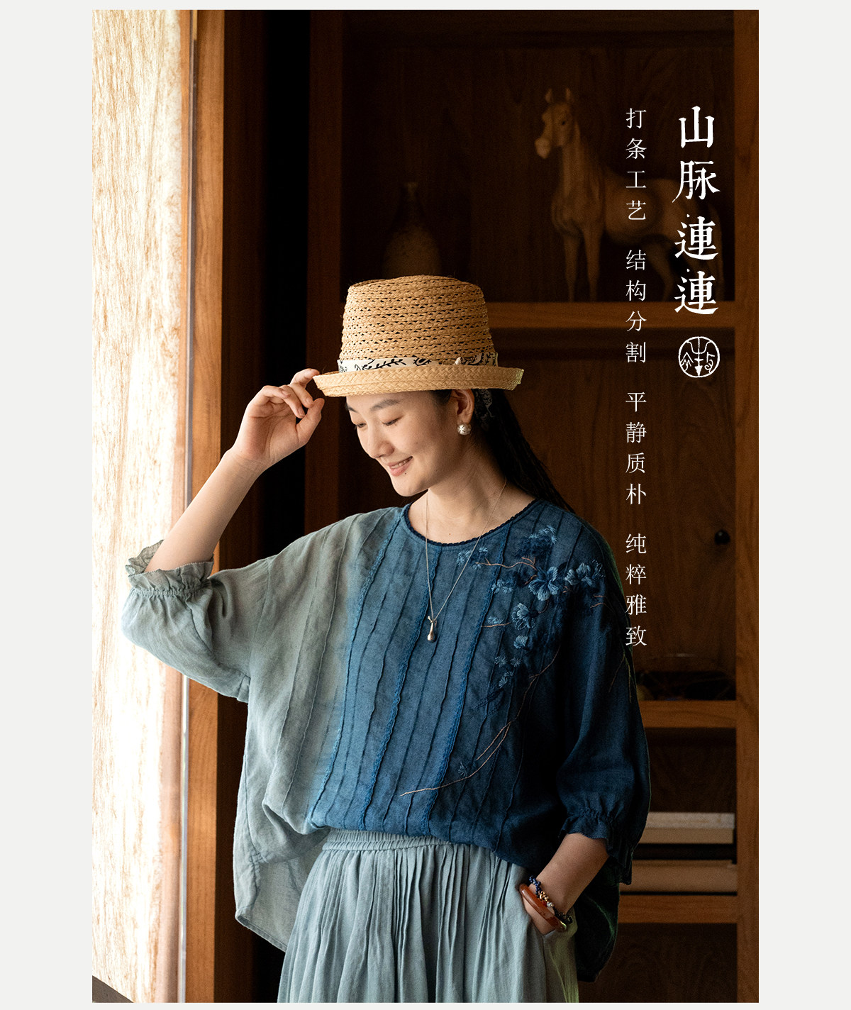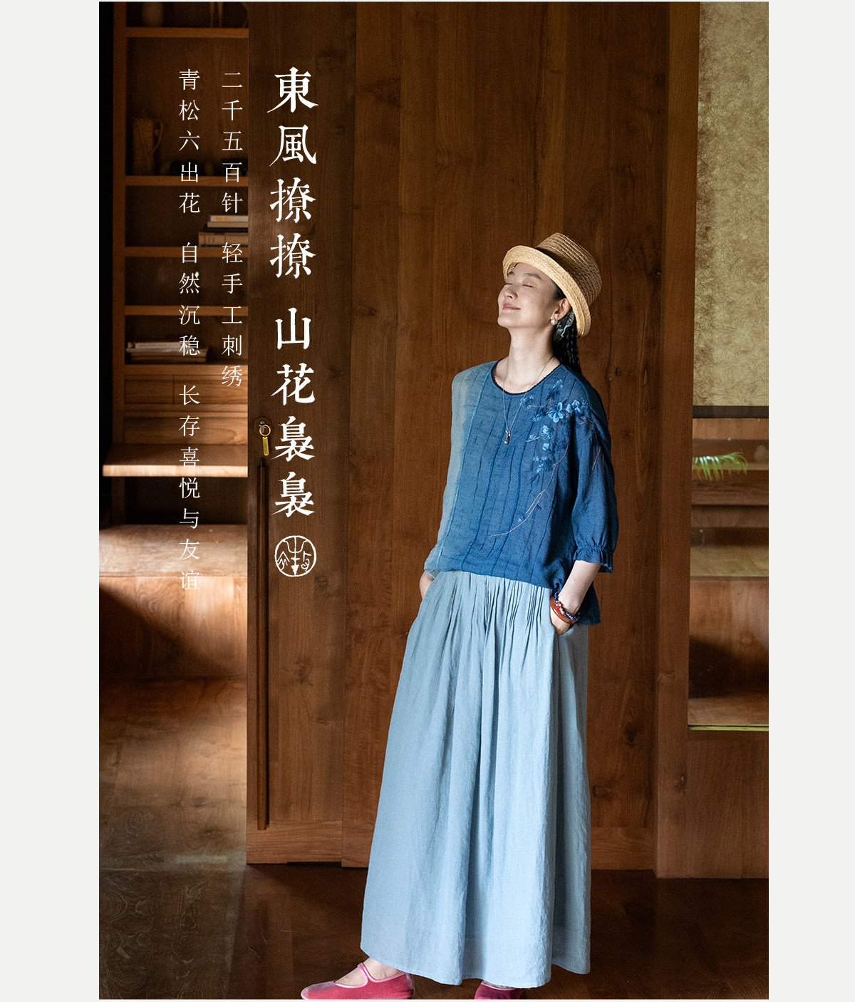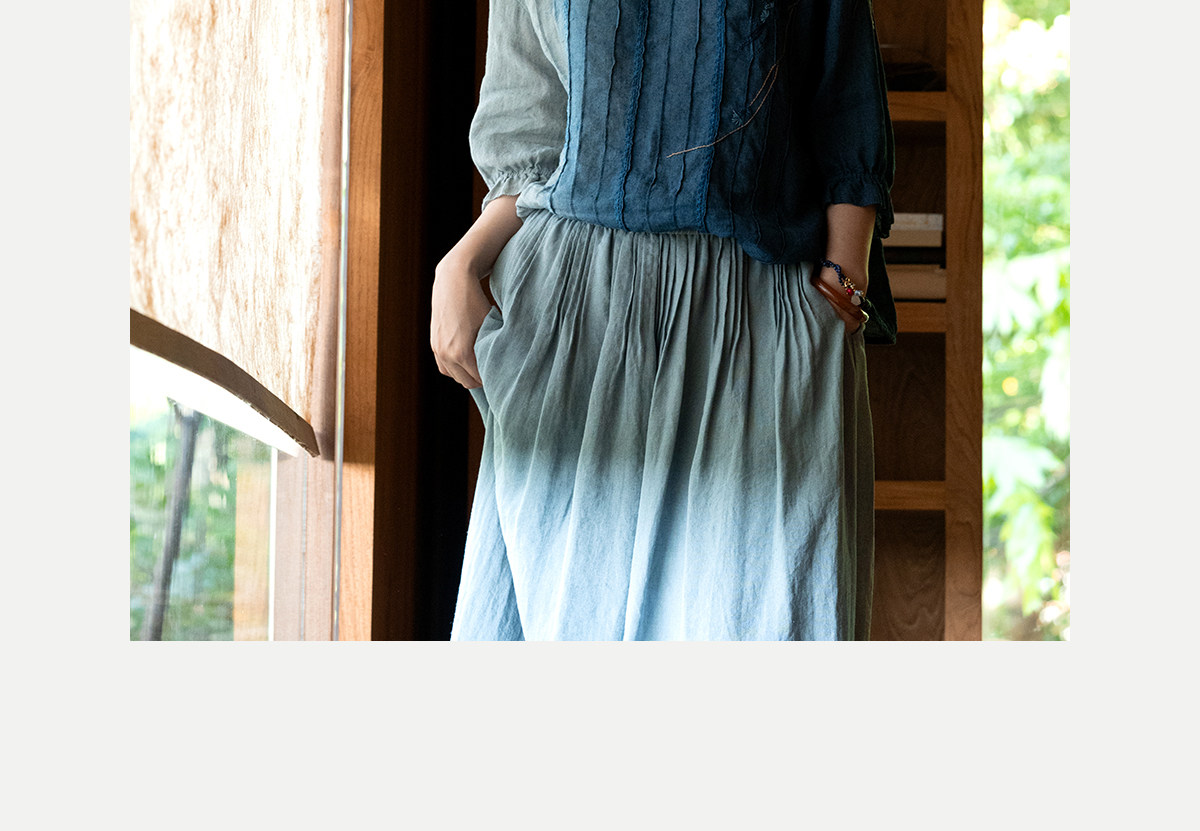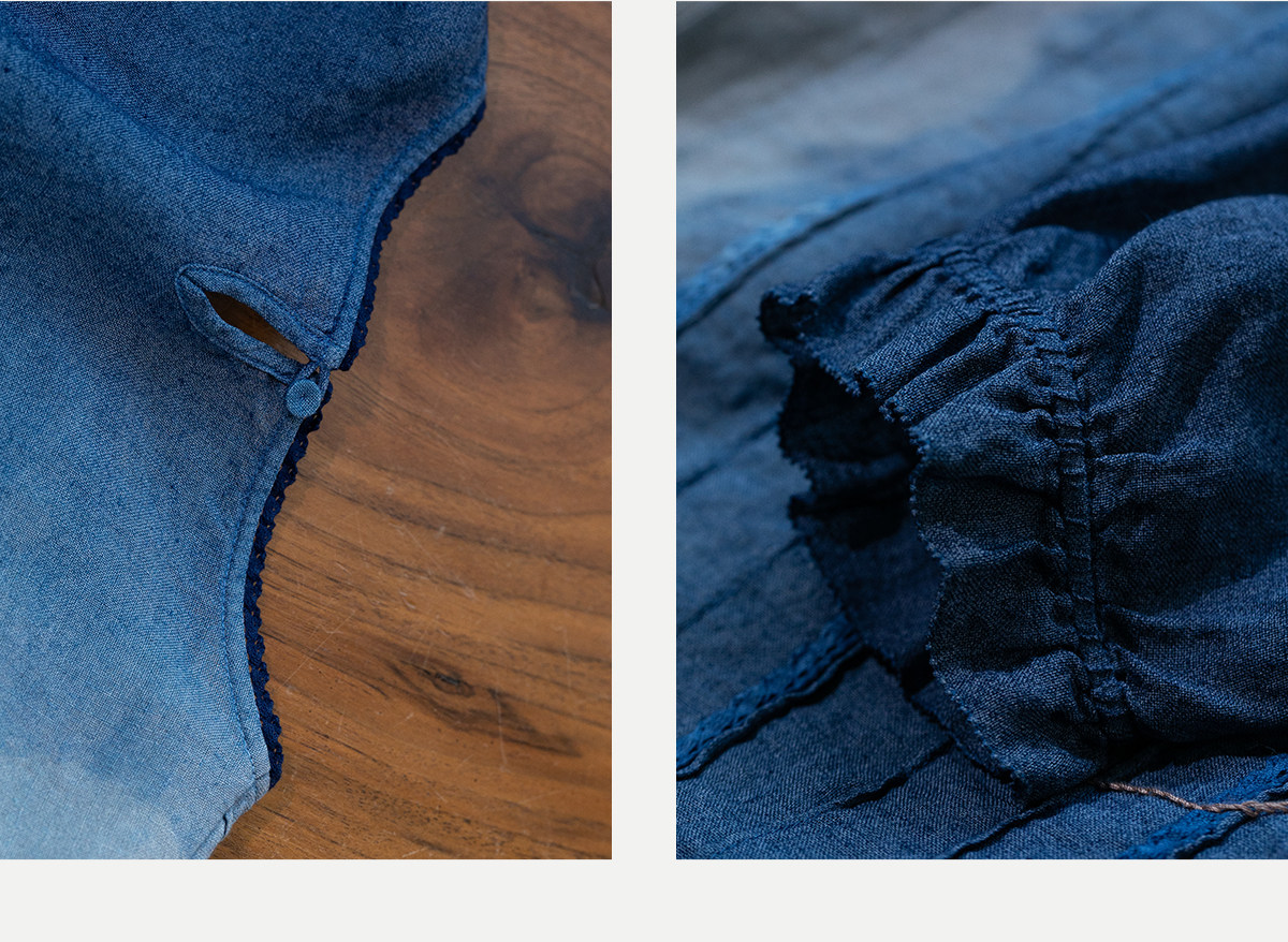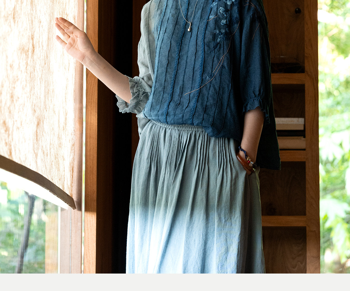 艺术家联名款 牧衣游原创吊蓝染亚麻混纺刺绣小衫文艺上衣 桃逸