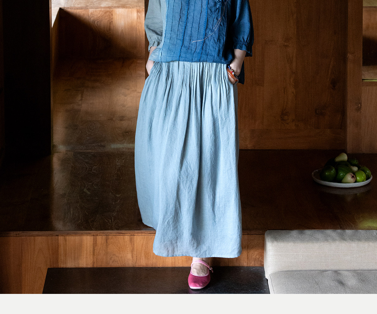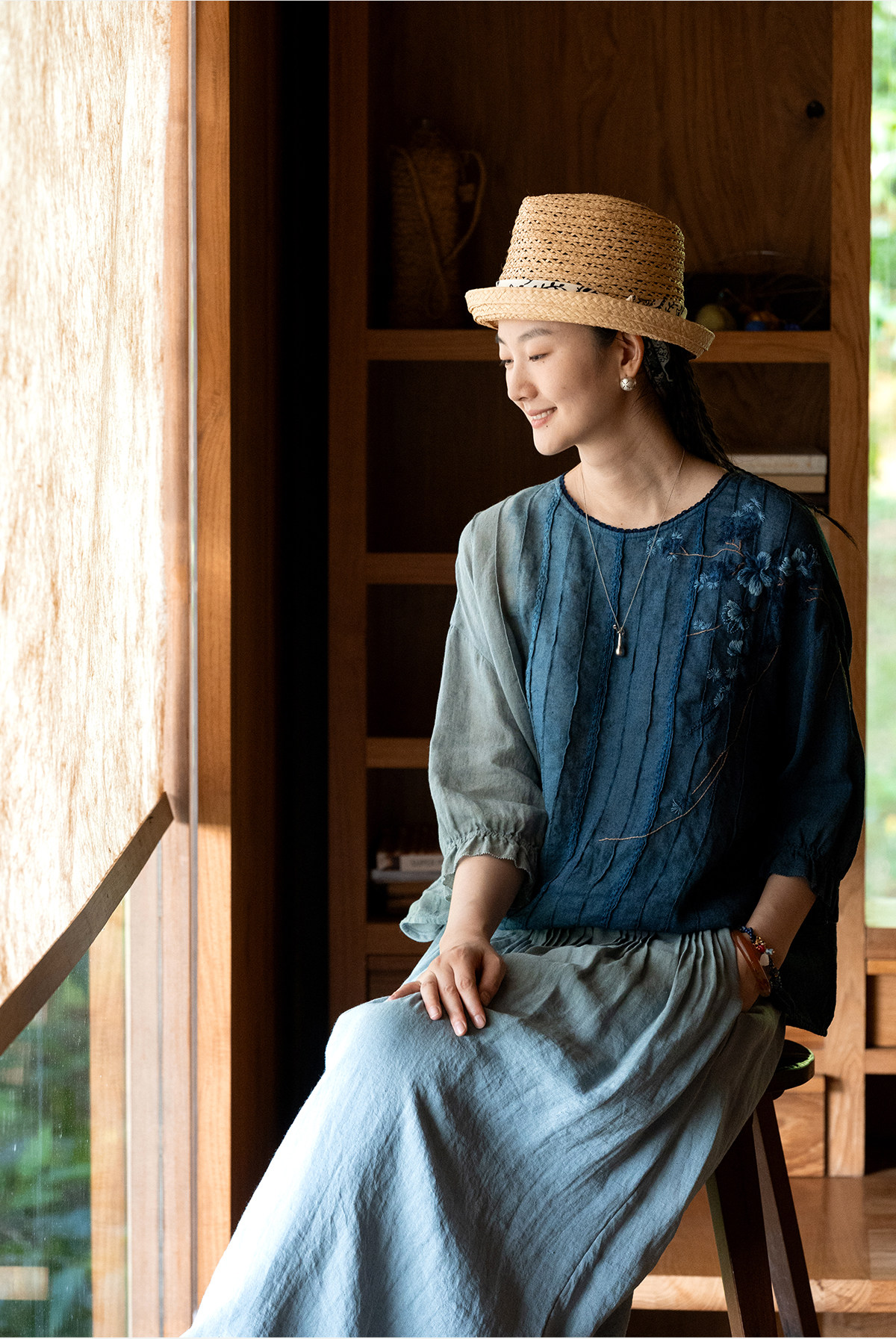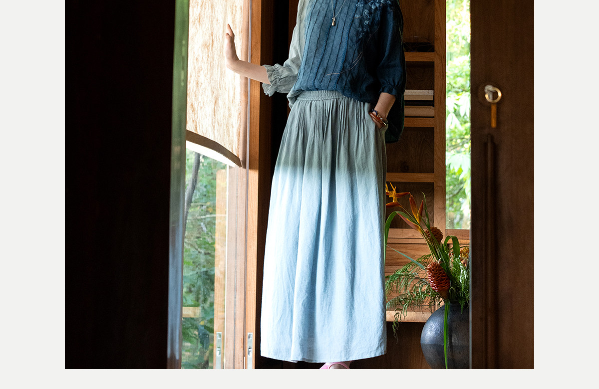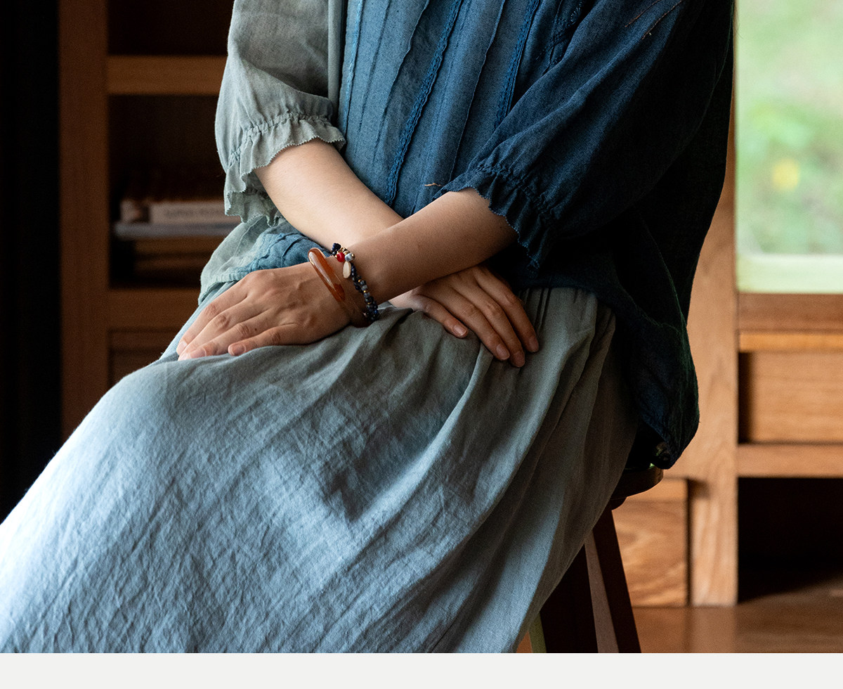 艺术家联名款 牧衣游原创吊蓝染亚麻混纺刺绣小衫文艺上衣 桃逸
