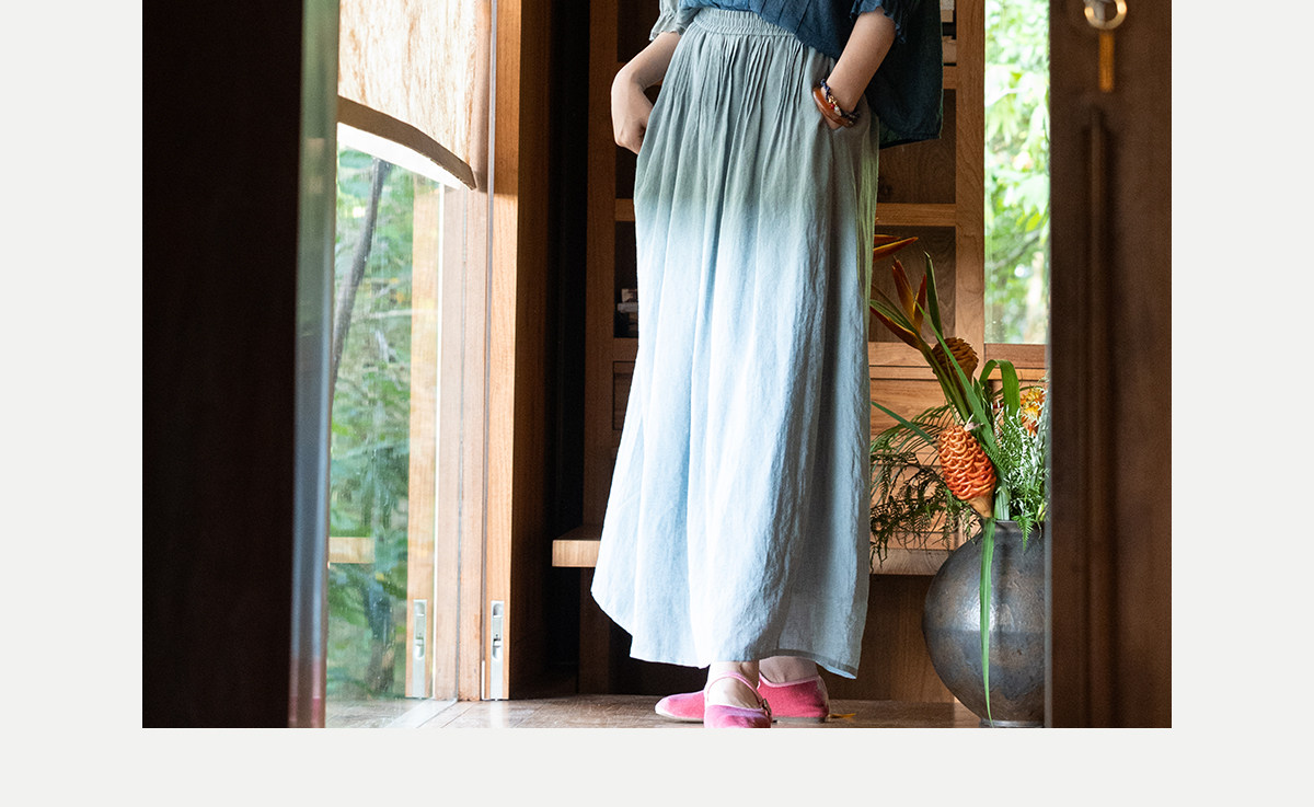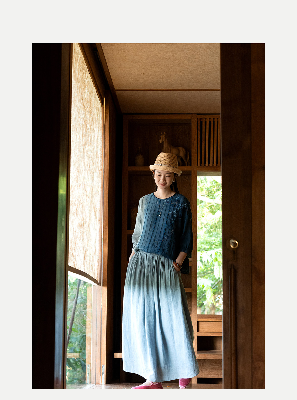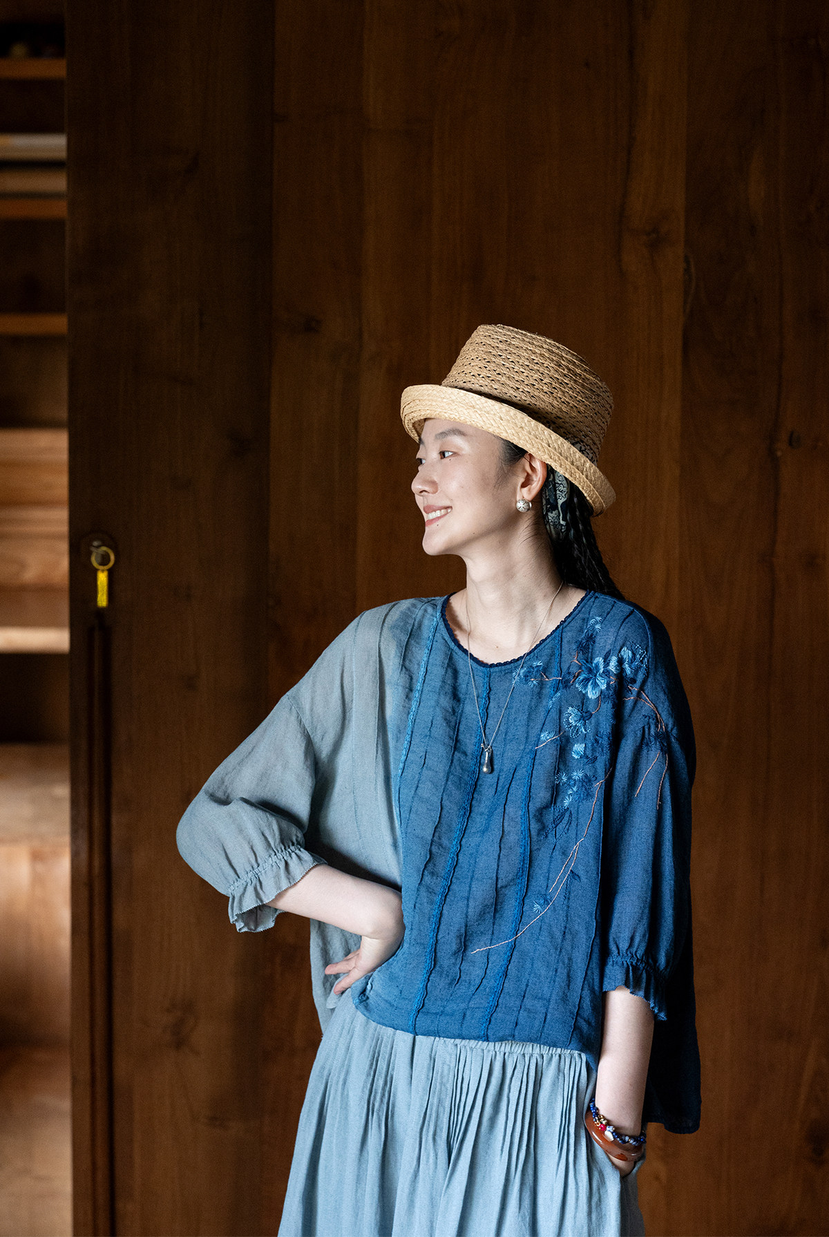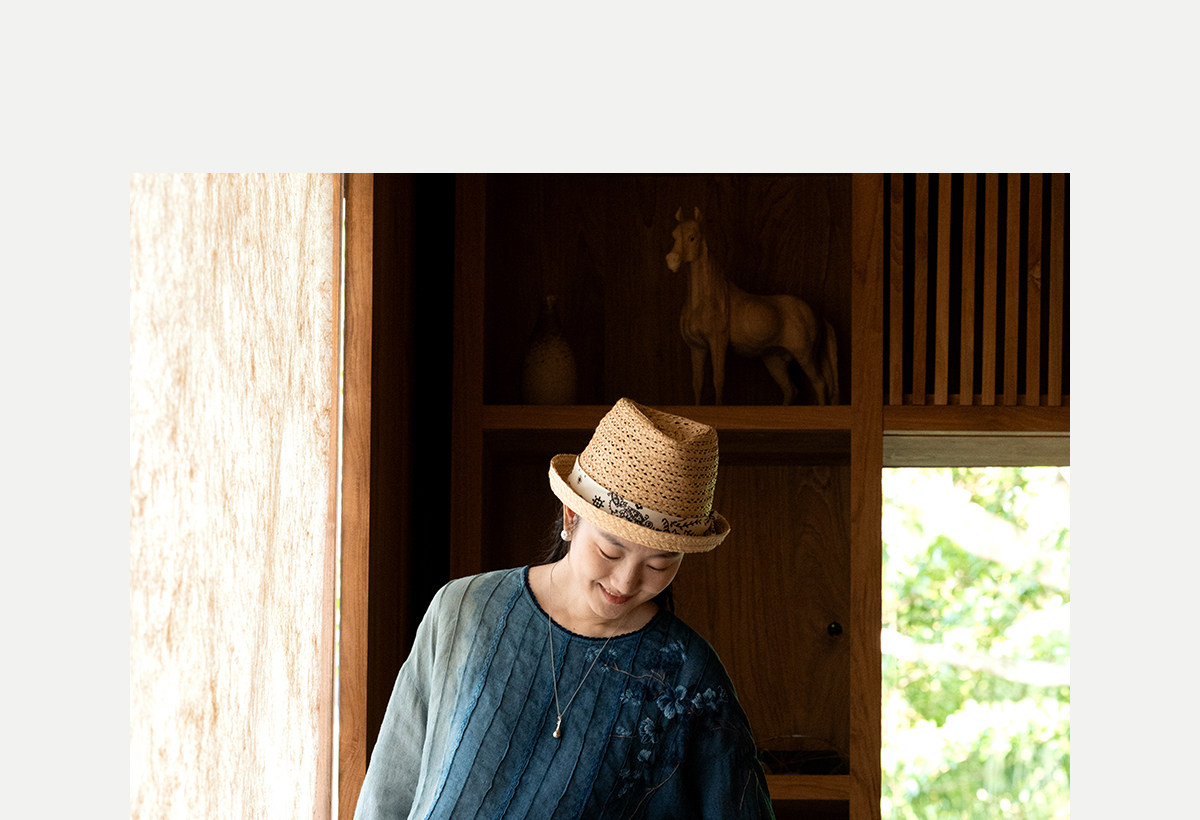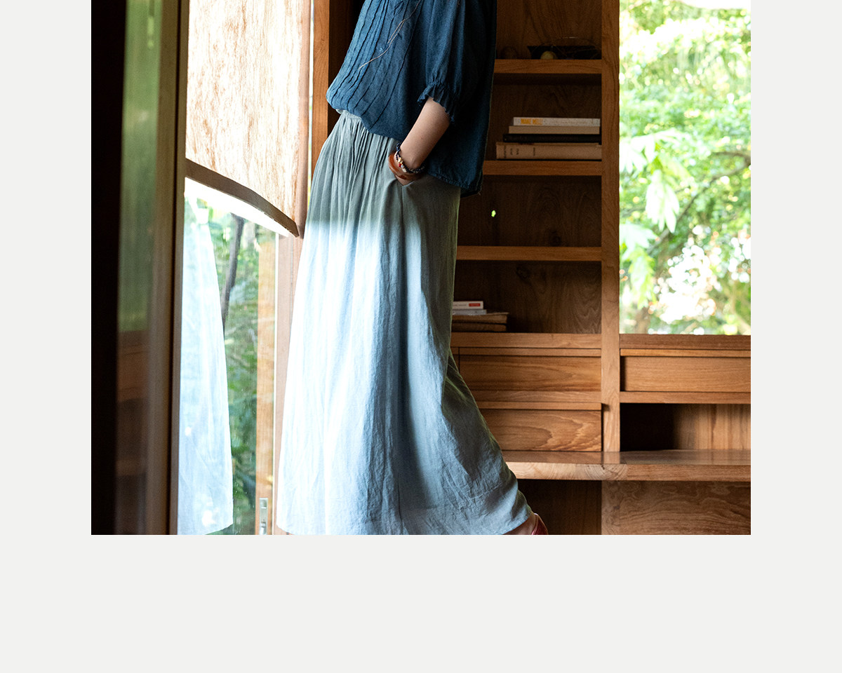 艺术家联名款 牧衣游原创吊蓝染亚麻混纺刺绣小衫文艺上衣 桃逸