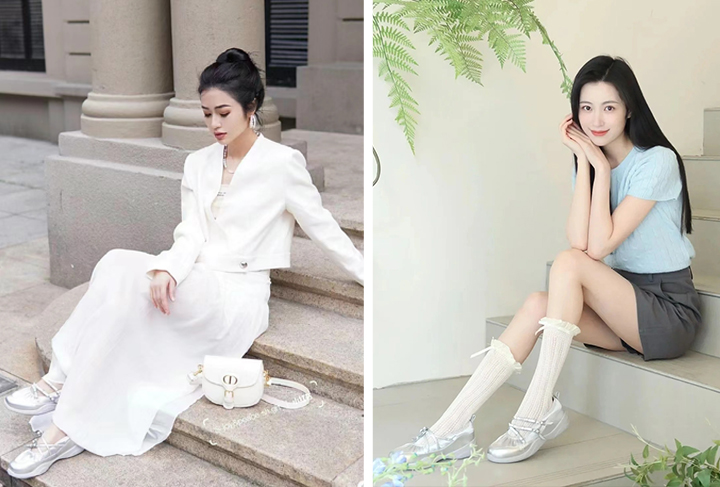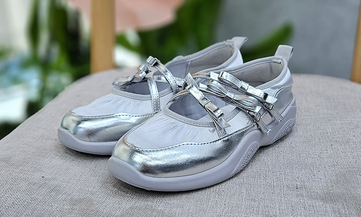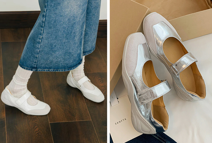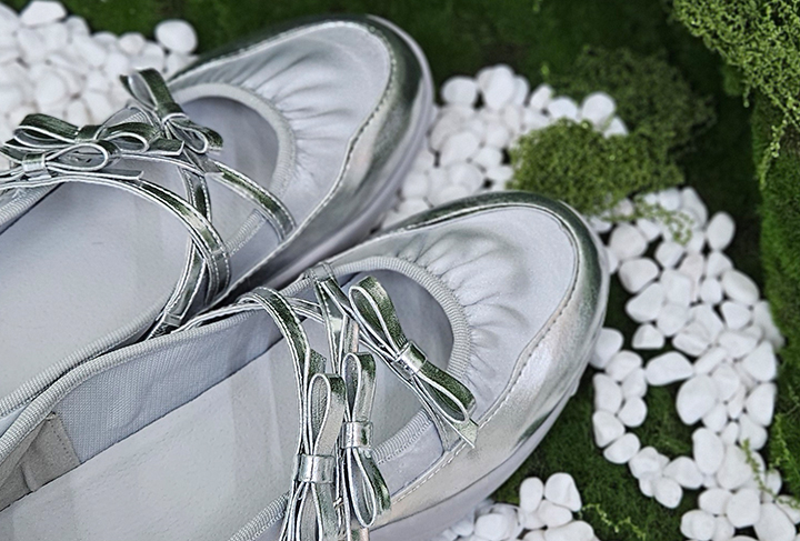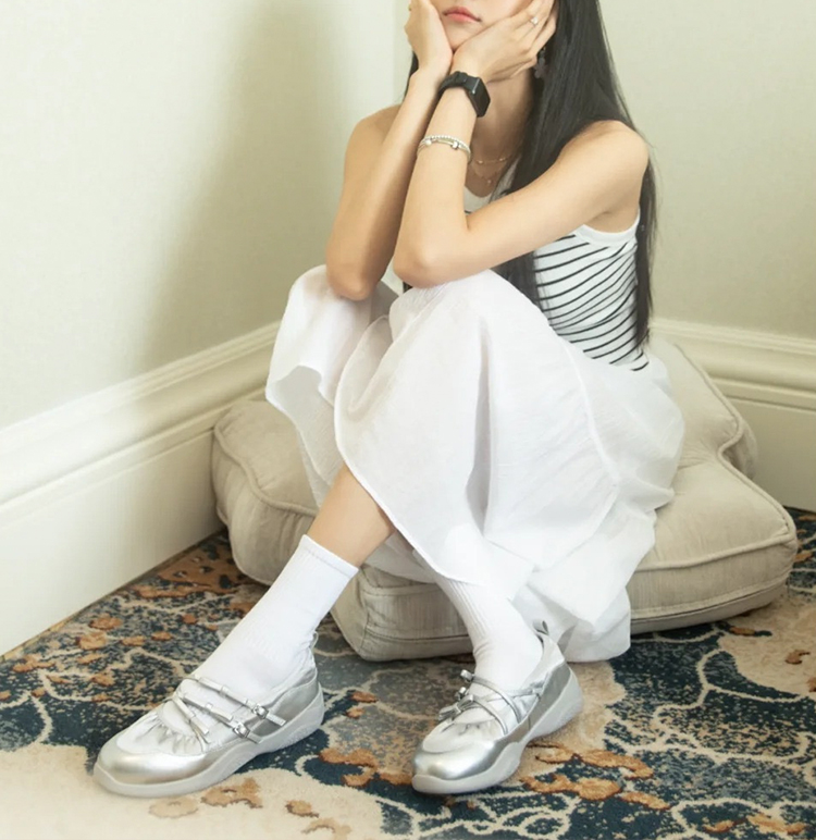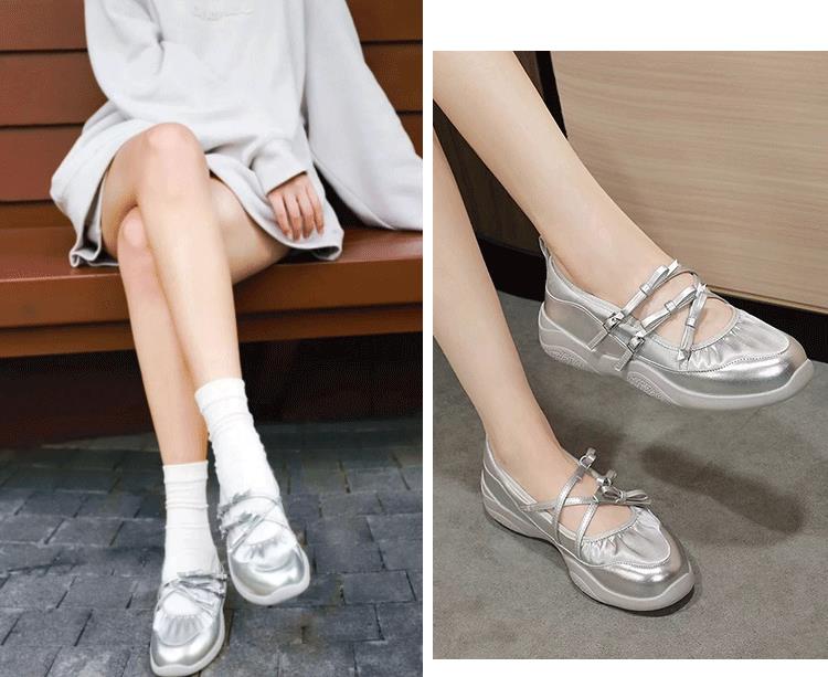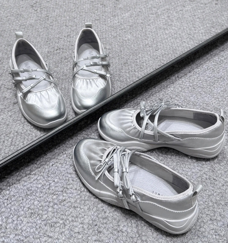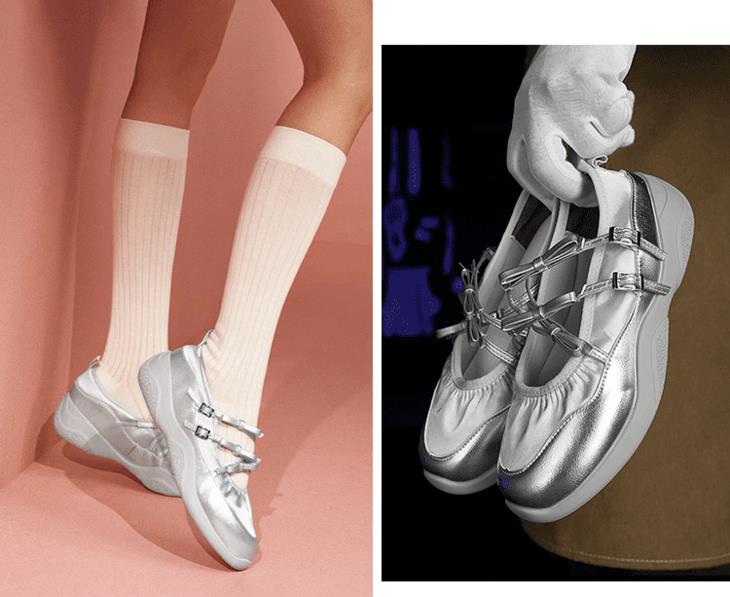 银色亮眼又时髦,贝壳头运动鞋融入玛丽珍鞋设计,叠加可爱蝴蝶结,真是集美貌与松弛感于一身。