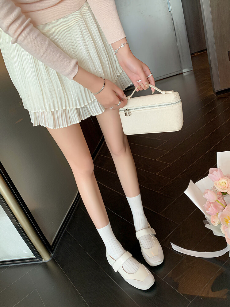 一字芭蕾舞鞋则在鞋头处,与牛磨砂皮拼接,不仅时髦,而且还能护住脚指头,有时候走路不小心踢到硬物也不容易受伤。