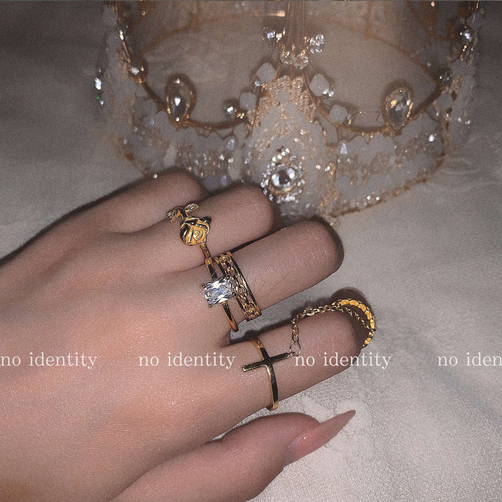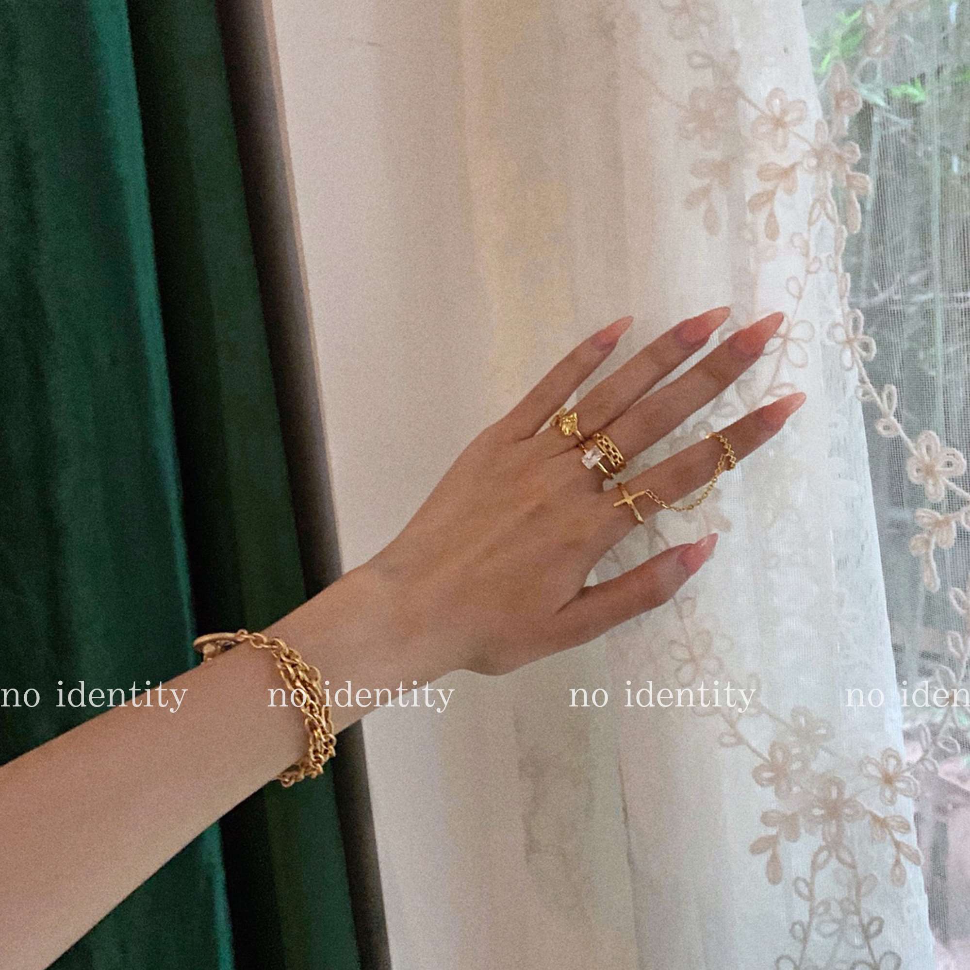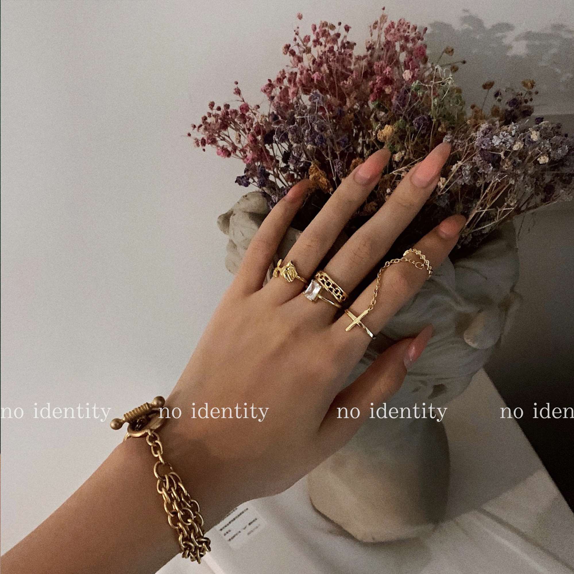 no identity 独立设计925银十字架玫瑰欧美度假风链条关节戒指