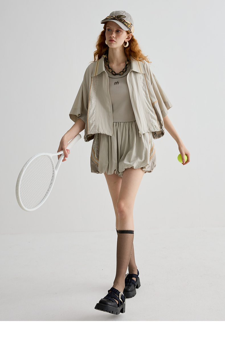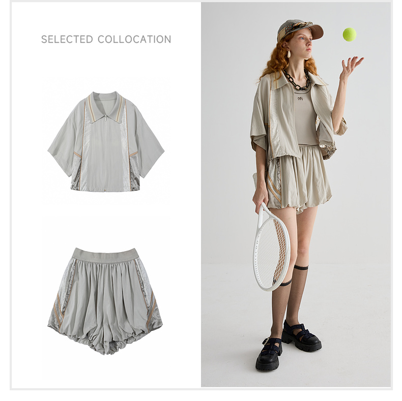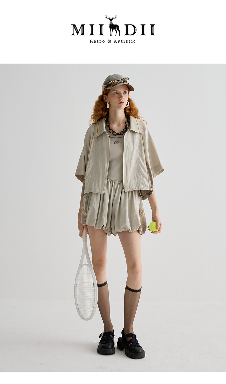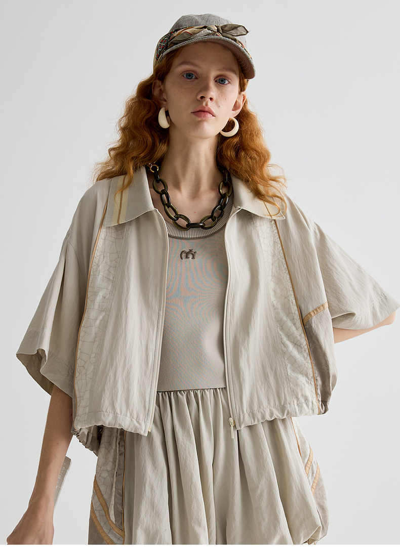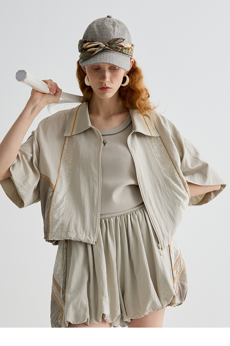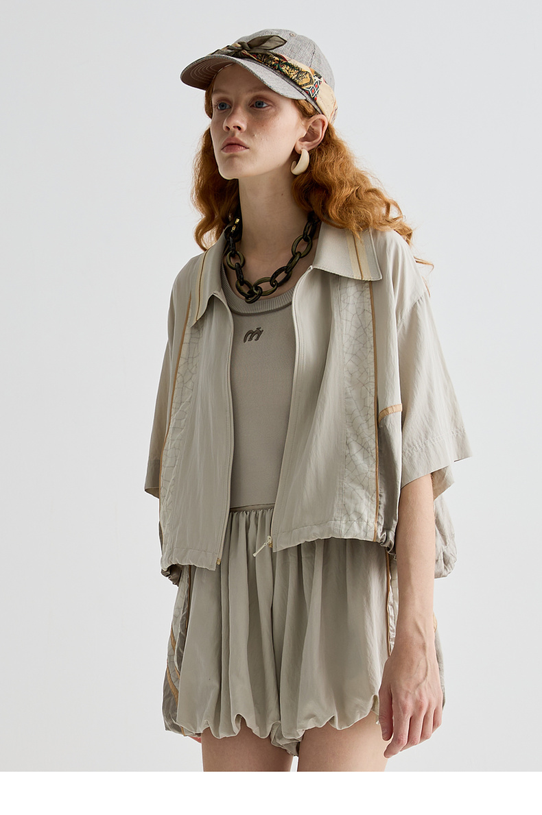 谜底外套短袖女2025夏季新品复古风拼接大廓形H型短外套252MW0608