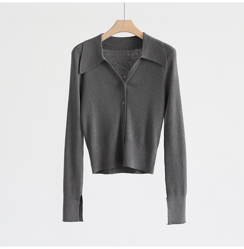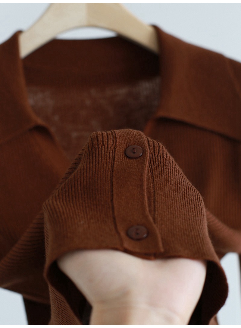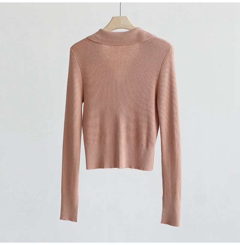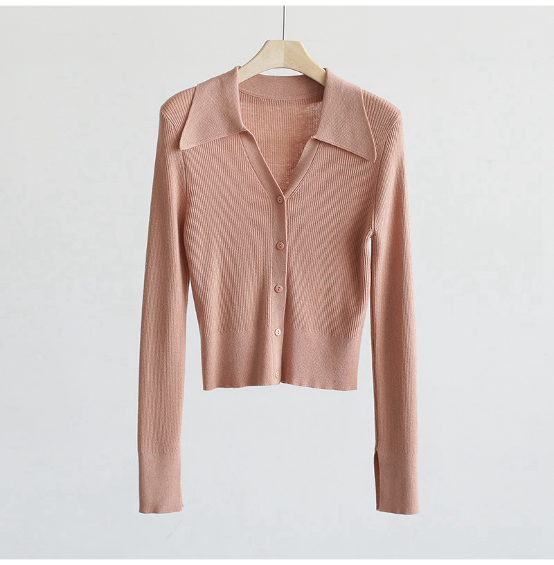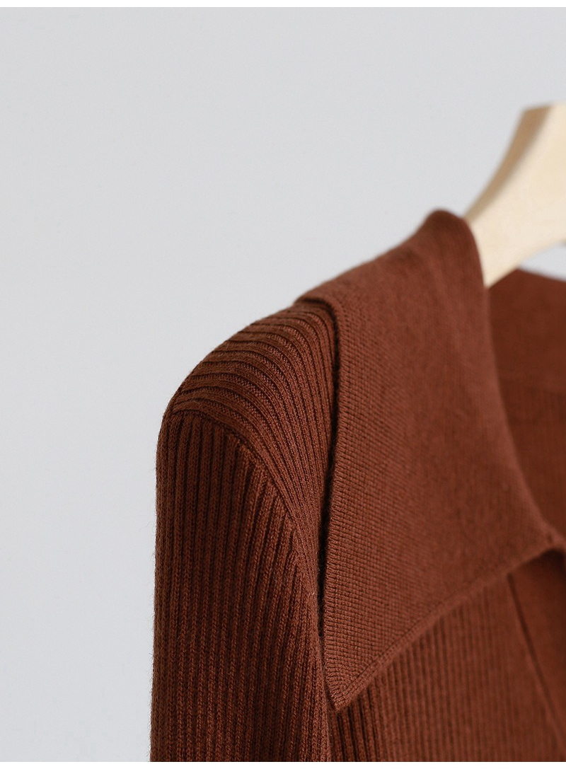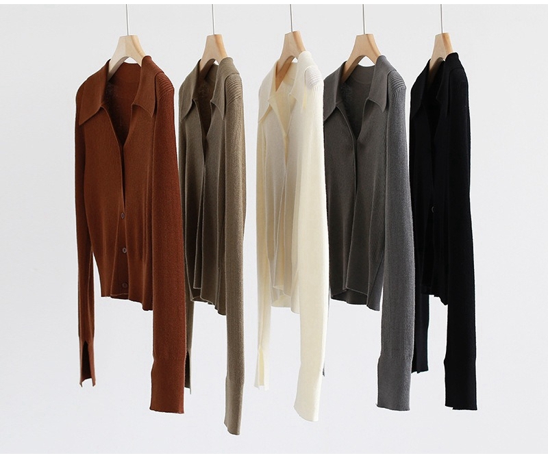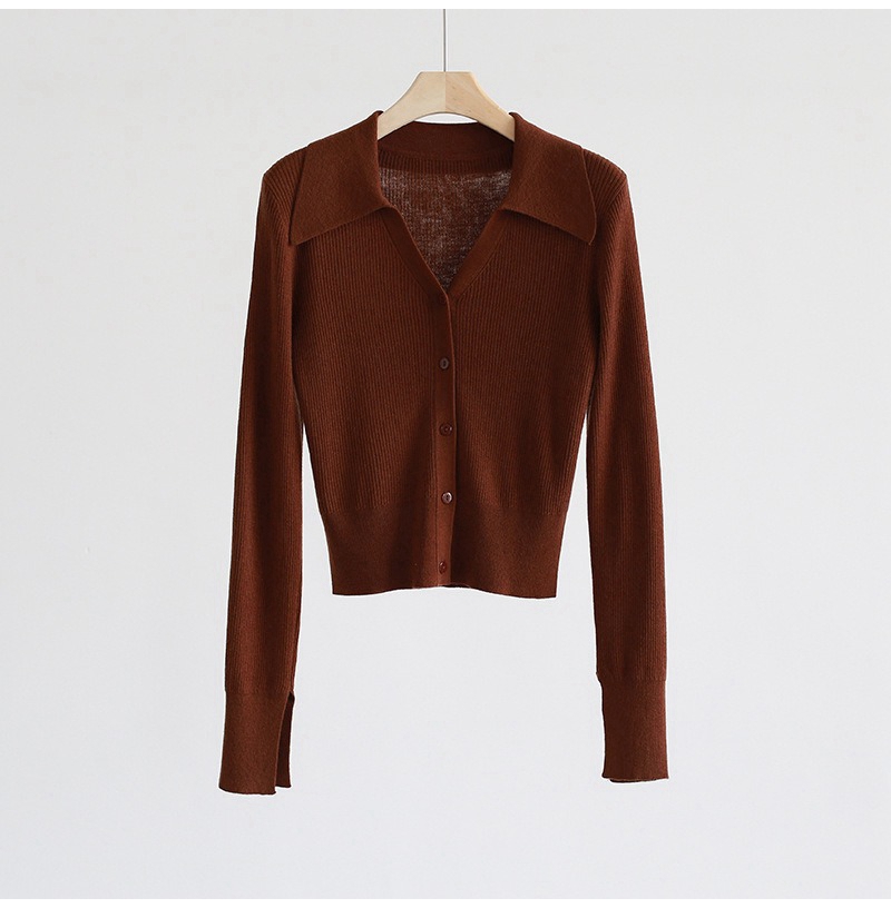 优雅法式翻领V领长袖单排扣针织开衫上衣