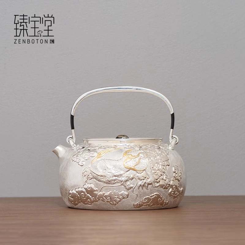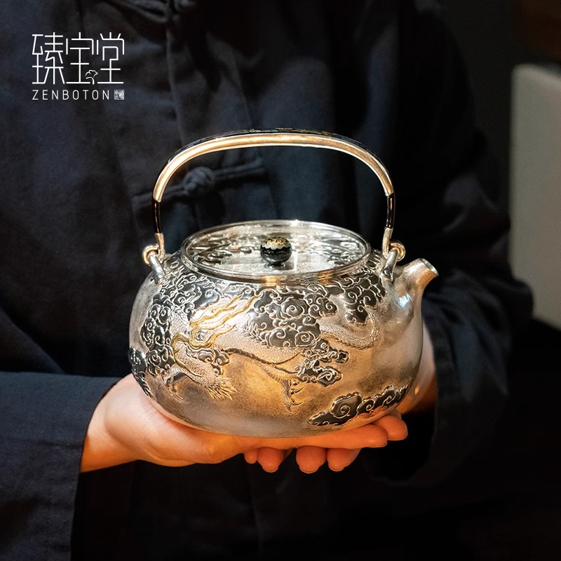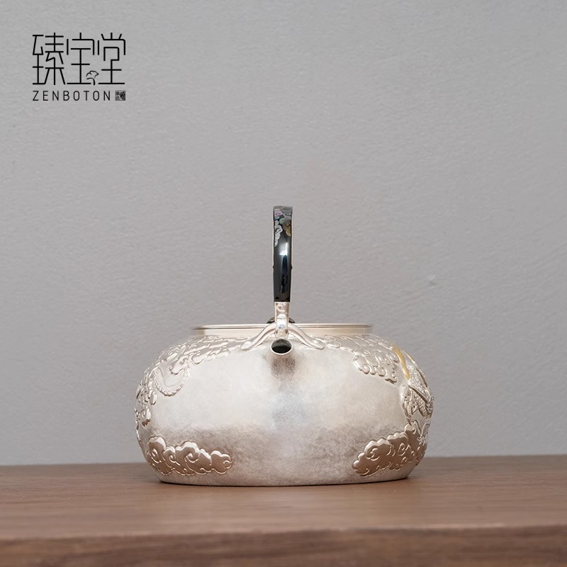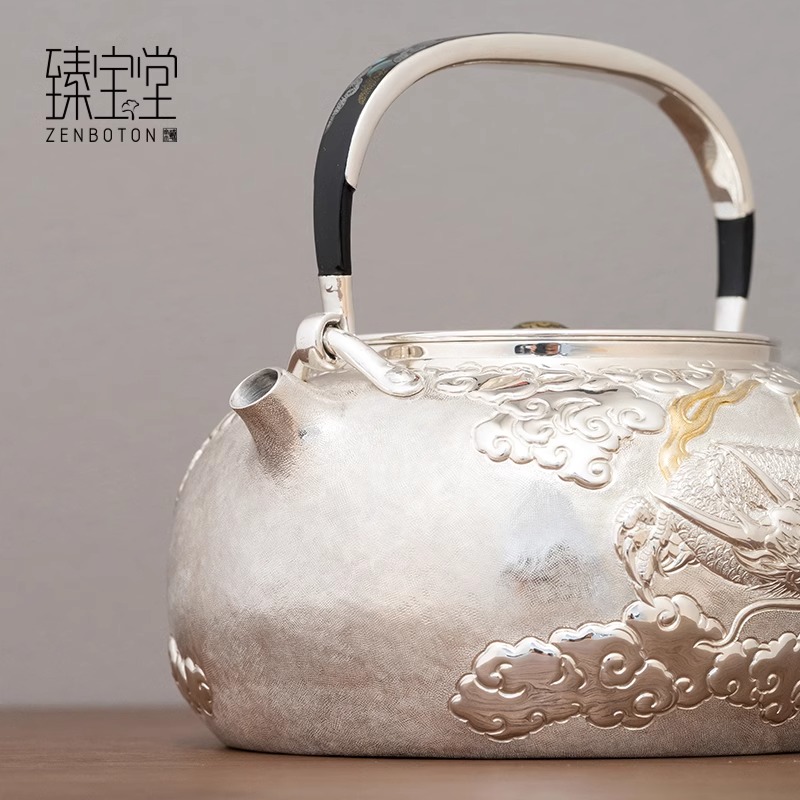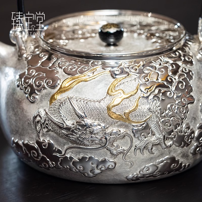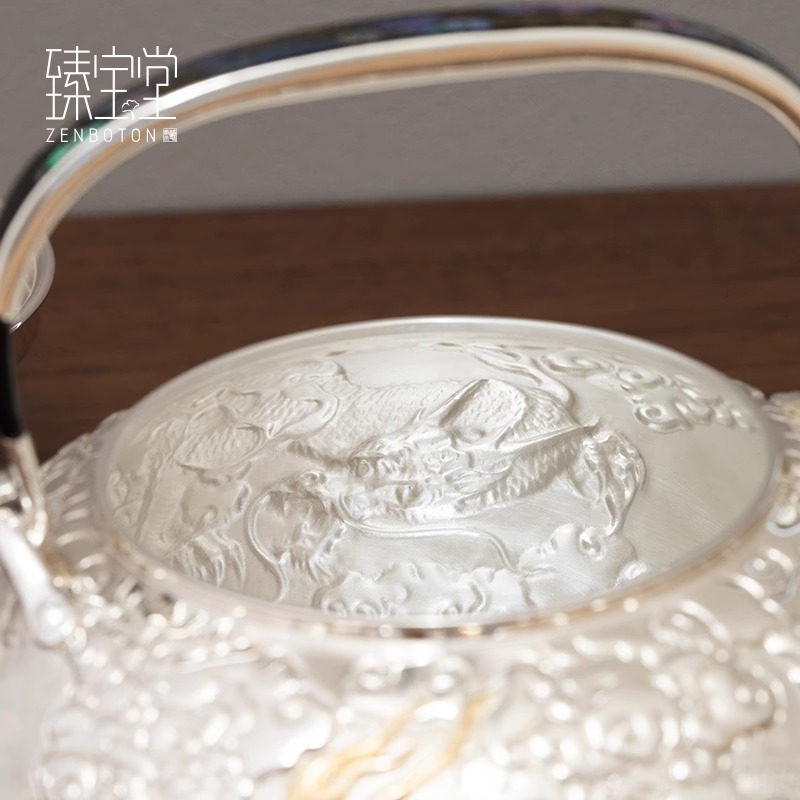 臻宝堂银壶999纯银烧水壶足银纯手工一张打游龙煮茶壶高端银茶具