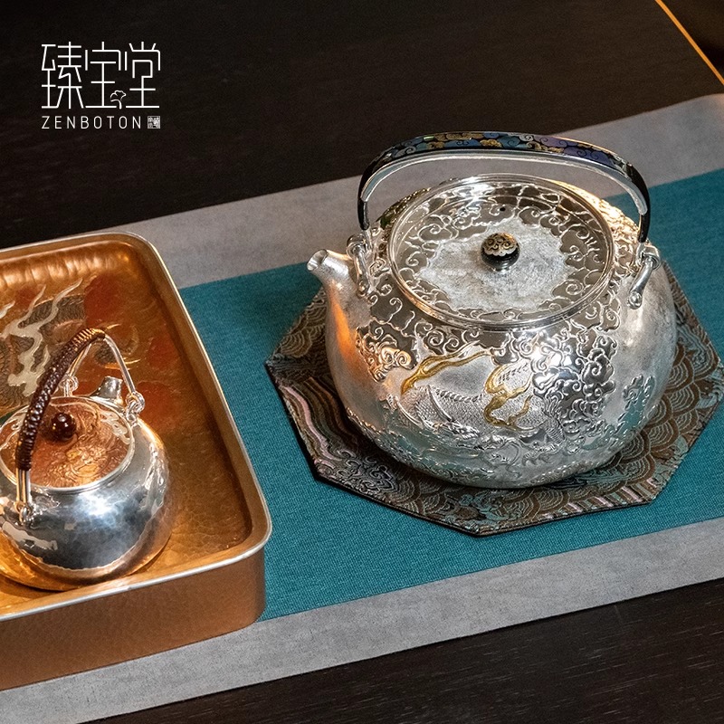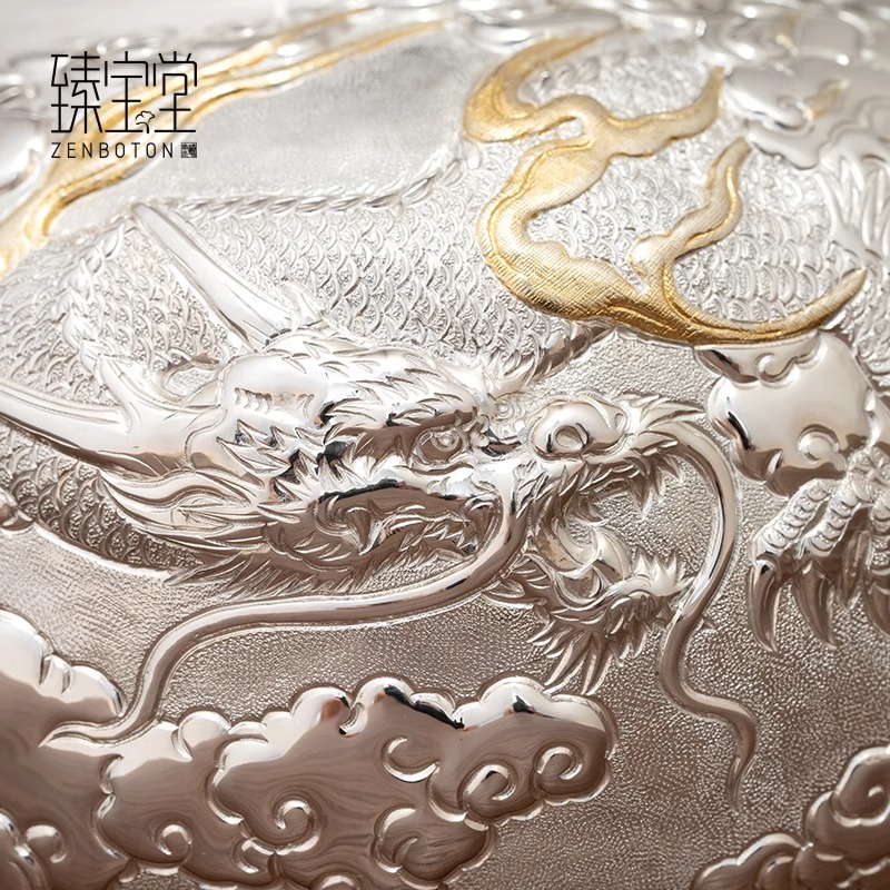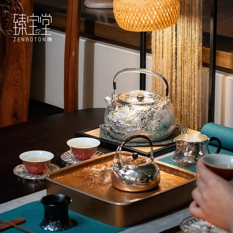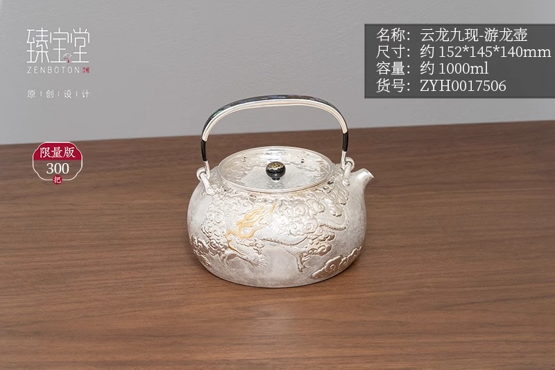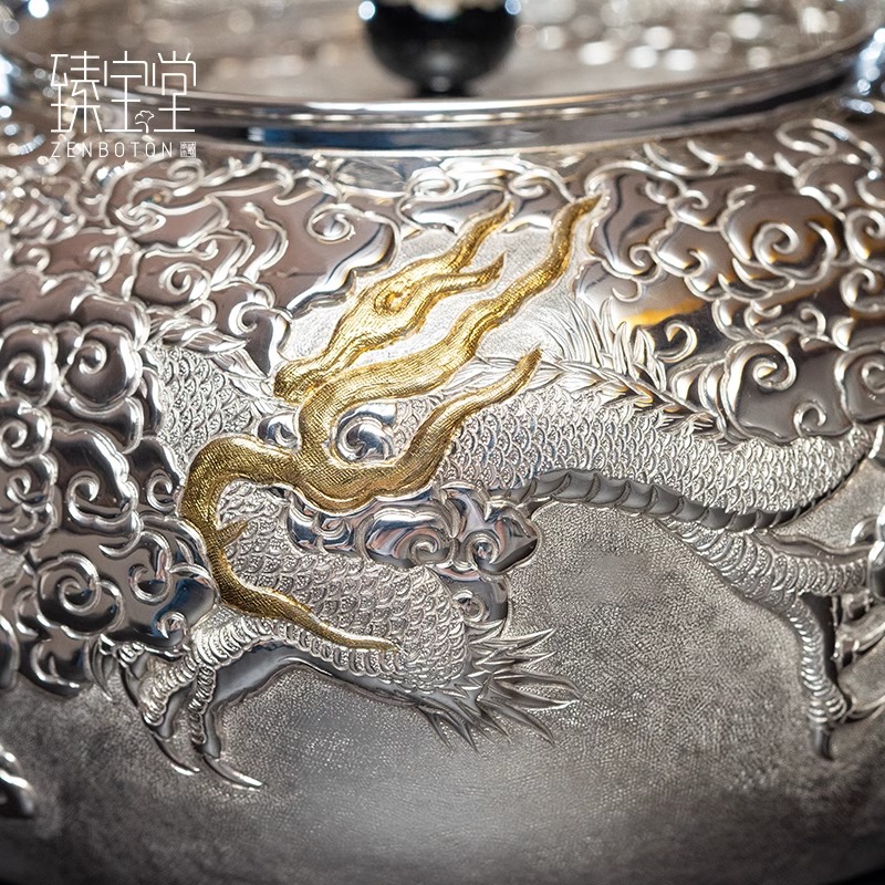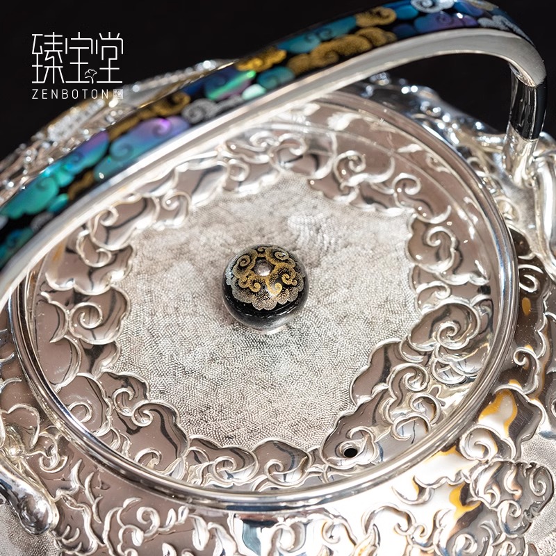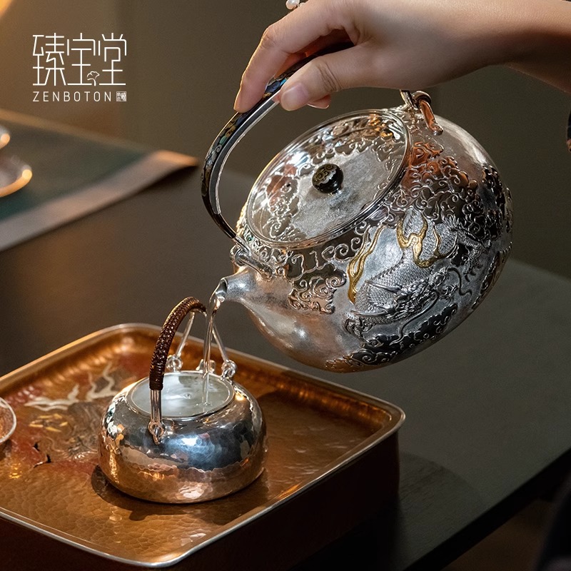 臻宝堂银壶999纯银烧水壶足银纯手工一张打游龙煮茶壶高端银茶具