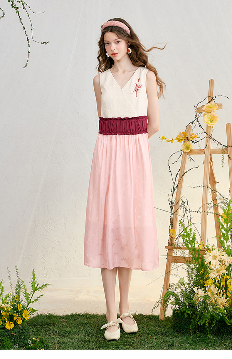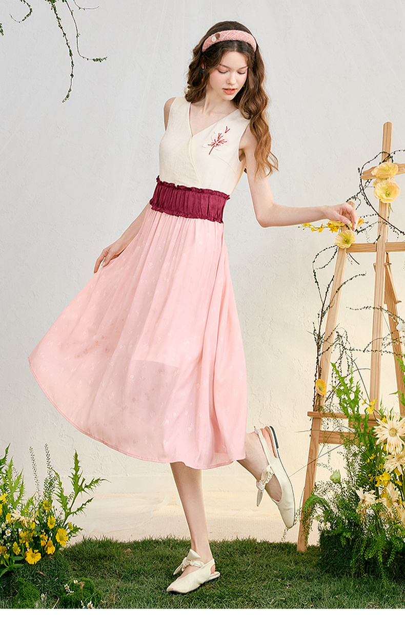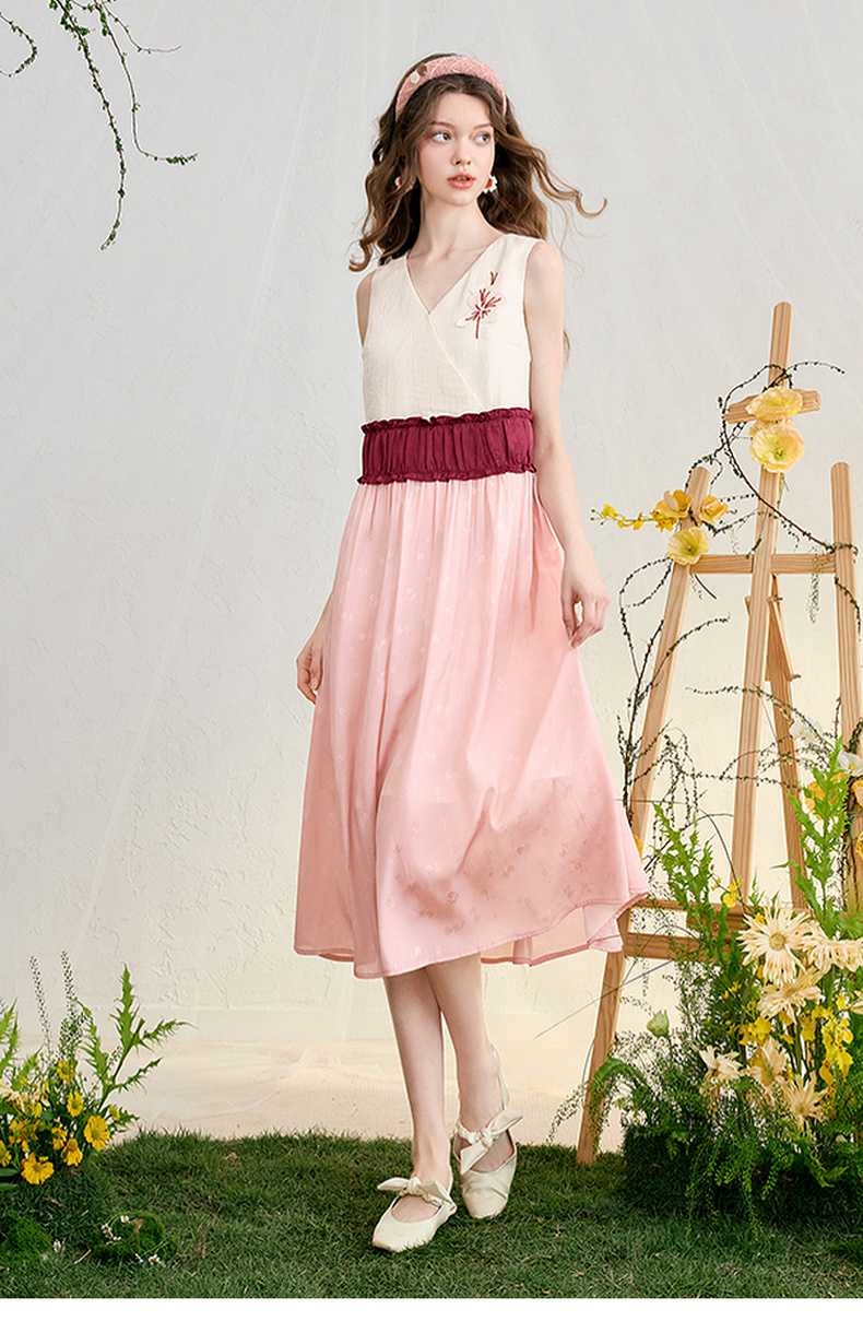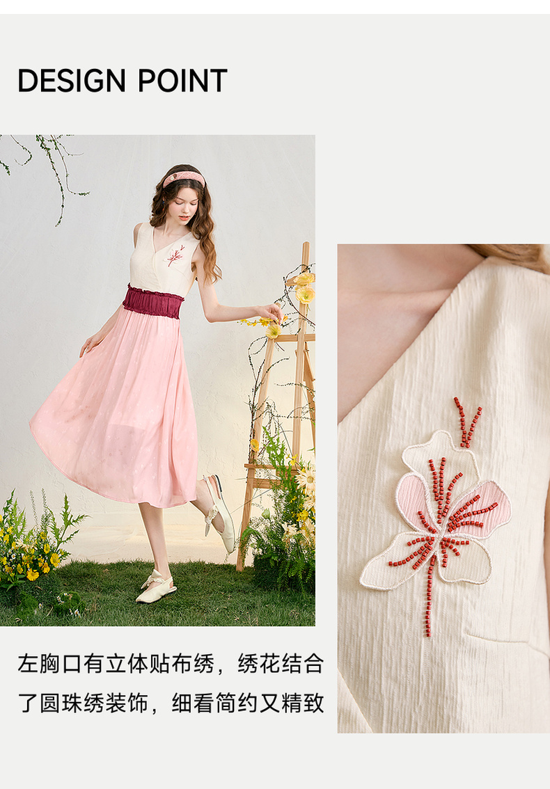 两三事月下绯烟2025春季新款温柔风珠片绣花拼色无袖背心裙连衣裙