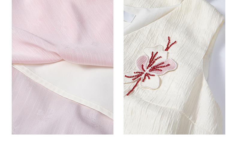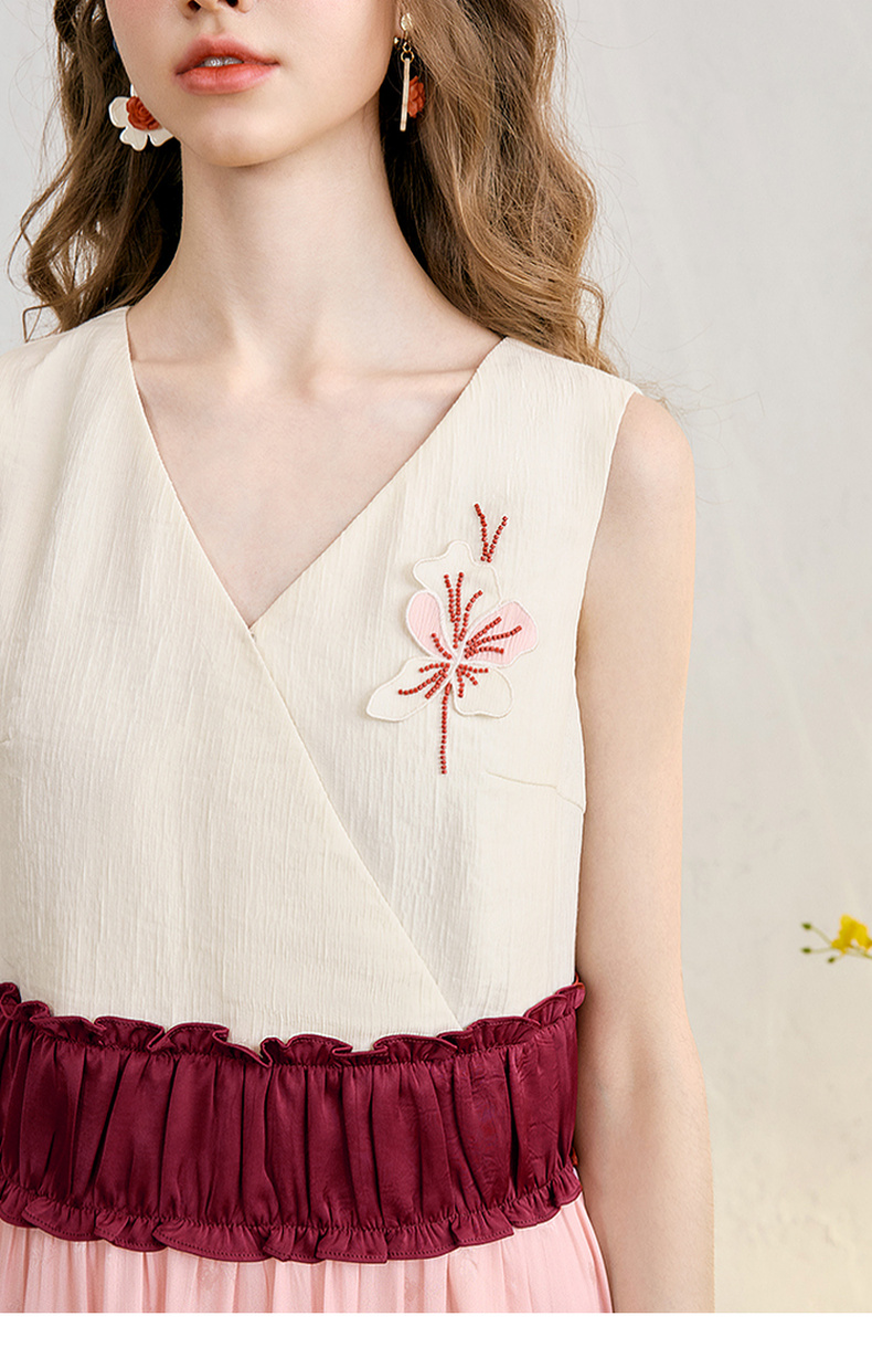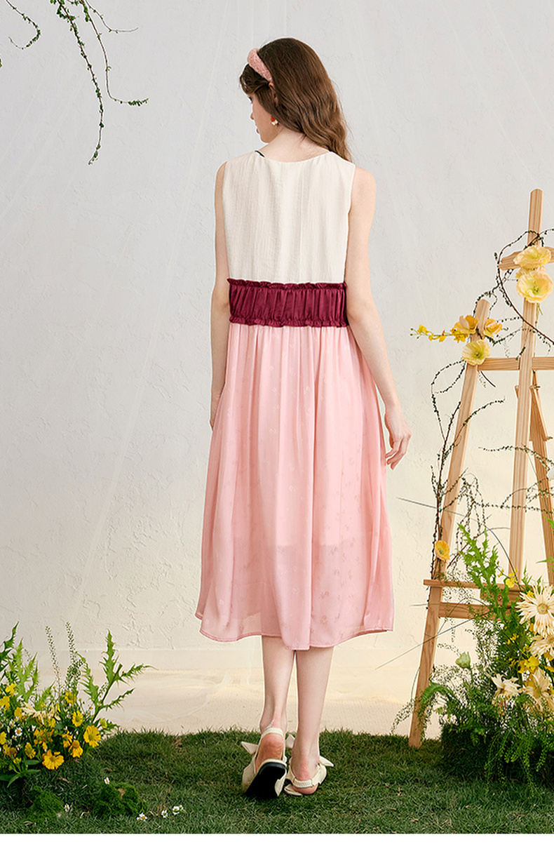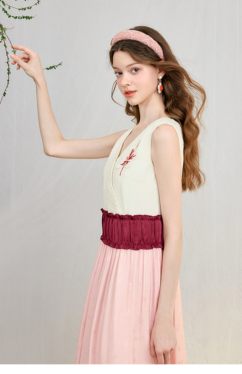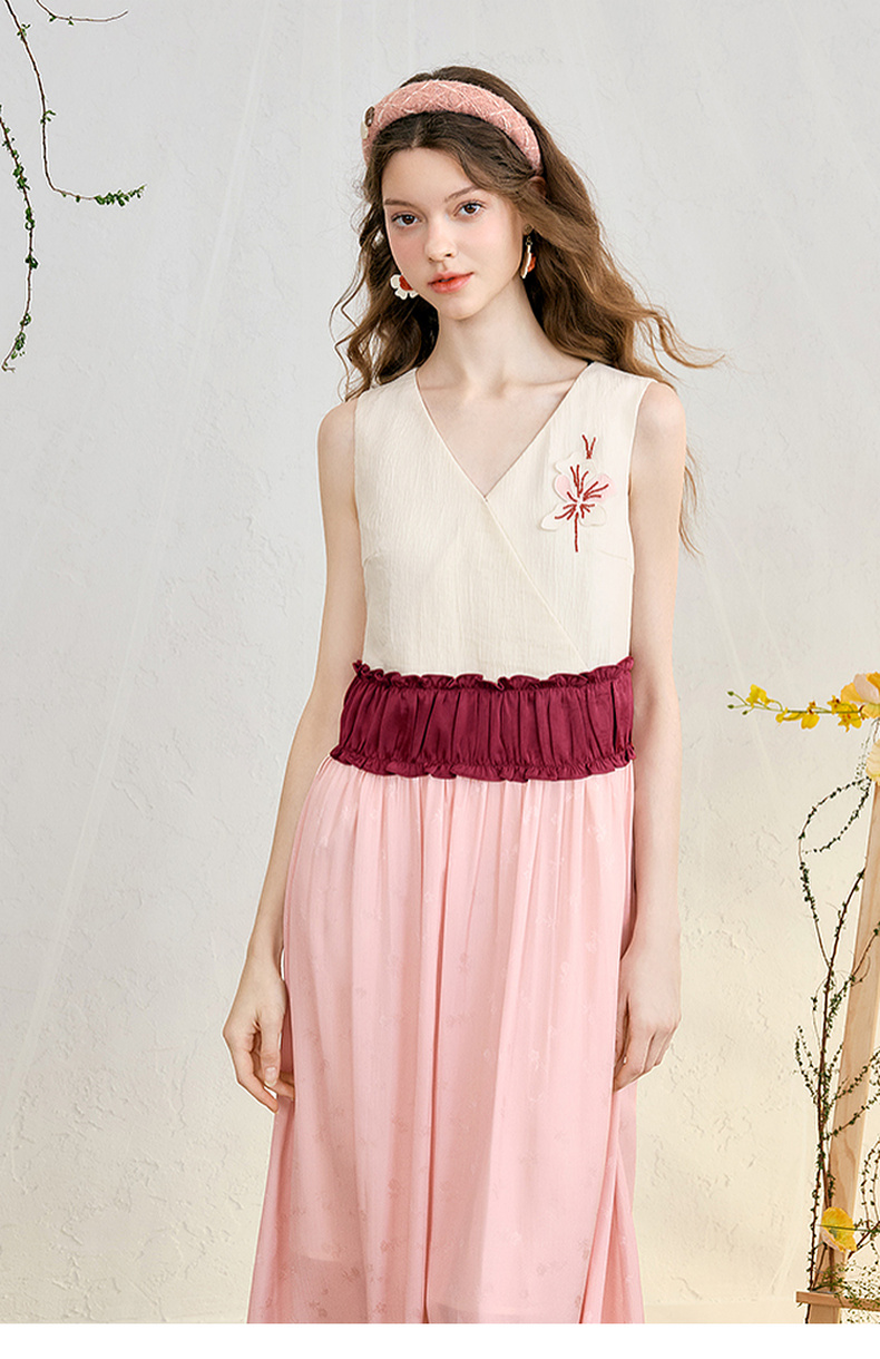 两三事月下绯烟2025春季新款温柔风珠片绣花拼色无袖背心裙连衣裙