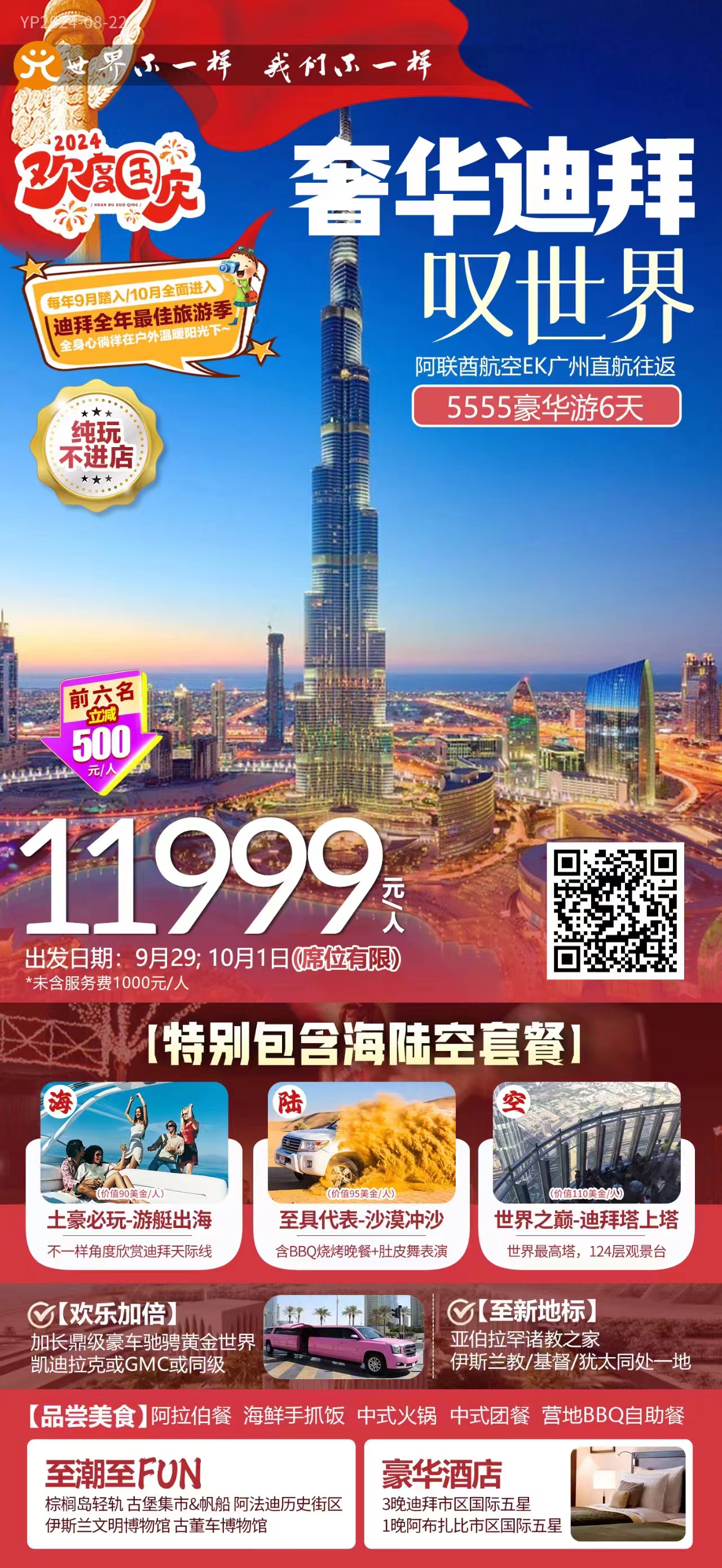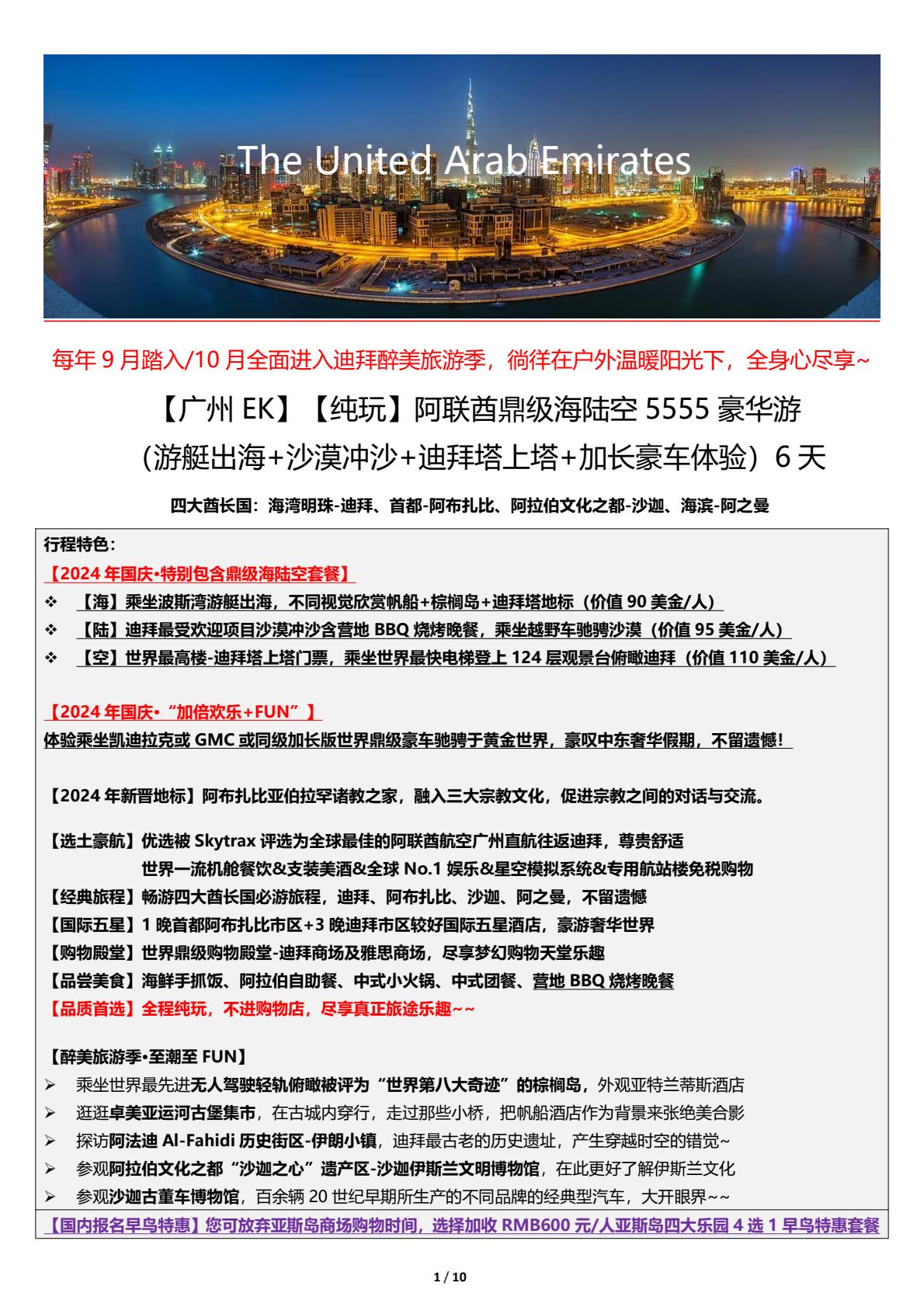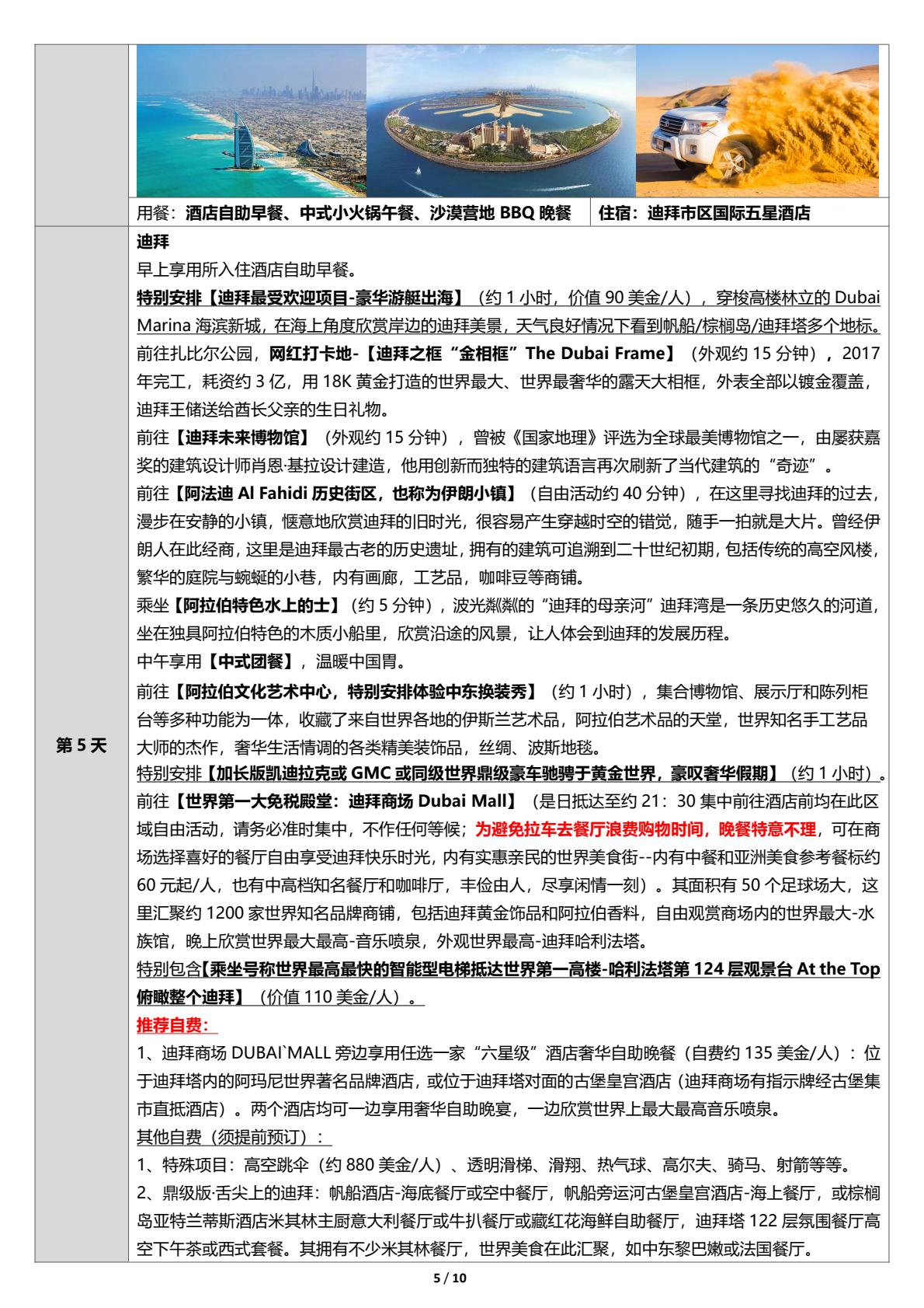 阿联酋迪拜6日游,游艇出海+沙漠冲沙+迪拜塔上塔+加长豪车体验
