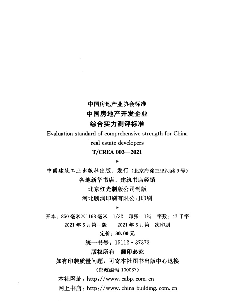书名:中国房地产开发企业综合实力测评标准T/CREA 003—2021