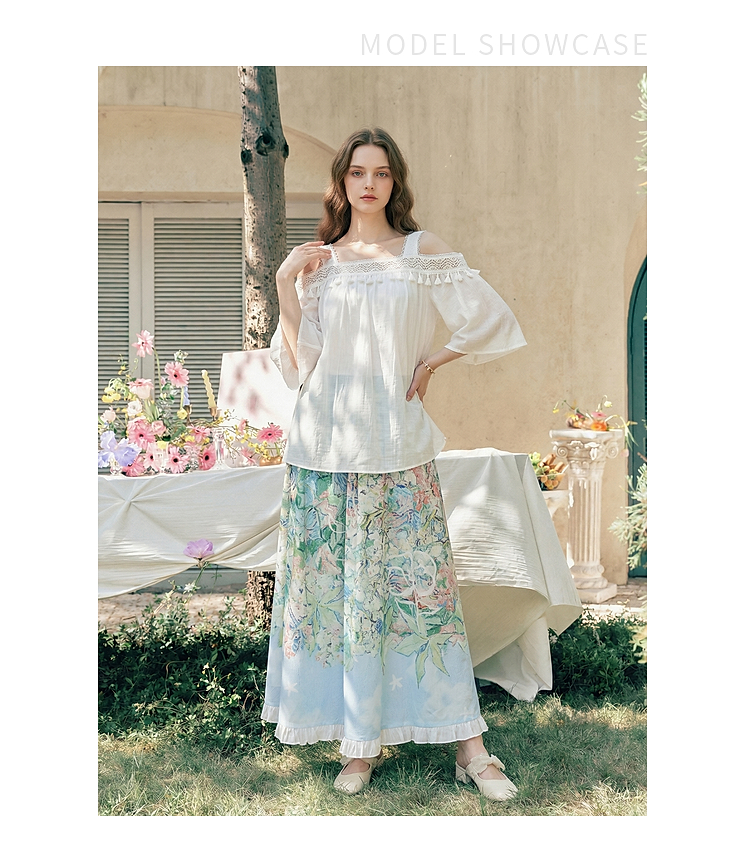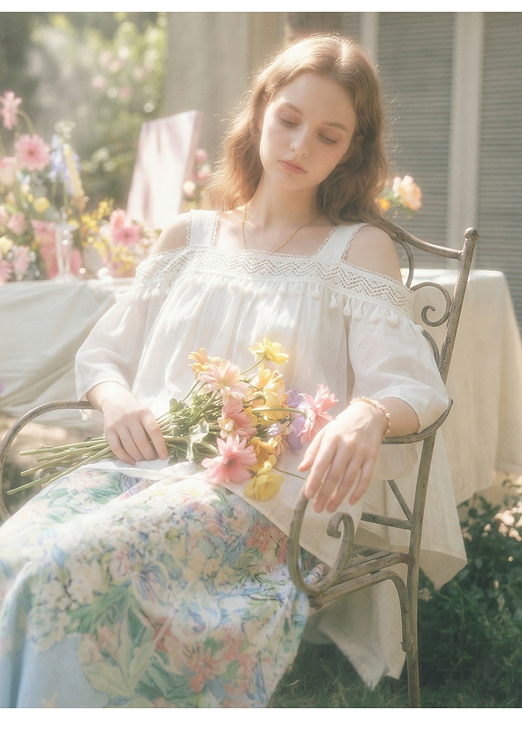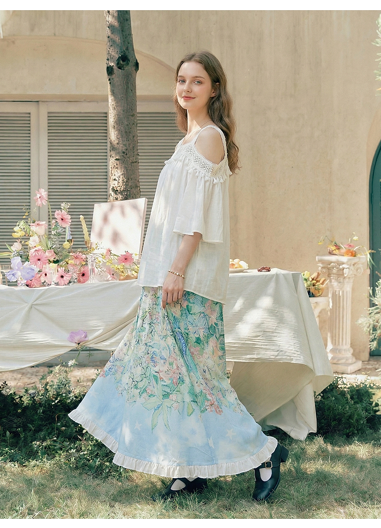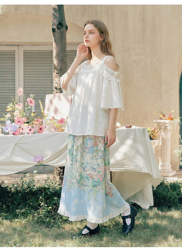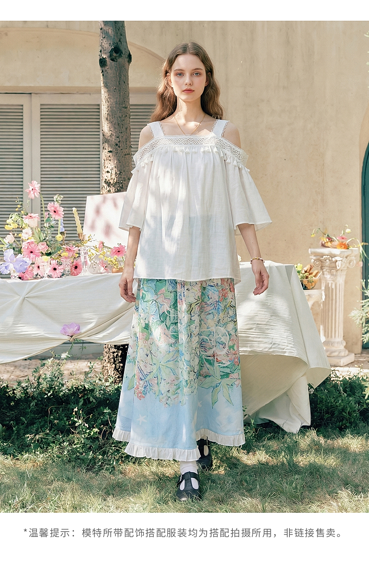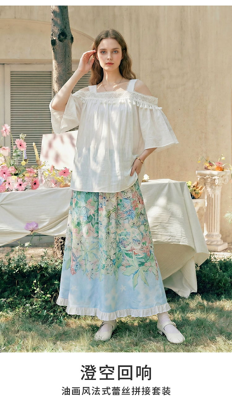 两三事澄空回响2026夏季新款度假风流苏露肩上衣印花半裙两件套女