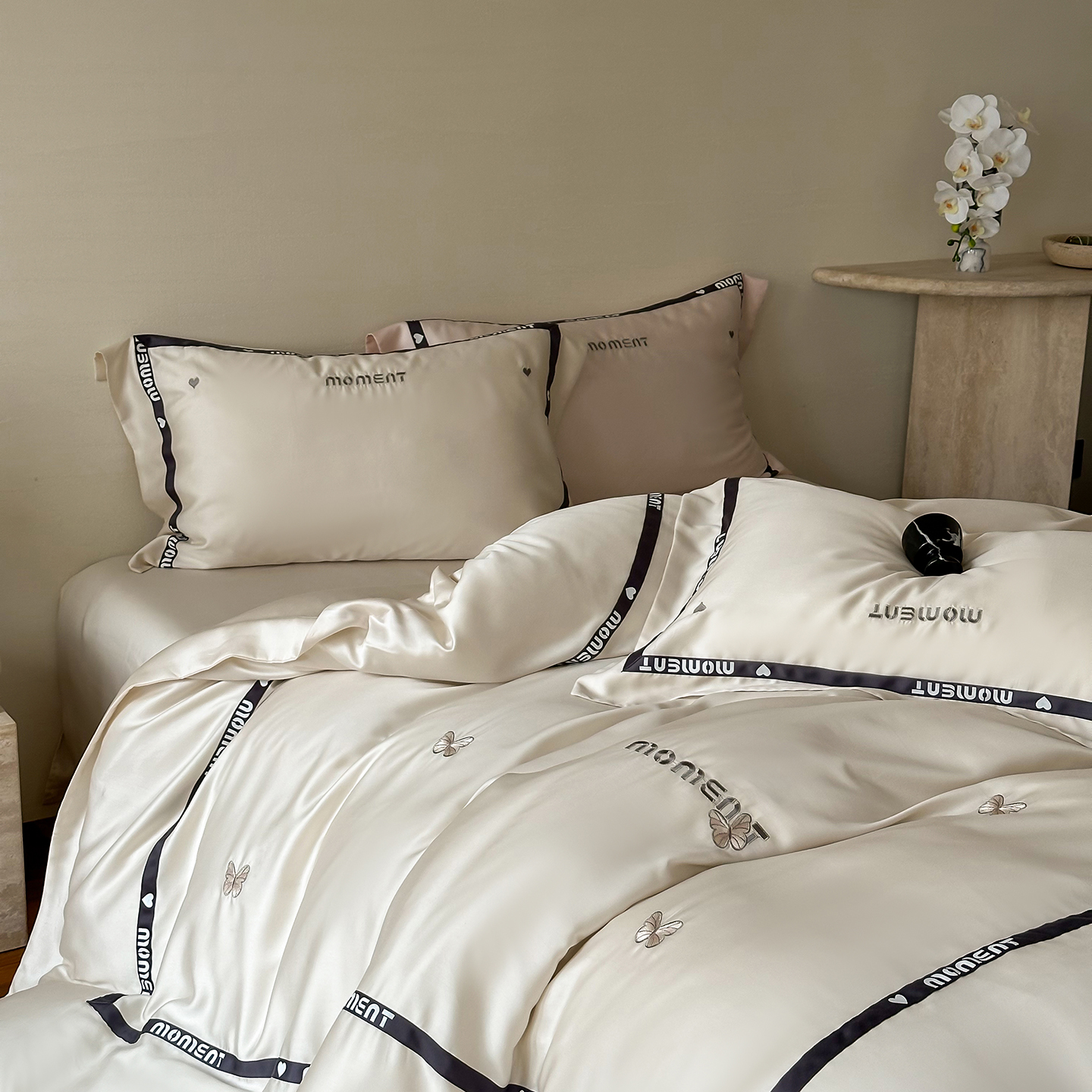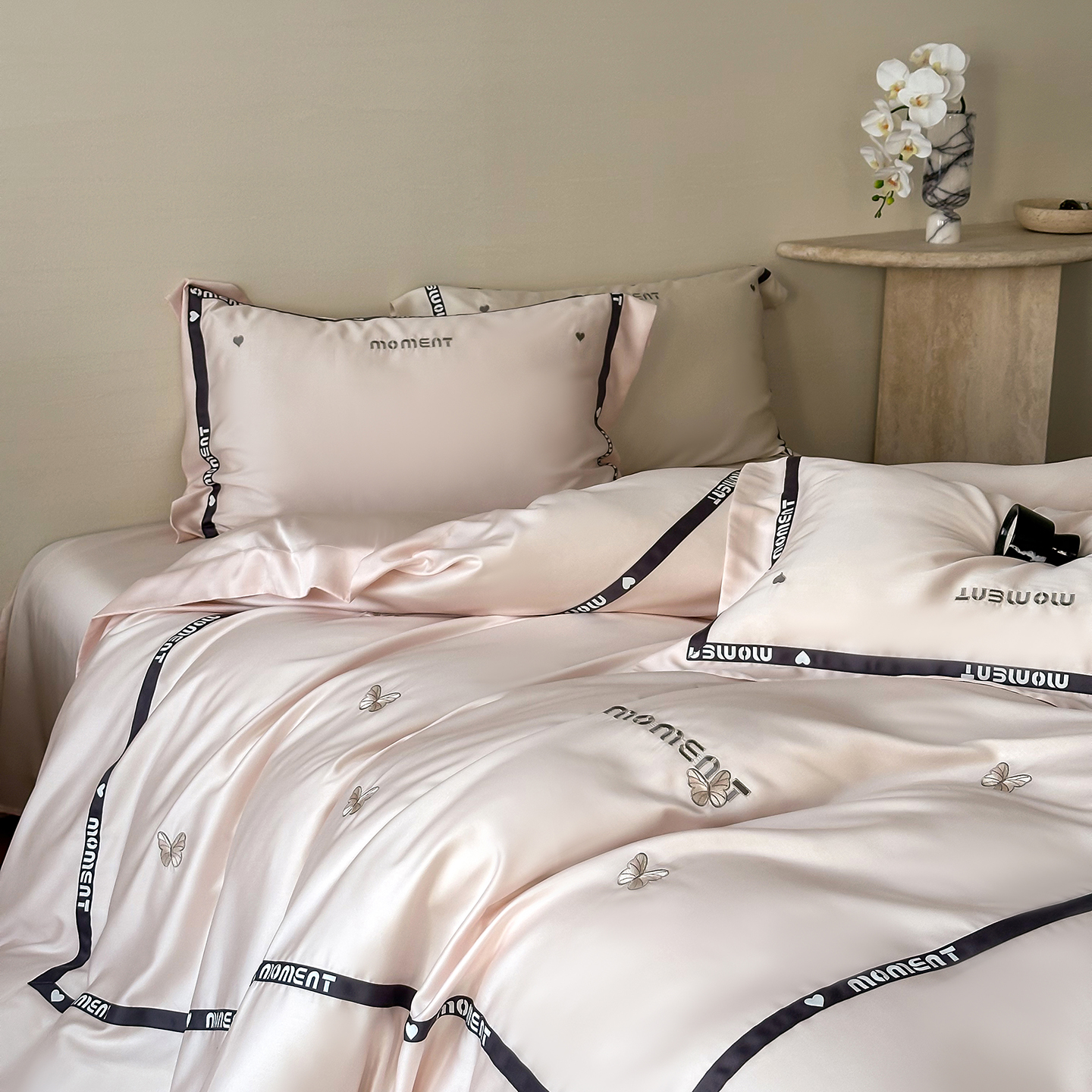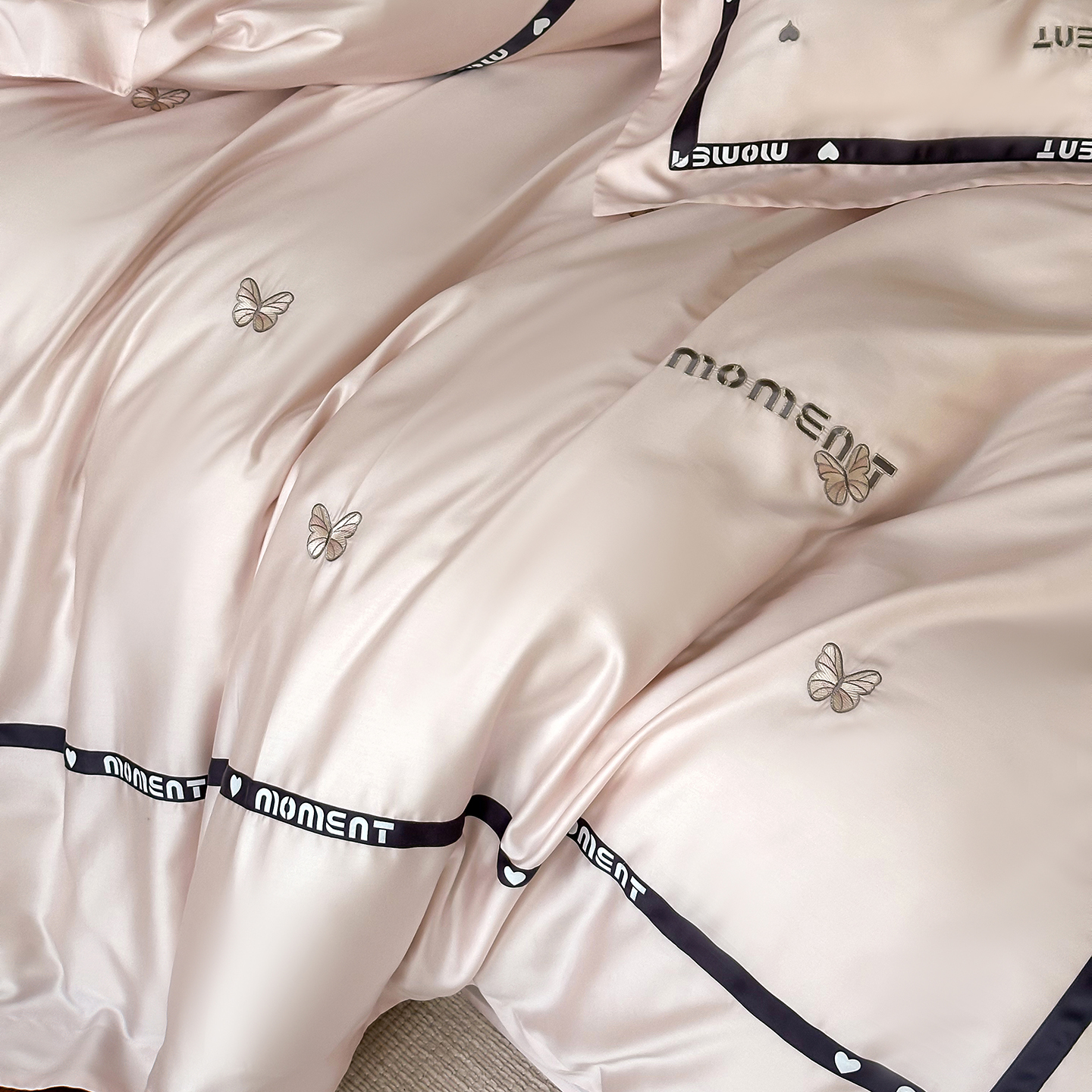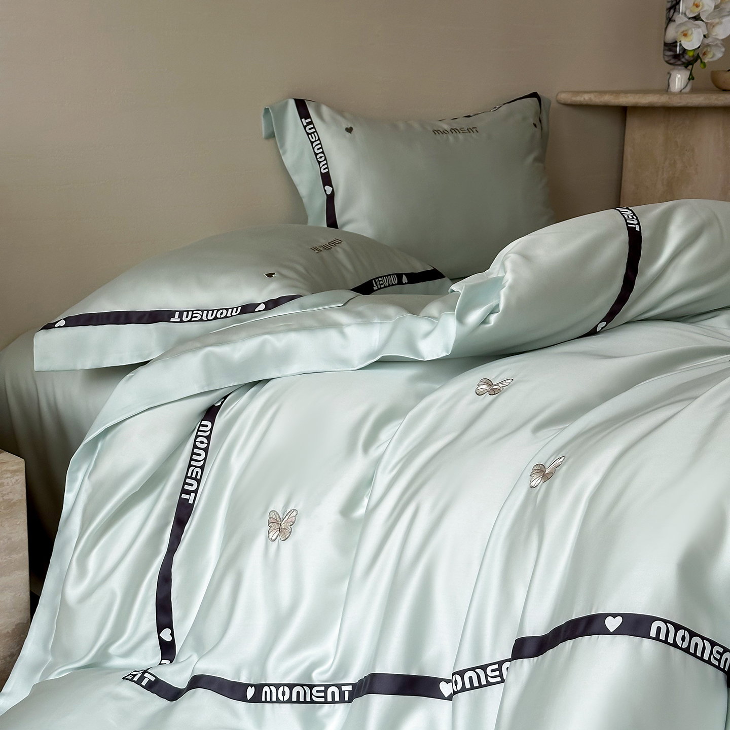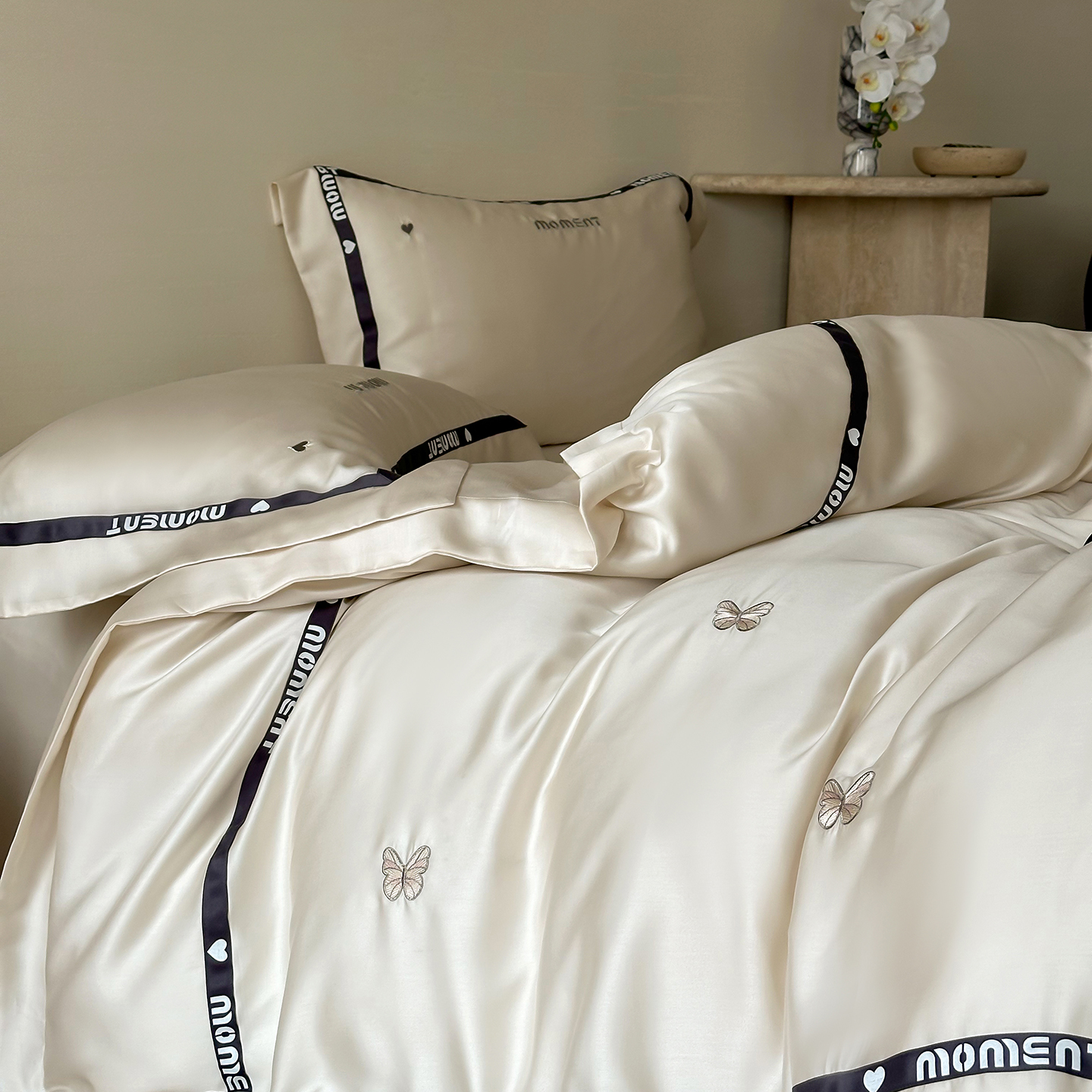 100%莱赛尔纤维,源自自然的纯净纤维,触感丝滑如绸,却又比丝绸更加透气吸湿。每一寸面料,都经过精心挑选与织造,只为给你最细腻的呵护。