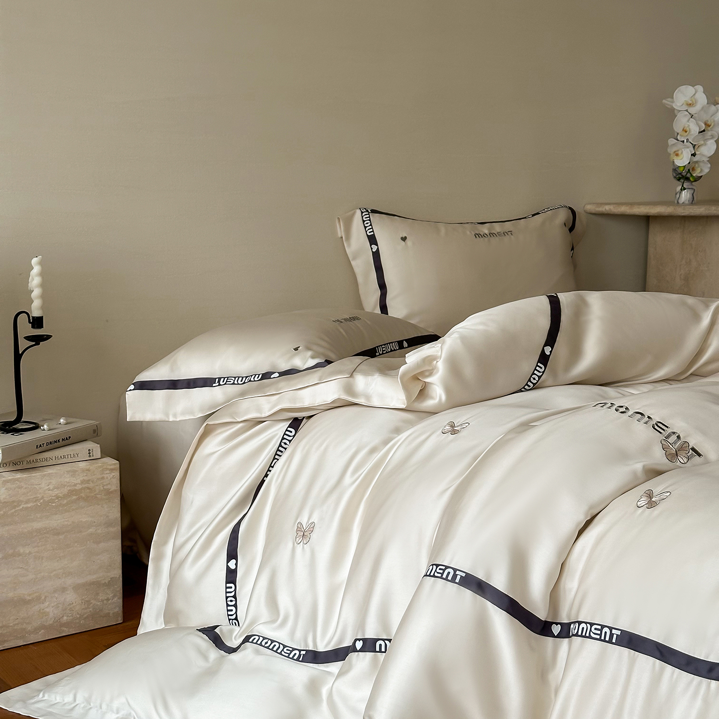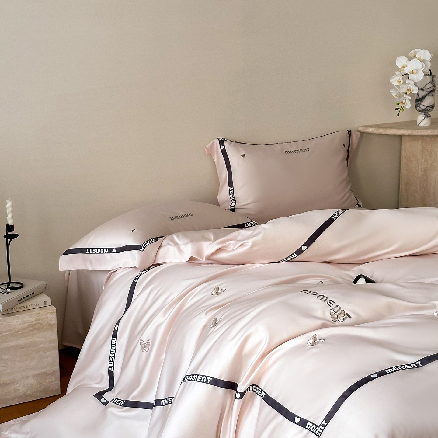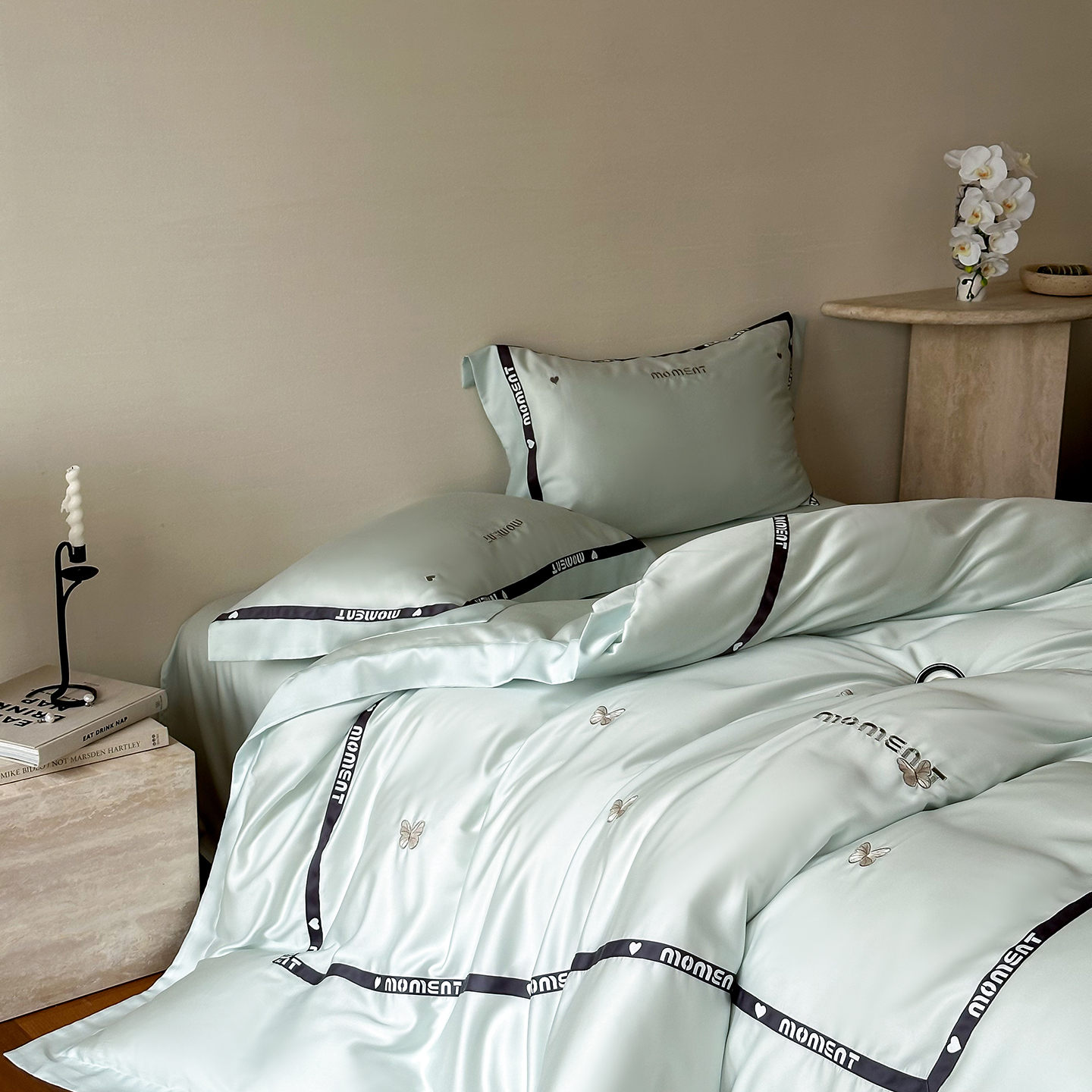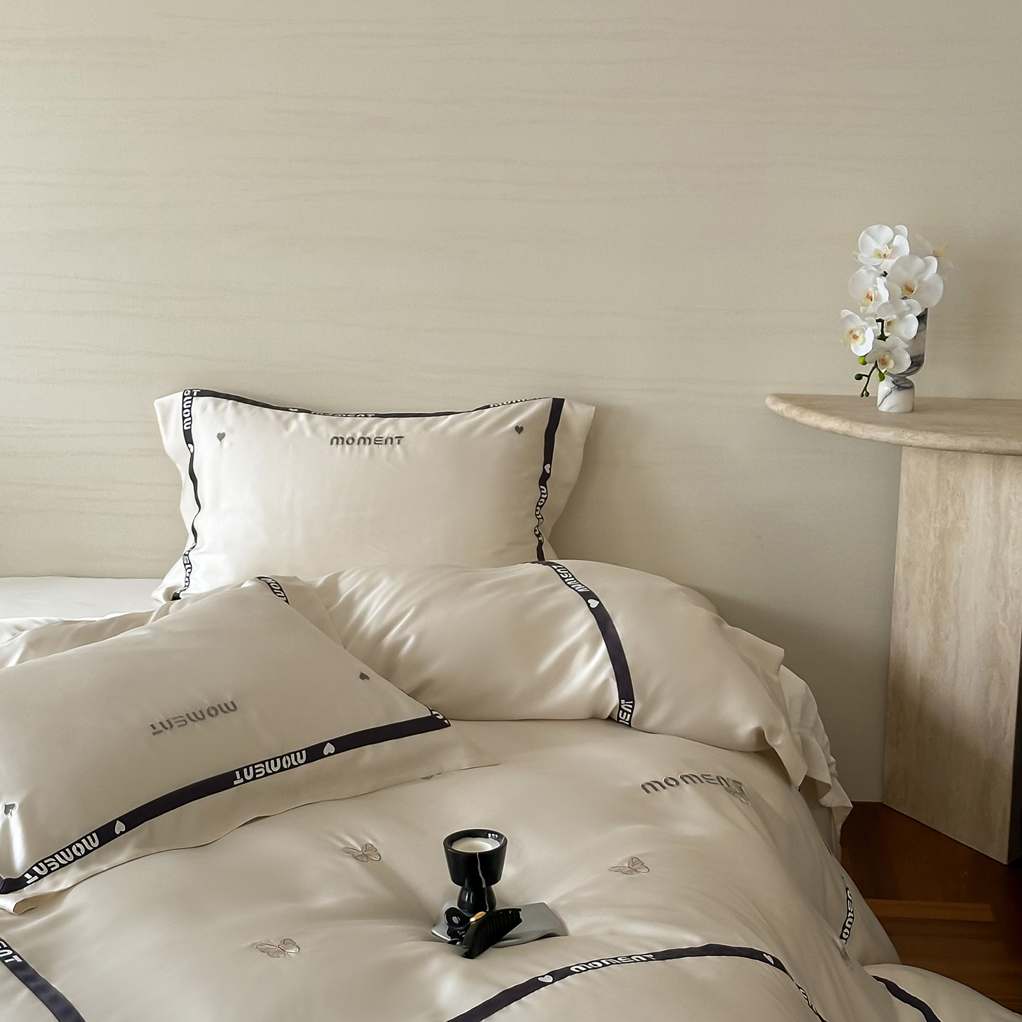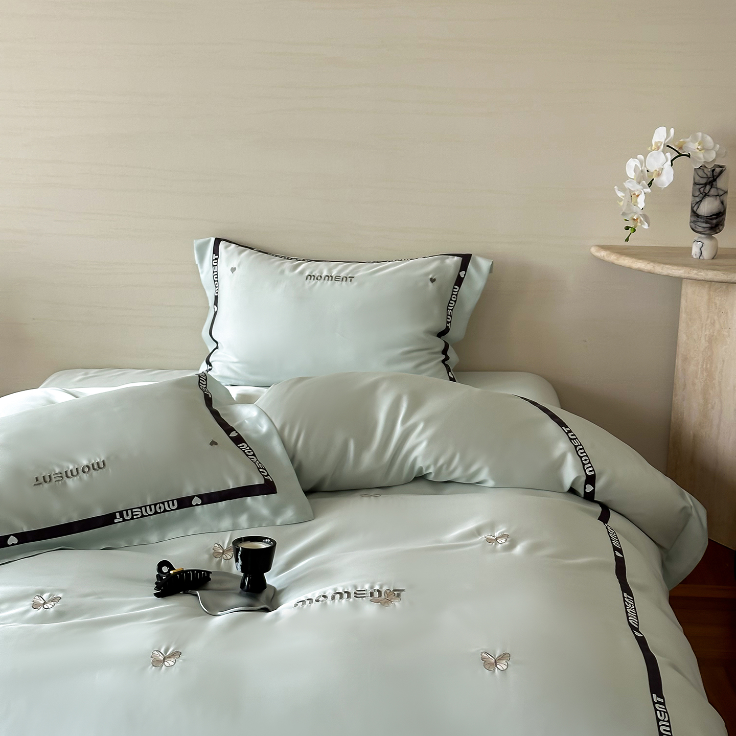 100%莱赛尔纤维,源自自然的纯净纤维,触感丝滑如绸,却又比丝绸更加透气吸湿。每一寸面料,都经过精心挑选与织造,只为给你最细腻的呵护。