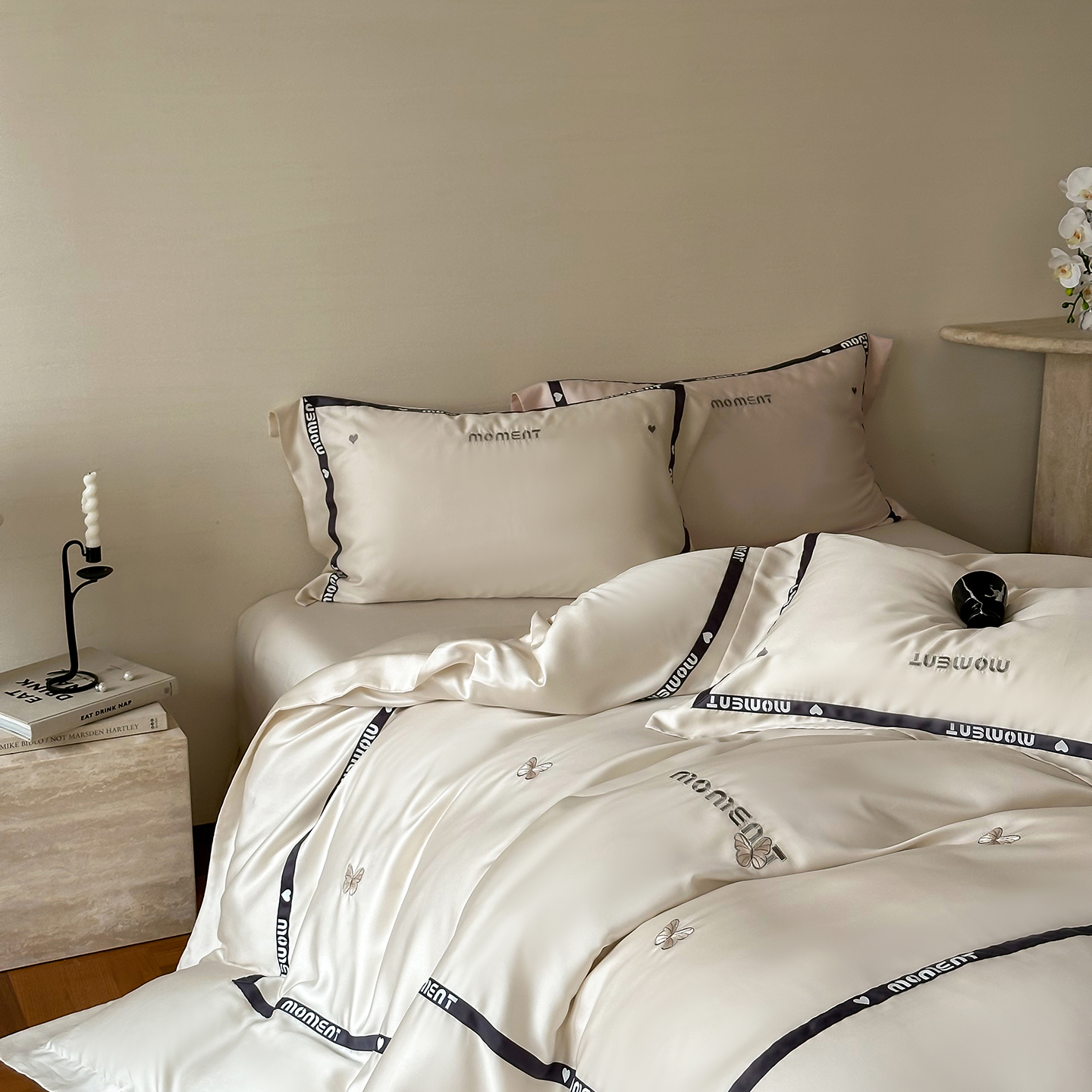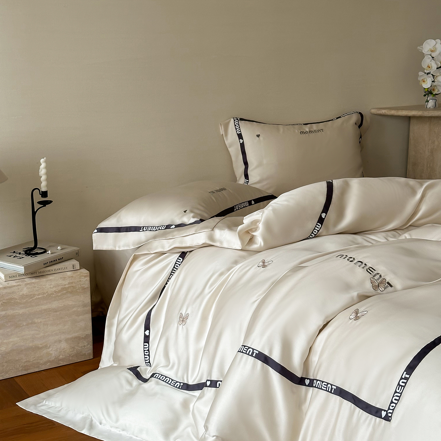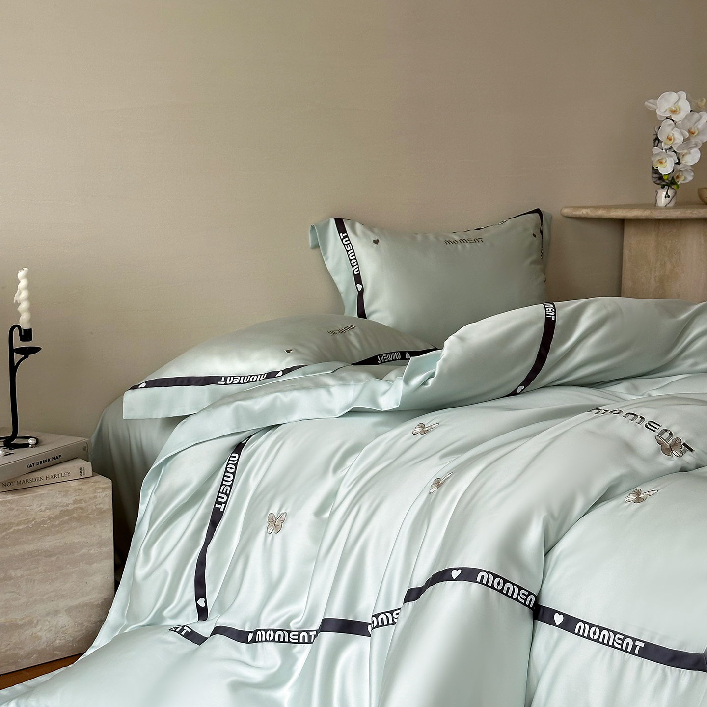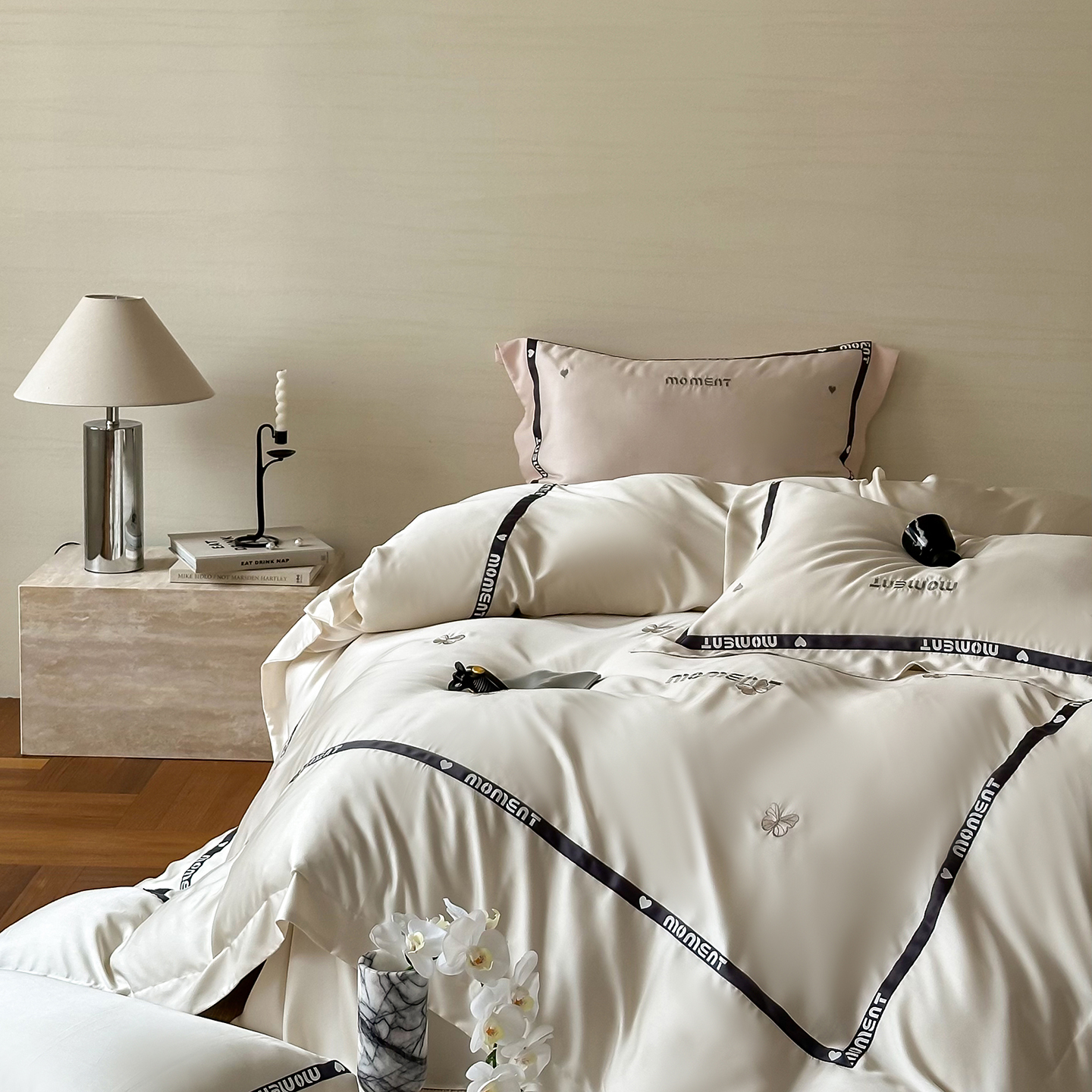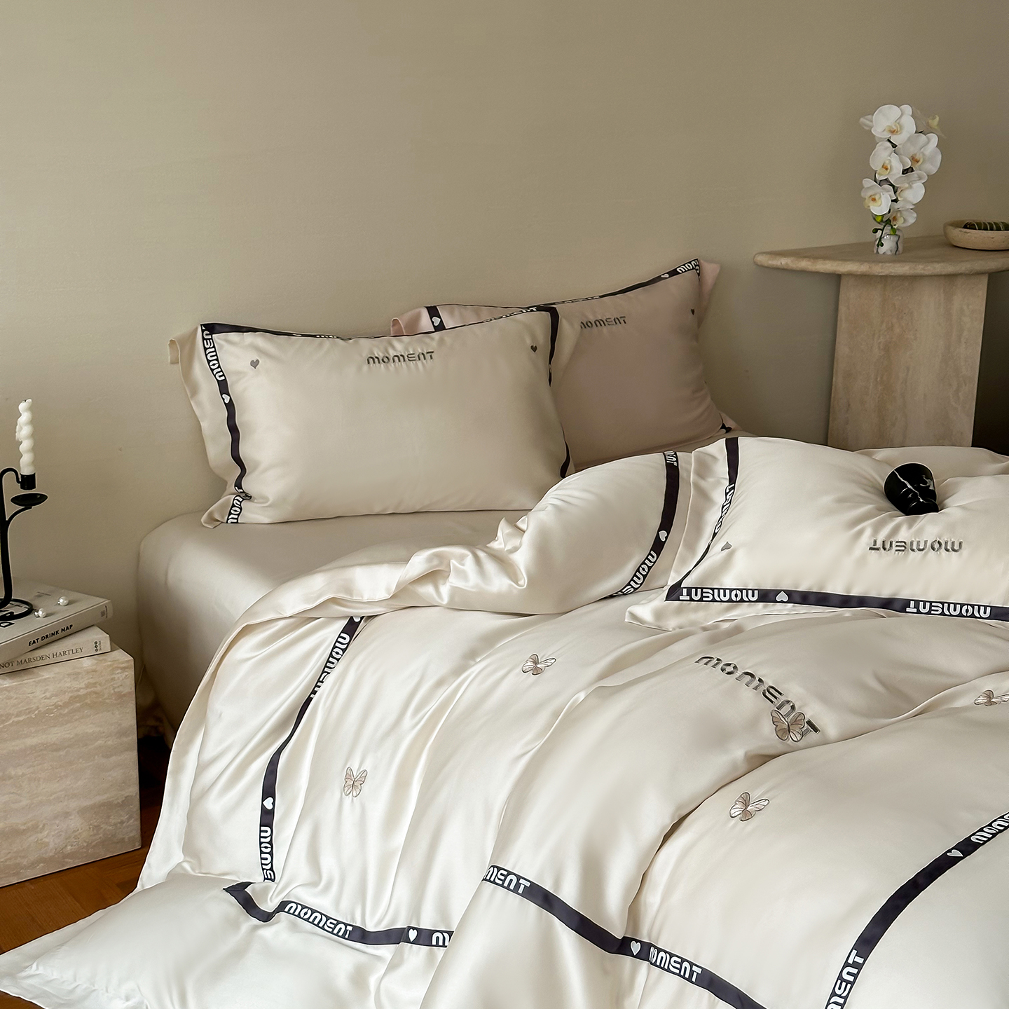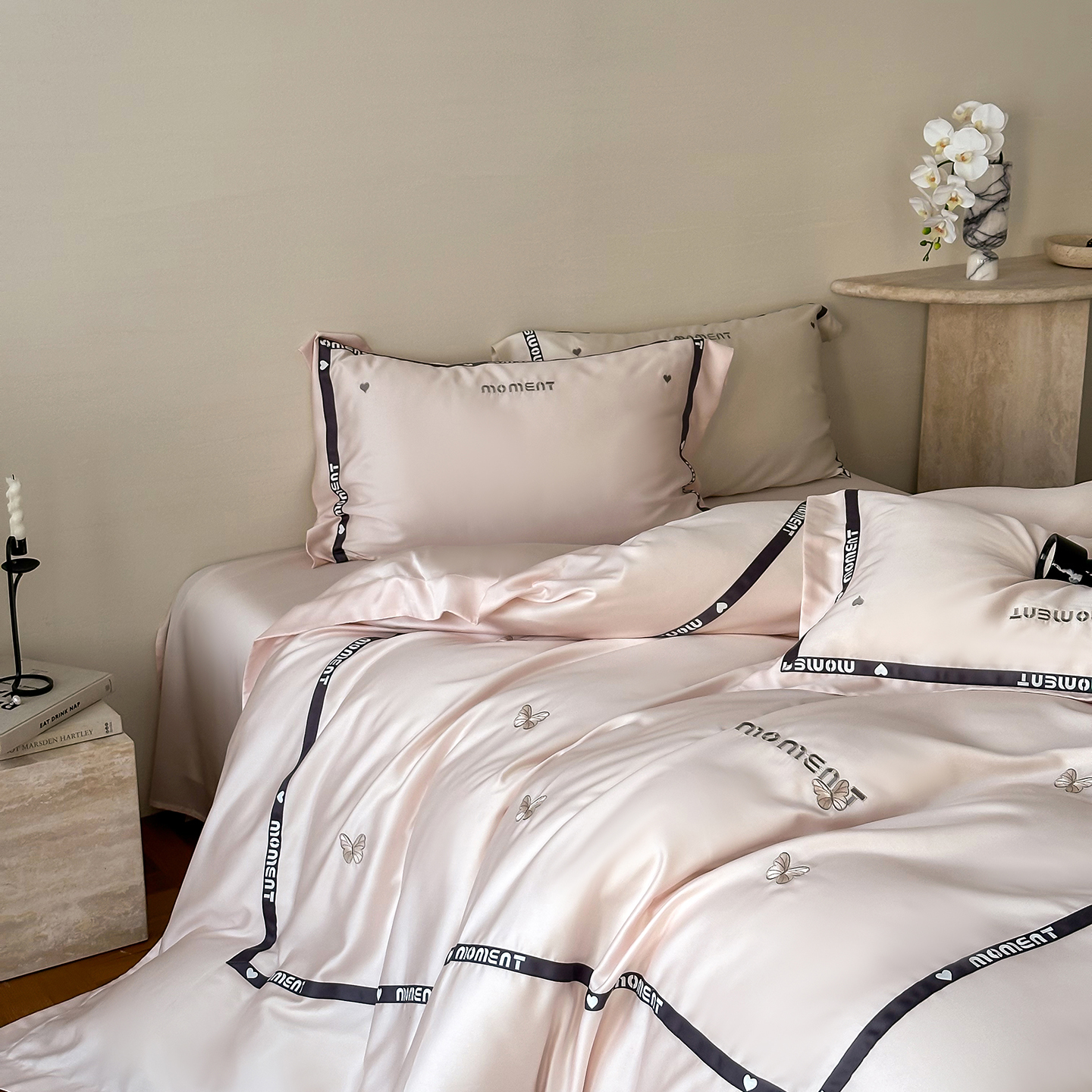 100%莱赛尔纤维,源自自然的纯净纤维,触感丝滑如绸,却又比丝绸更加透气吸湿。每一寸面料,都经过精心挑选与织造,只为给你最细腻的呵护。