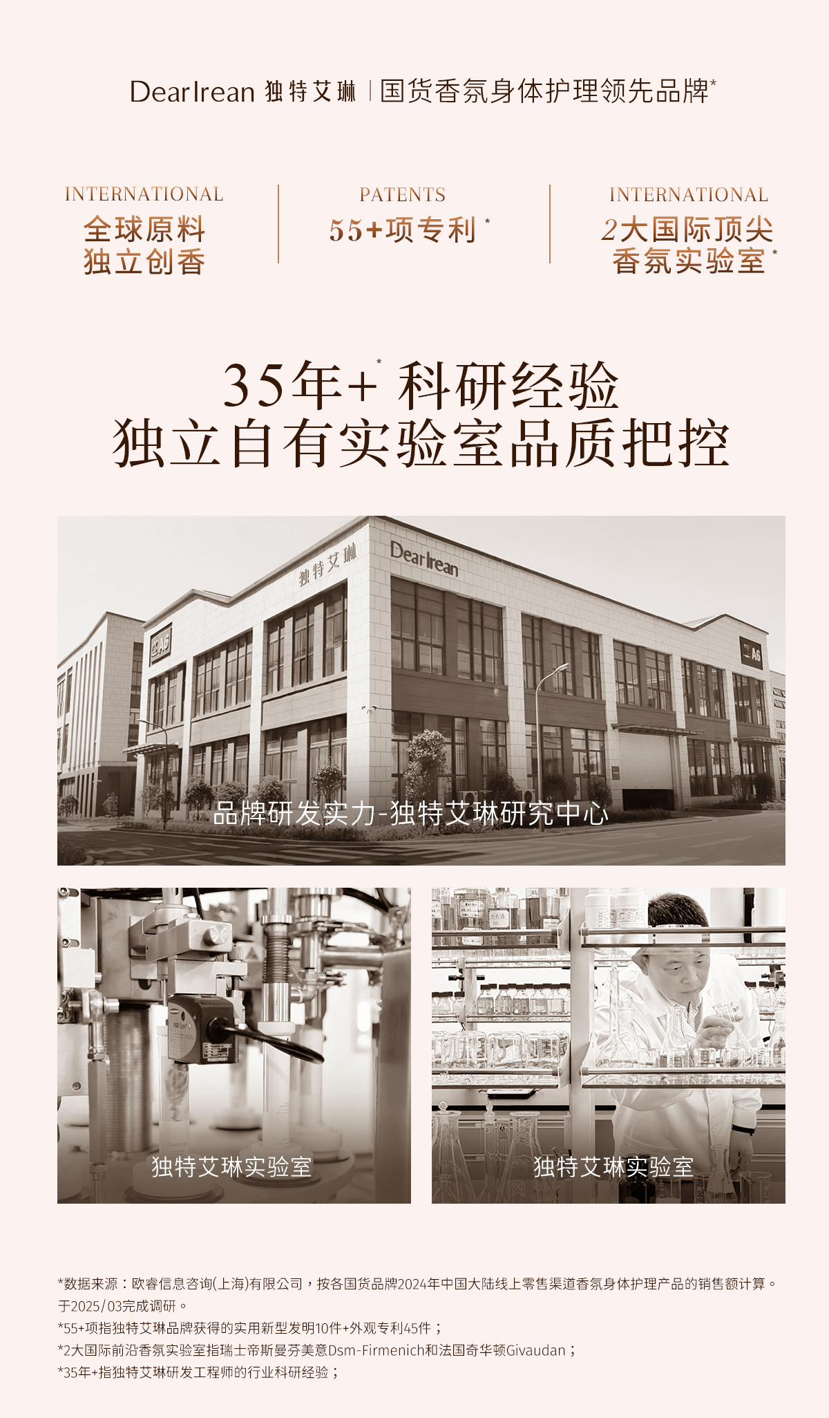 - DearIrean 独特艾琳,高定香氛生活品牌,拥有体•研究所,品牌致力于将高定香氛带入生活,同时倡导“以香之名,带给生活美好方式”的品牌理念,传递精致女性的爱、独立、自信。