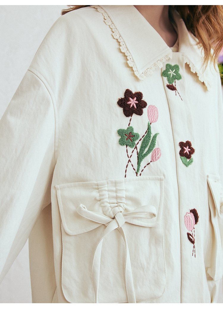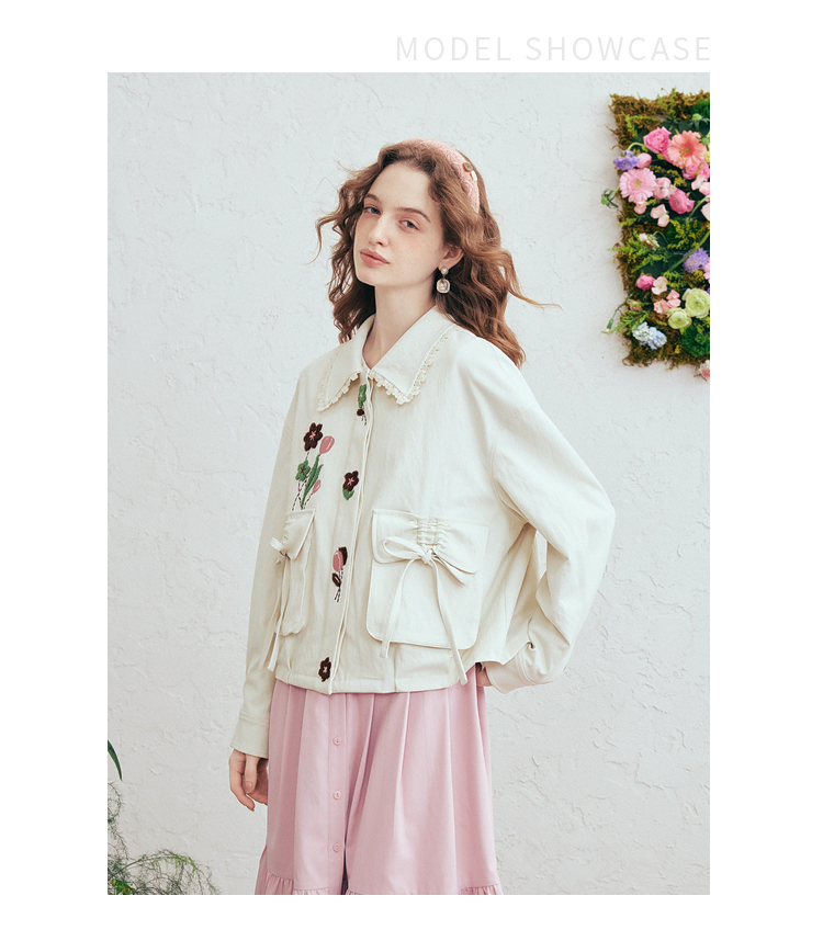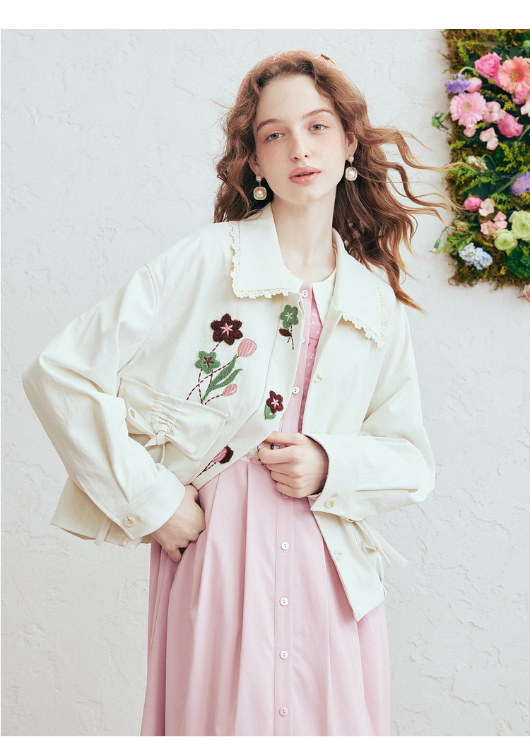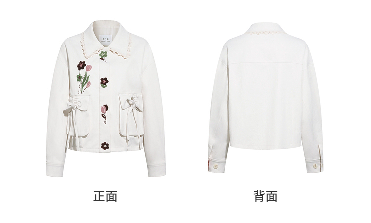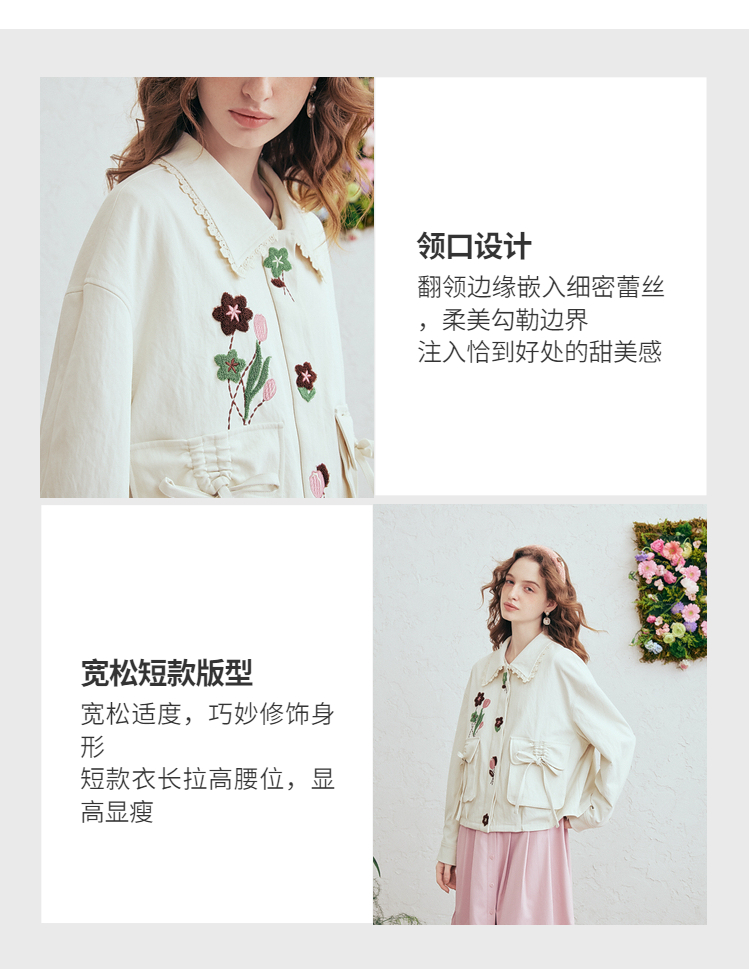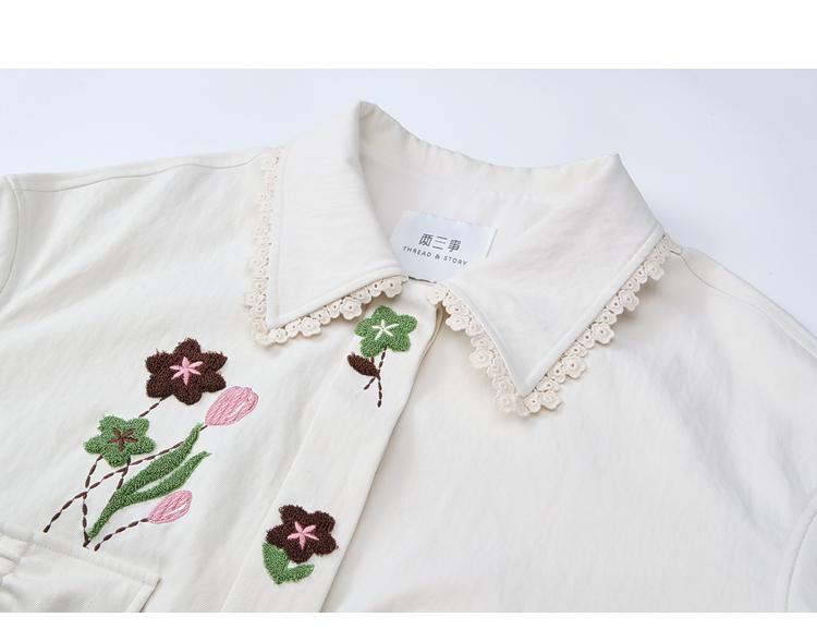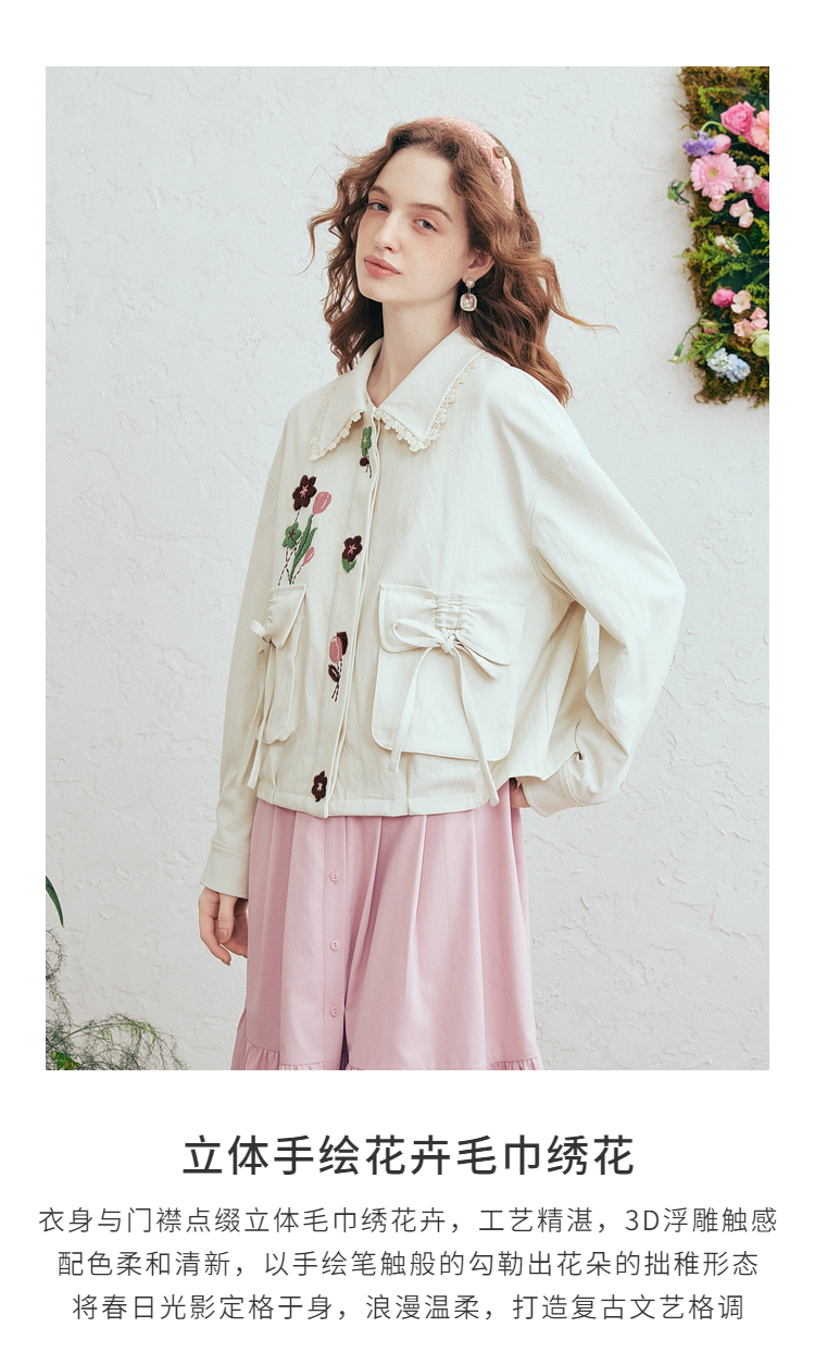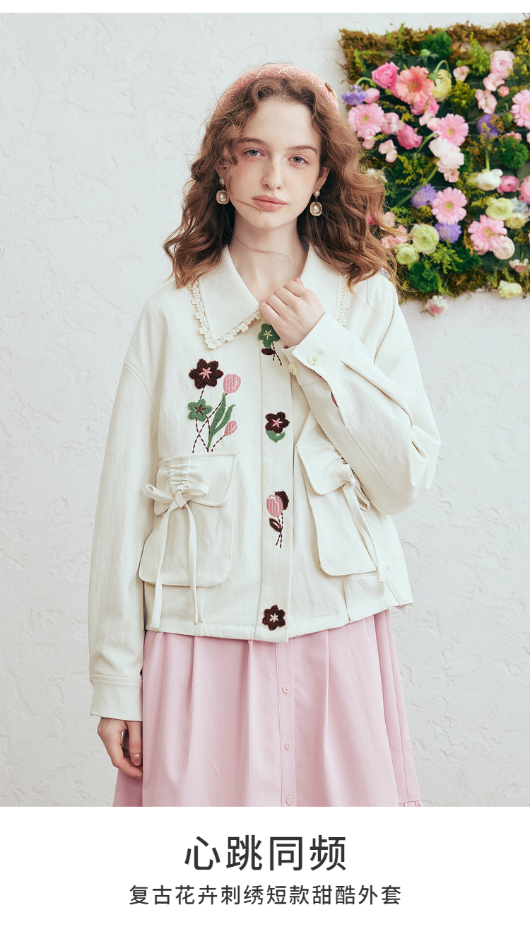 两三事心跳同频2026春季新款甜美花朵毛巾绣蕾丝边翻领短外套女