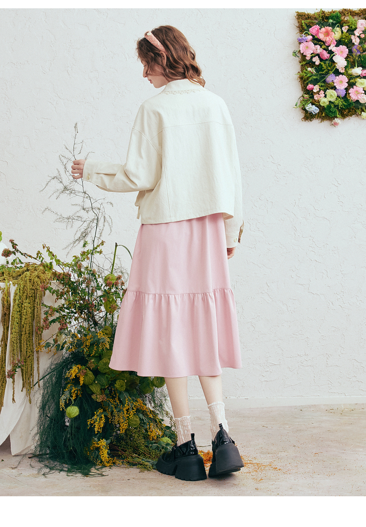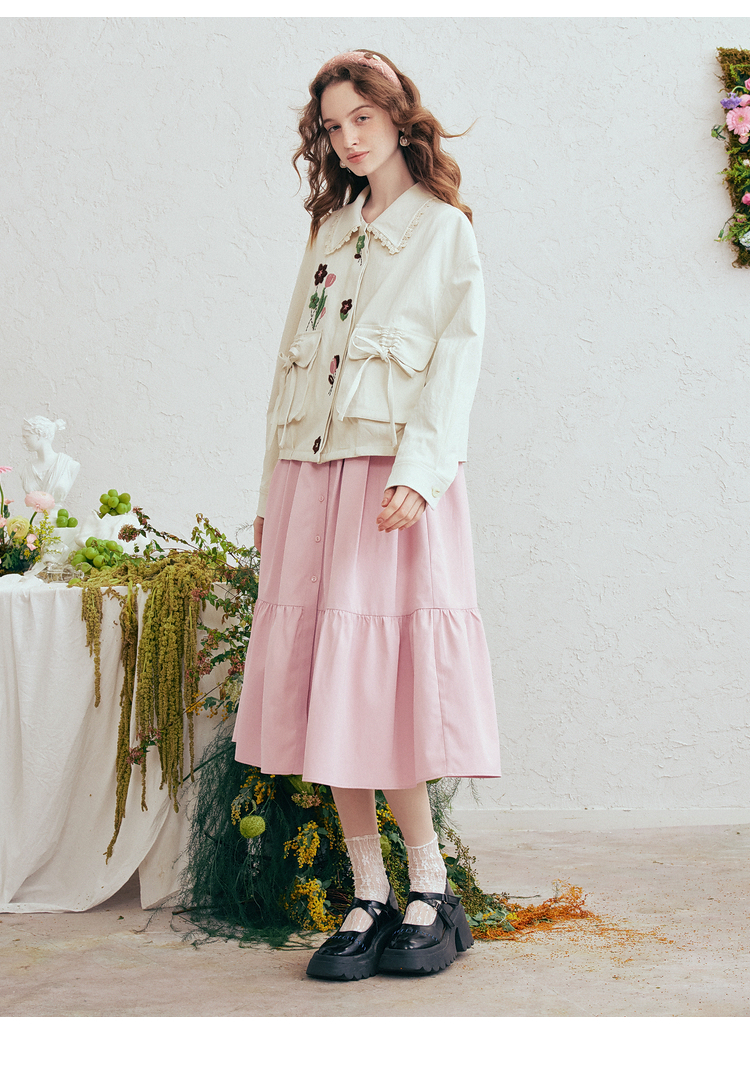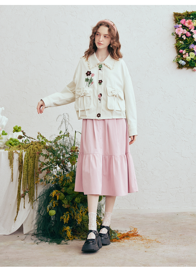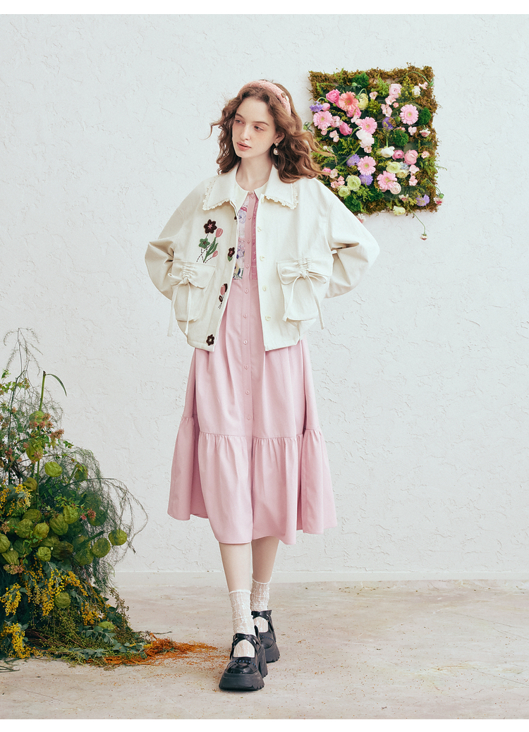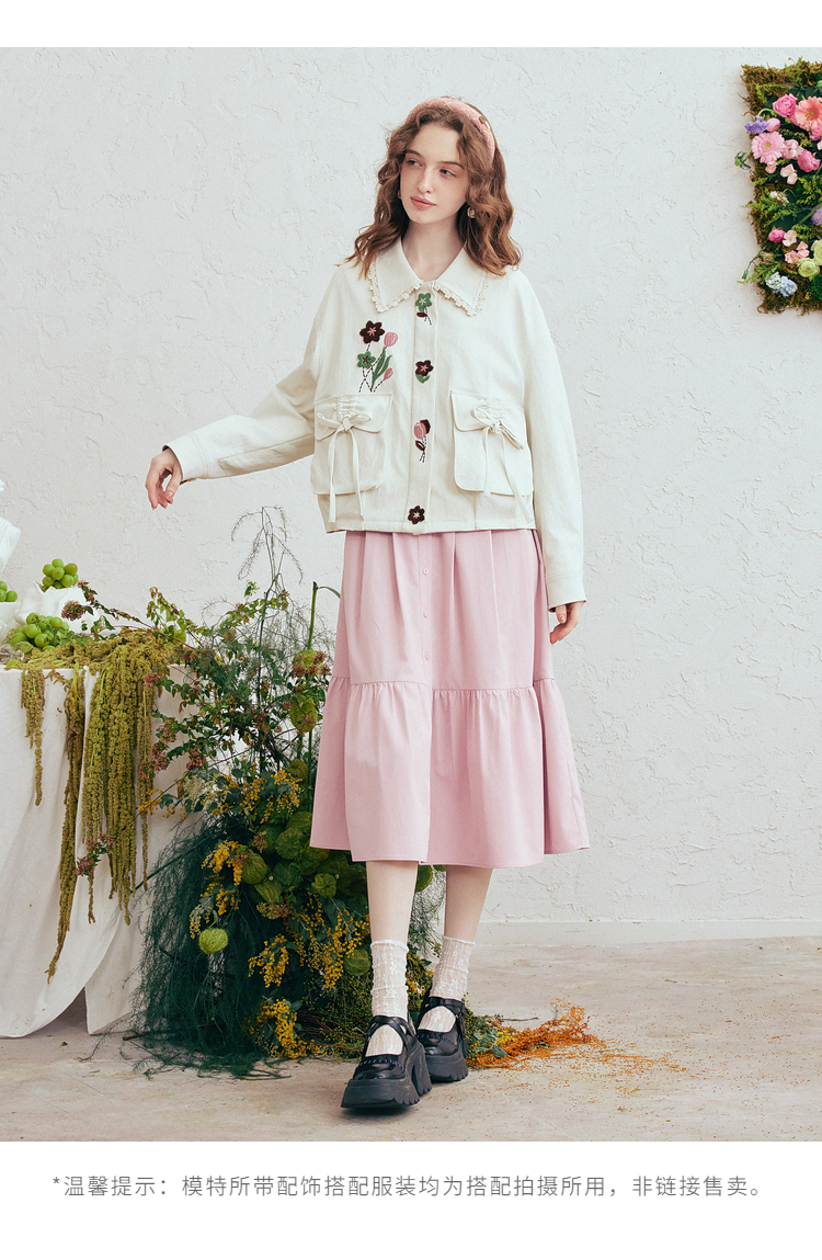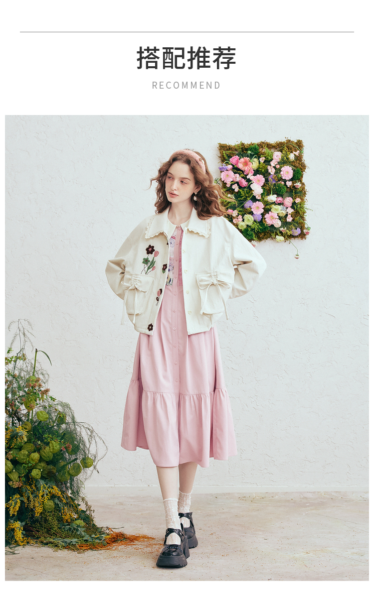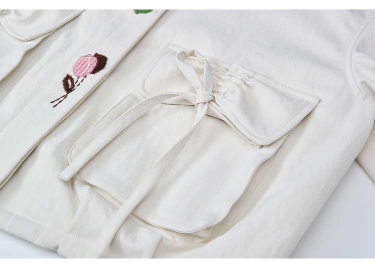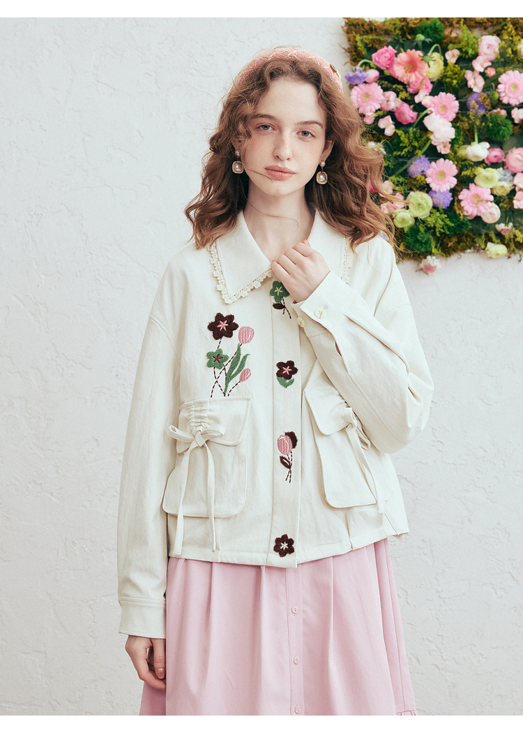 两三事心跳同频2026春季新款甜美花朵毛巾绣蕾丝边翻领短外套女