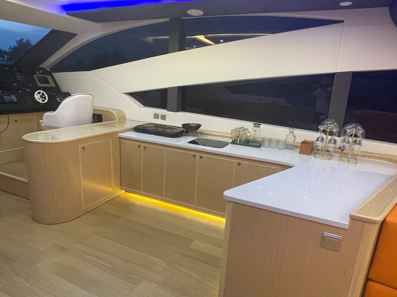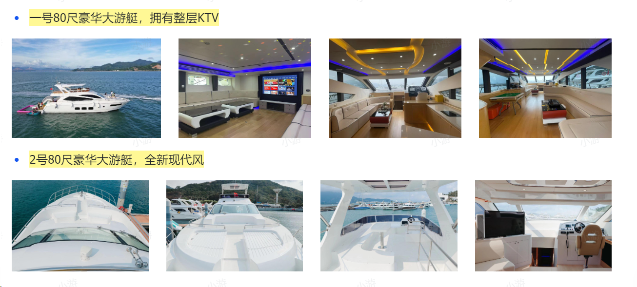 豪华游艇出海船费、水果、饮料、餐饮安排、矿泉水、浮潜道具、鱼竿鱼饵、救生衣、驾驶体验、海上泳池、海上滑梯。