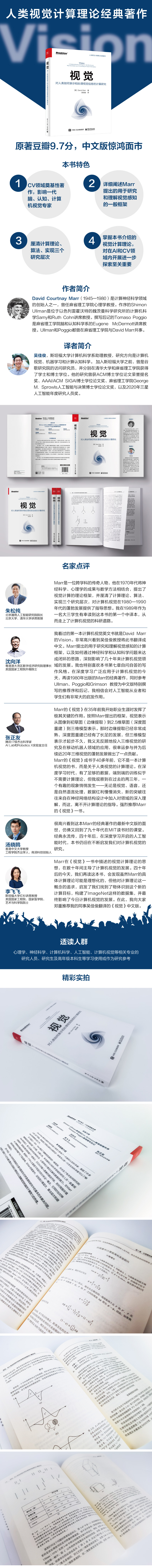 本书研究了人类对视觉信息的表示和处理,并对视觉计算处理过程提出了全面的计算理论。全书立足于计算机科学的进展,是跨学科交叉研究的经典教科书,并对多个学科的研究都有深刻启发作用。特别值得一提的是,在近年深度学习的热潮之中,了解掌握本书介绍的视觉计算理论对于在人工智能和计算机视觉领域内开展进一步探索是至关重要的。