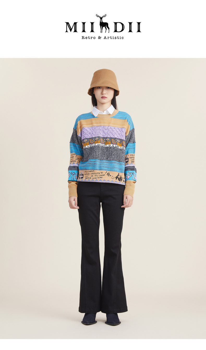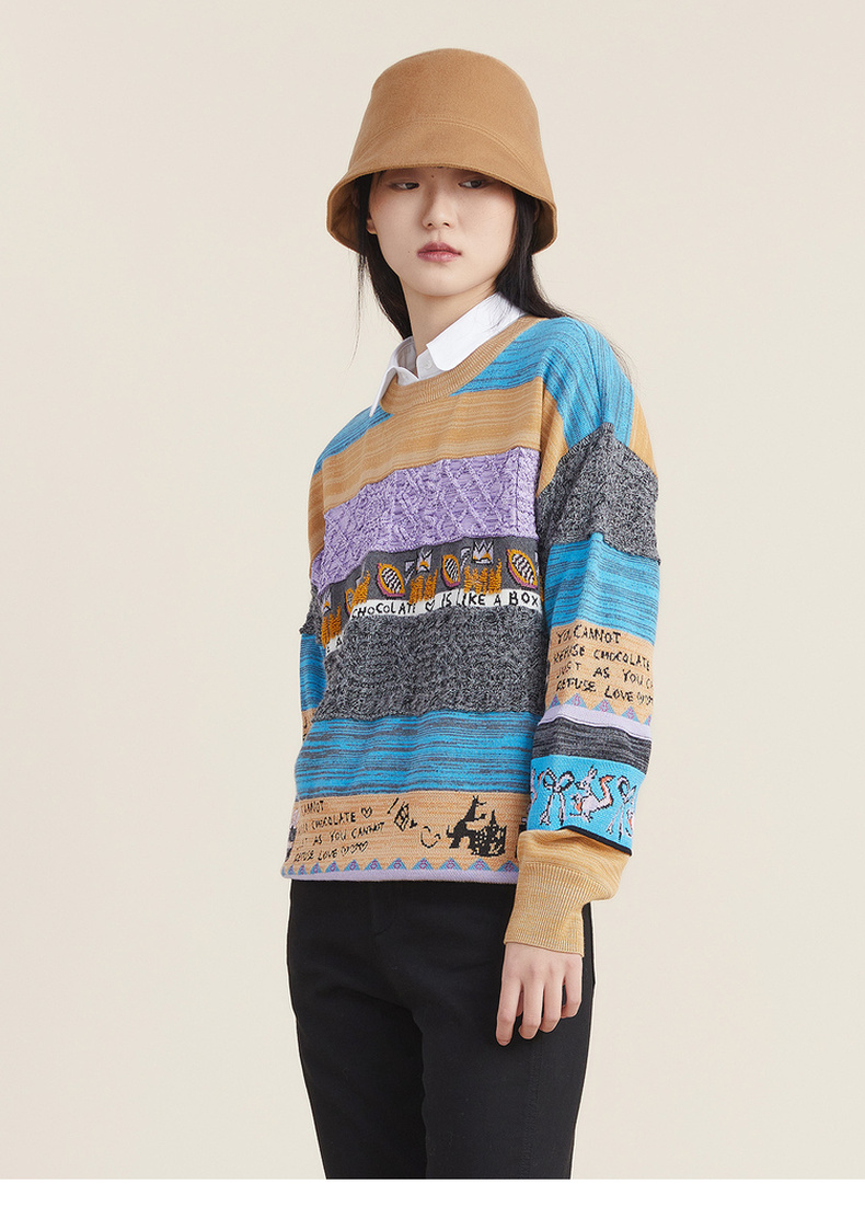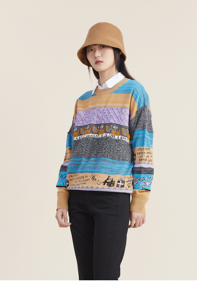谜底2022秋新款复古文艺趣味图案绣花百搭套头针织衫女223MZ1372