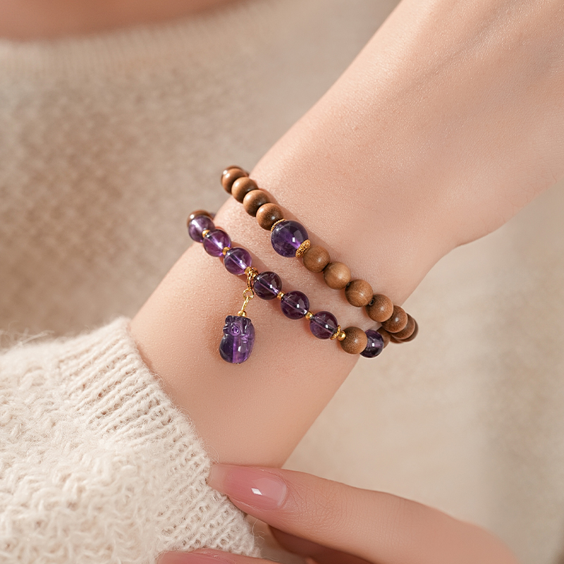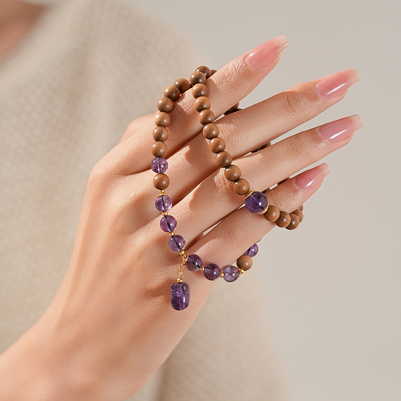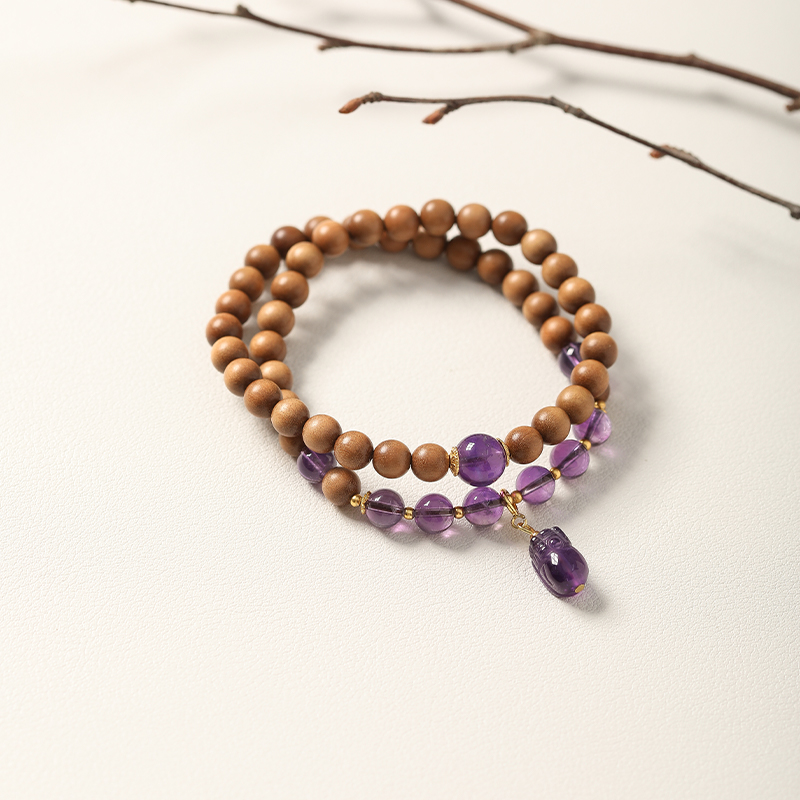 【尺寸】檀木珠0.62cm,小紫水晶0.65cm,大紫水晶0.85cm,圈长33cm