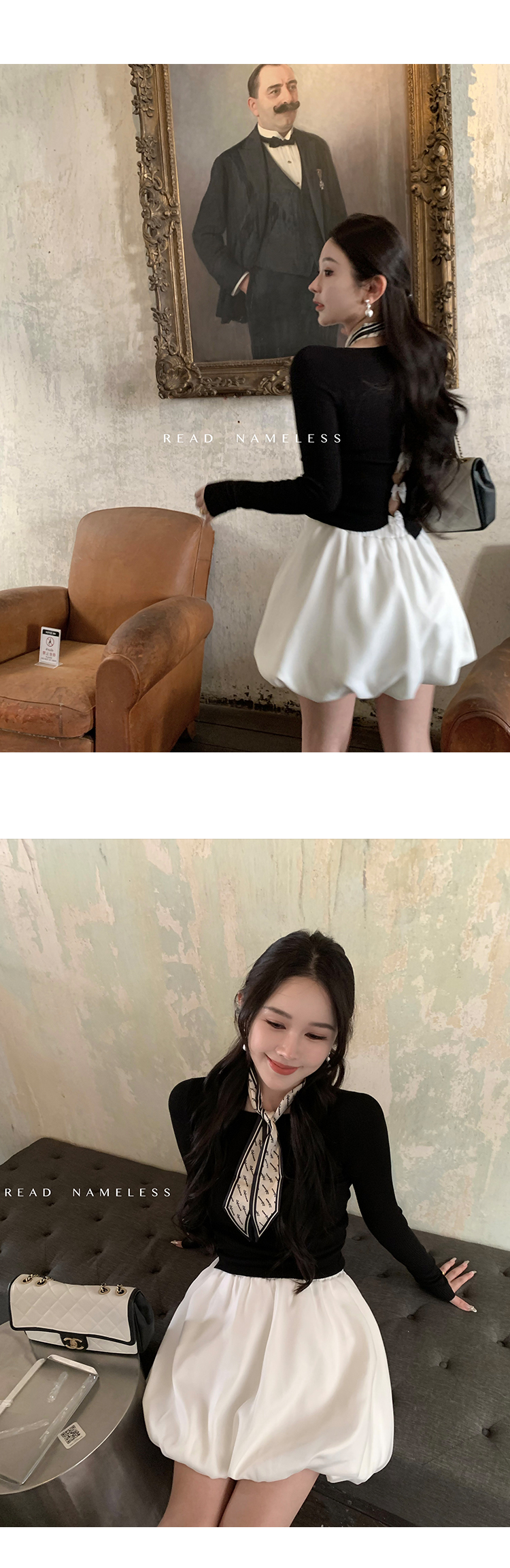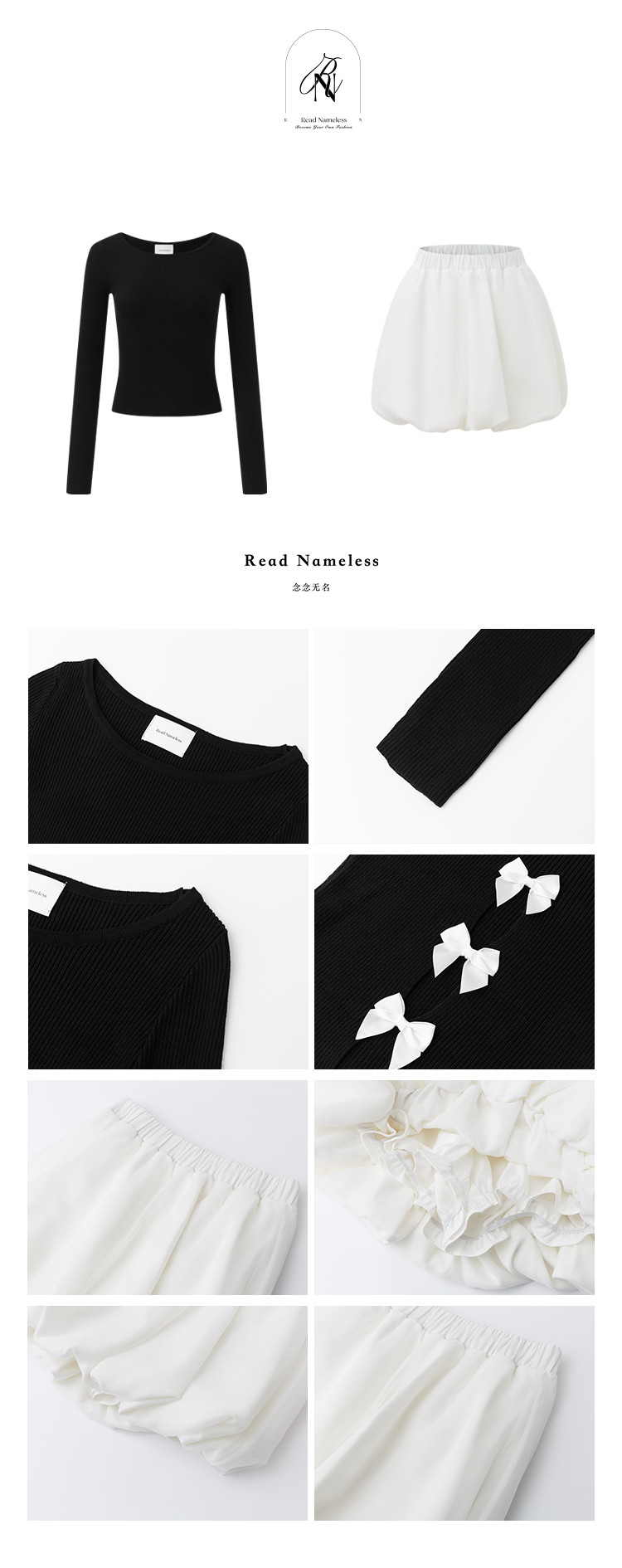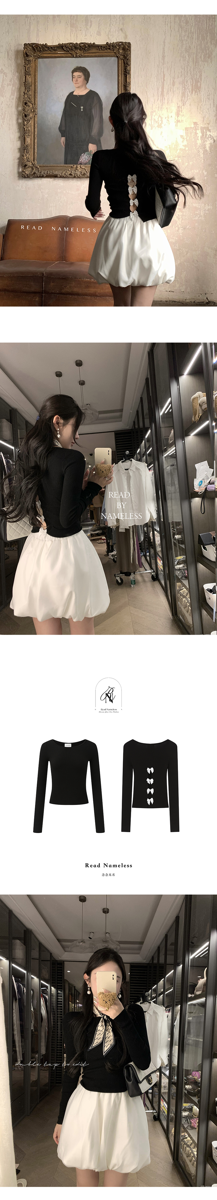 Read Nameless /后背镂空蝴蝶结黑色上衣+缎面拼纱白色花苞裙裤2025/3/15