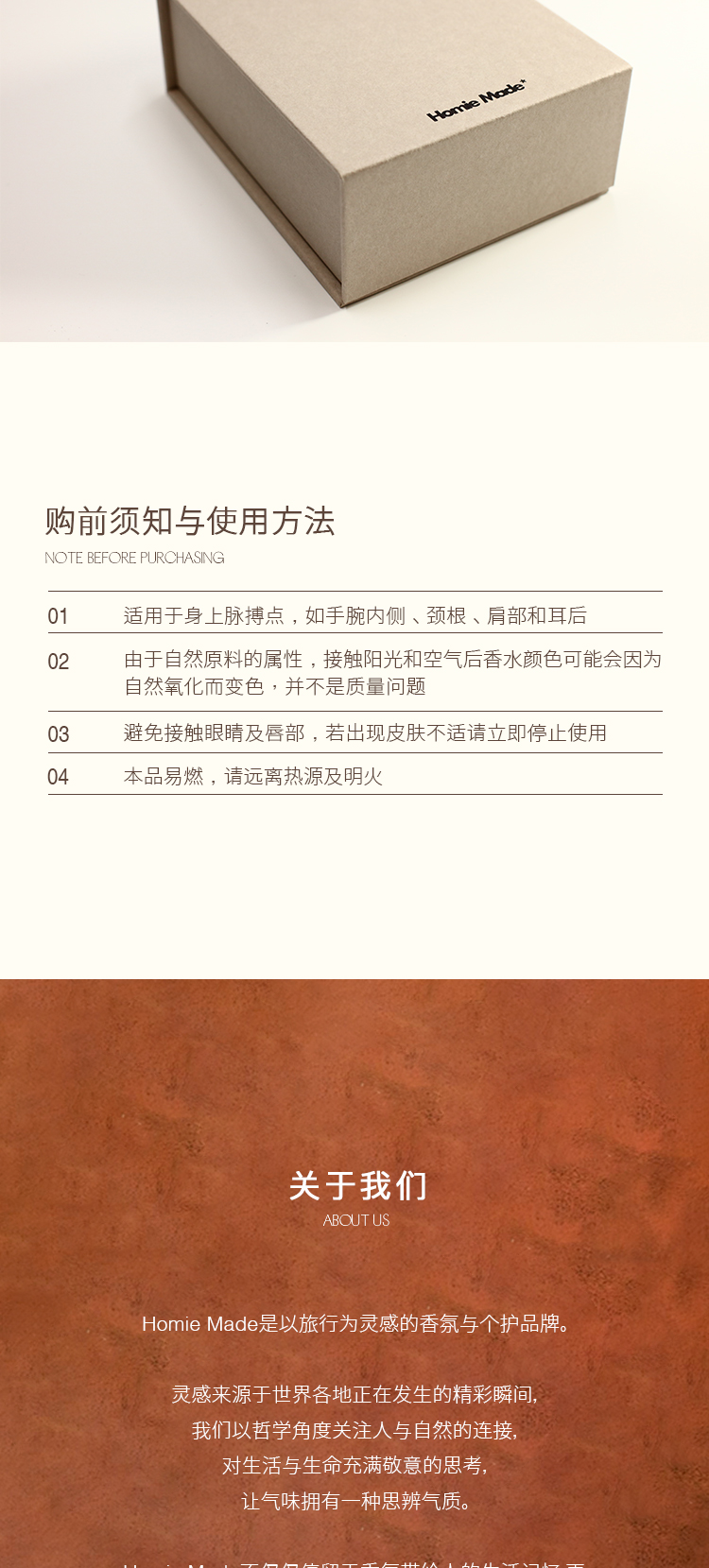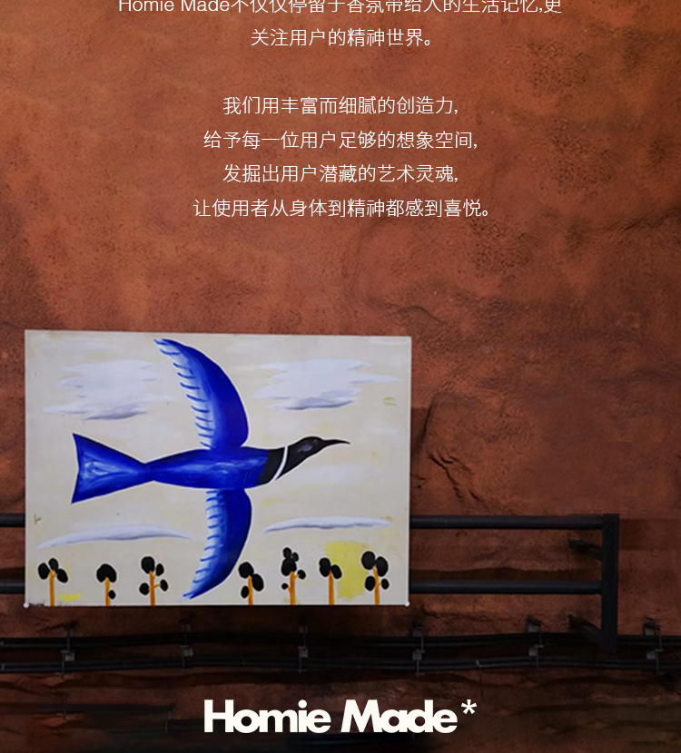 Homie Made 是以户外为灵感的香氛与个护品牌,灵感来源于世界各地正在发生的精彩瞬间。我们以哲学角度关注人与自然的连接,对生活与生命充满敬意的思考,让气味拥有一种思辨气质。