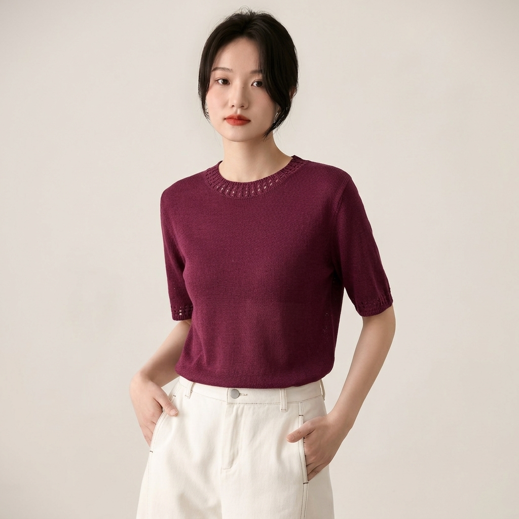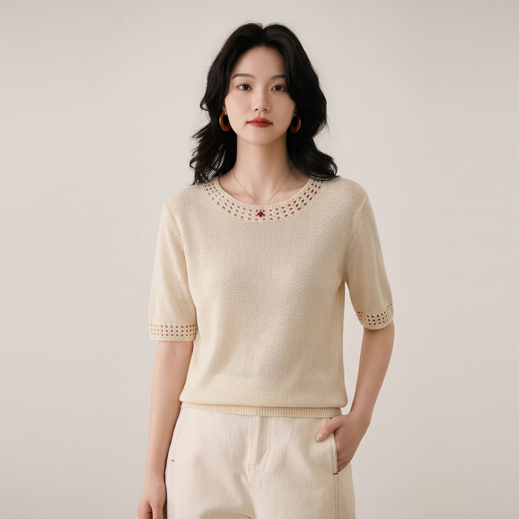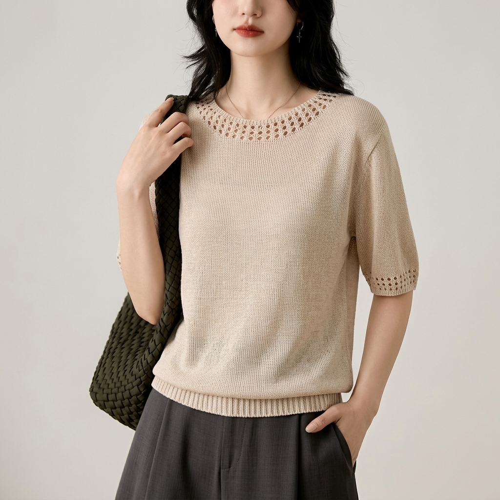 浅茶雅韵~莱赛尔圆领镂空针织衫女轻奢高级感法式宽松中袖上衣