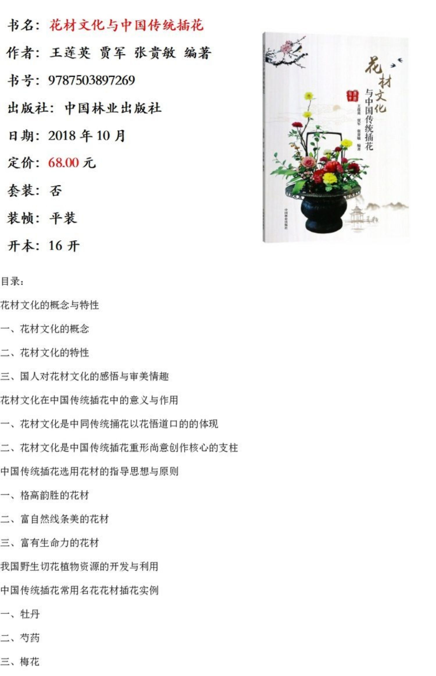 花材文化与中国传统插花 9726 王莲英 贾军 张贵敏 编著 花艺 中国传统插花常用名花花材插花实例 中国林业出版社 畅销书