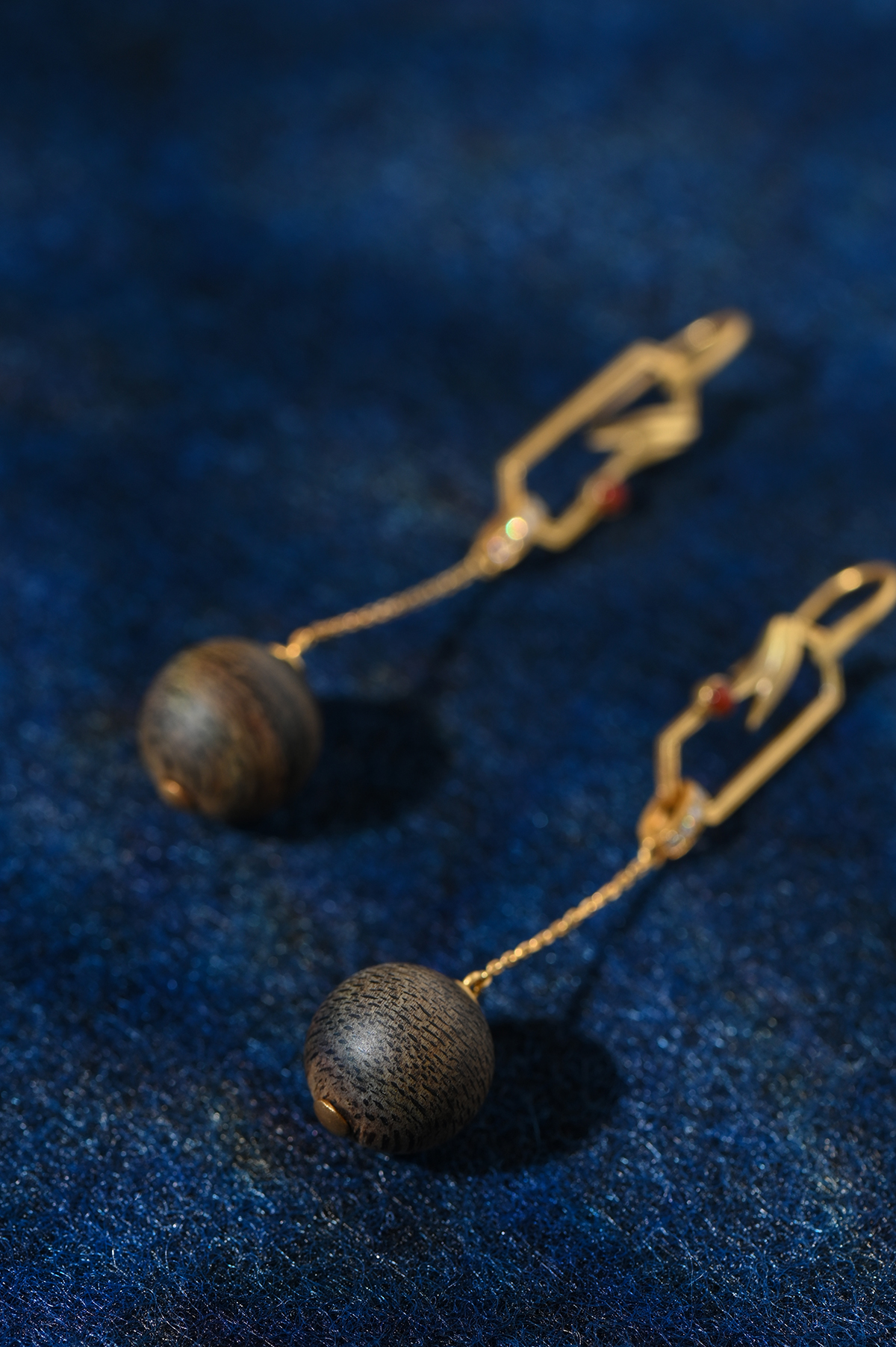搭配天然文莱沉香珠,既保留了中式器物的 “雅”,又用现代简约的金属结构(别针式造型)打破传统配饰的厚重感。