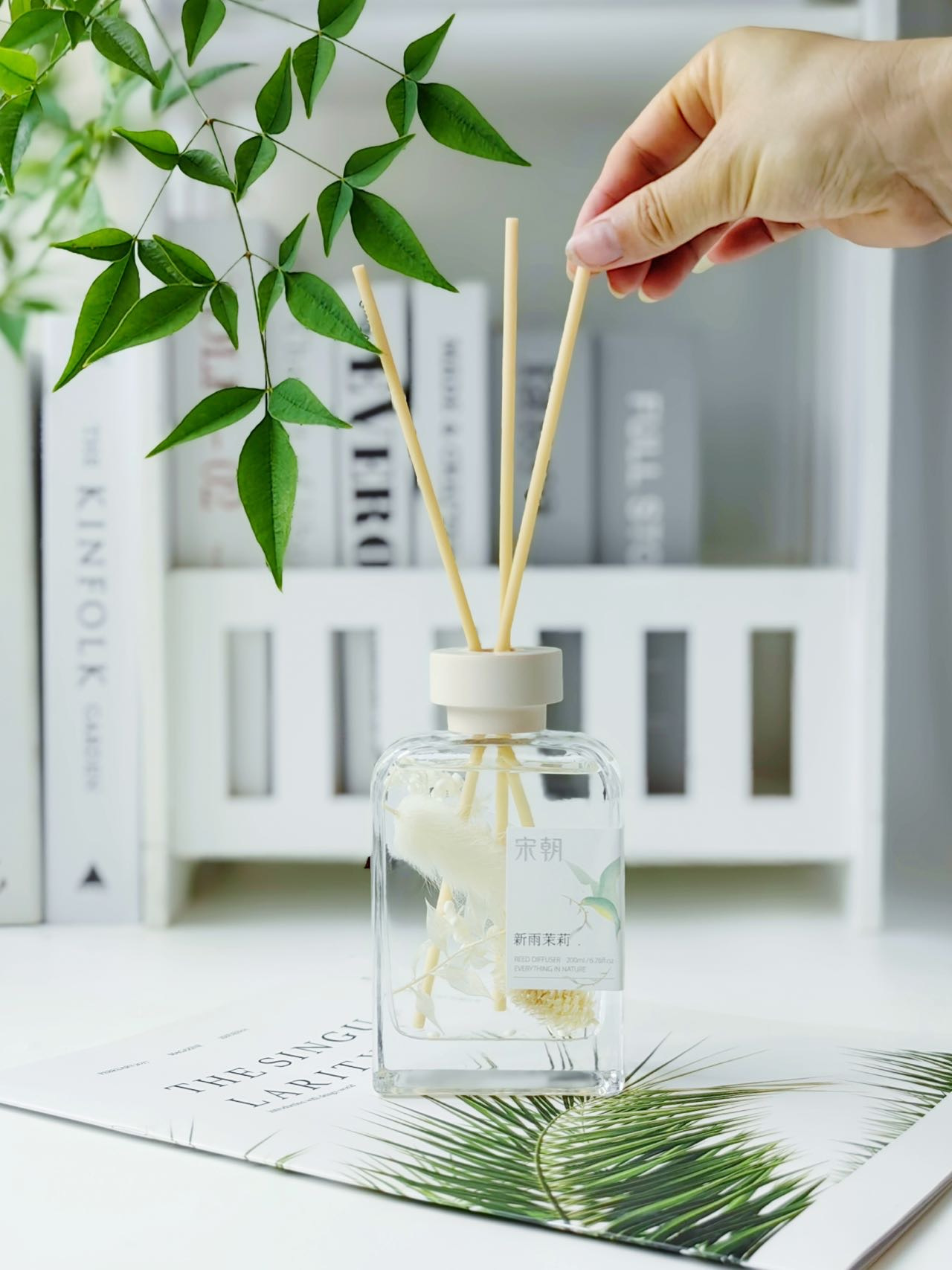 筛选出心态饱满的花叶,进行修剪,修出好看的形状后,装进扩香液,得以鲜活生动的心态~