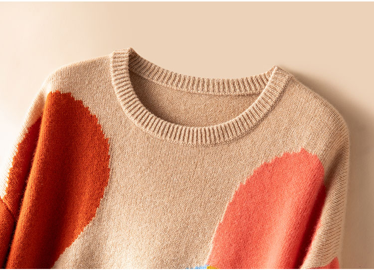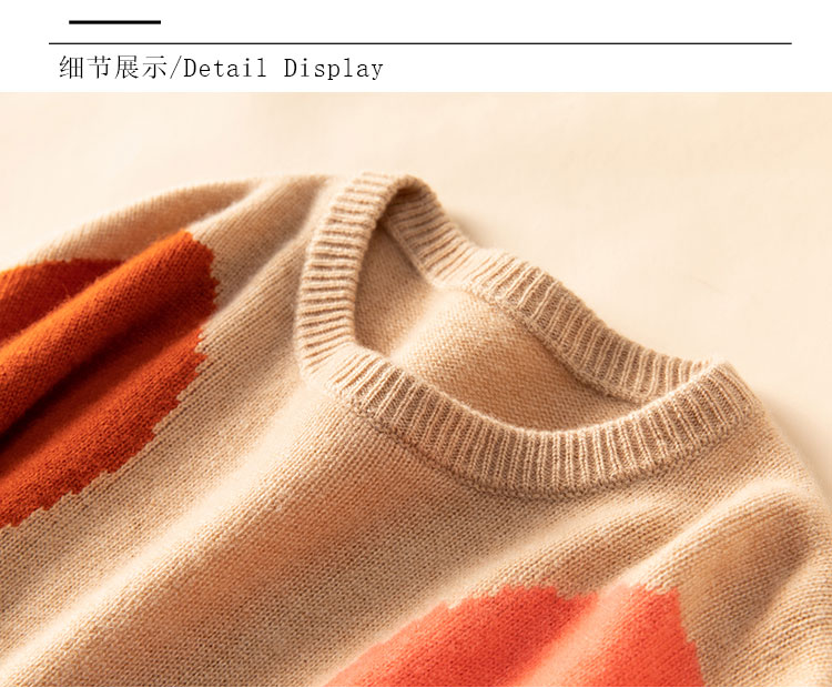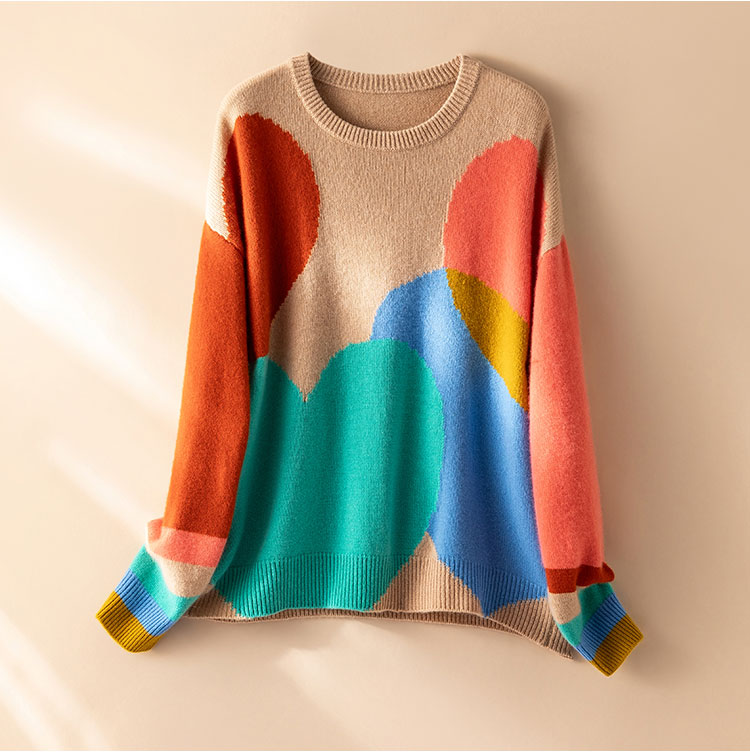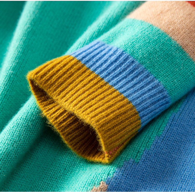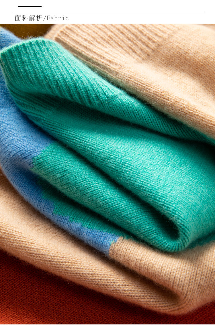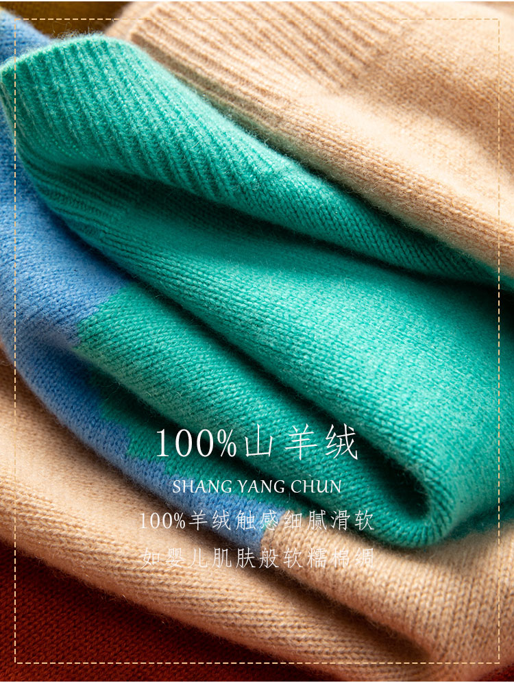 多巴胺配色~100纯山羊绒衫女时尚拼色提花圆领套头长袖上衣