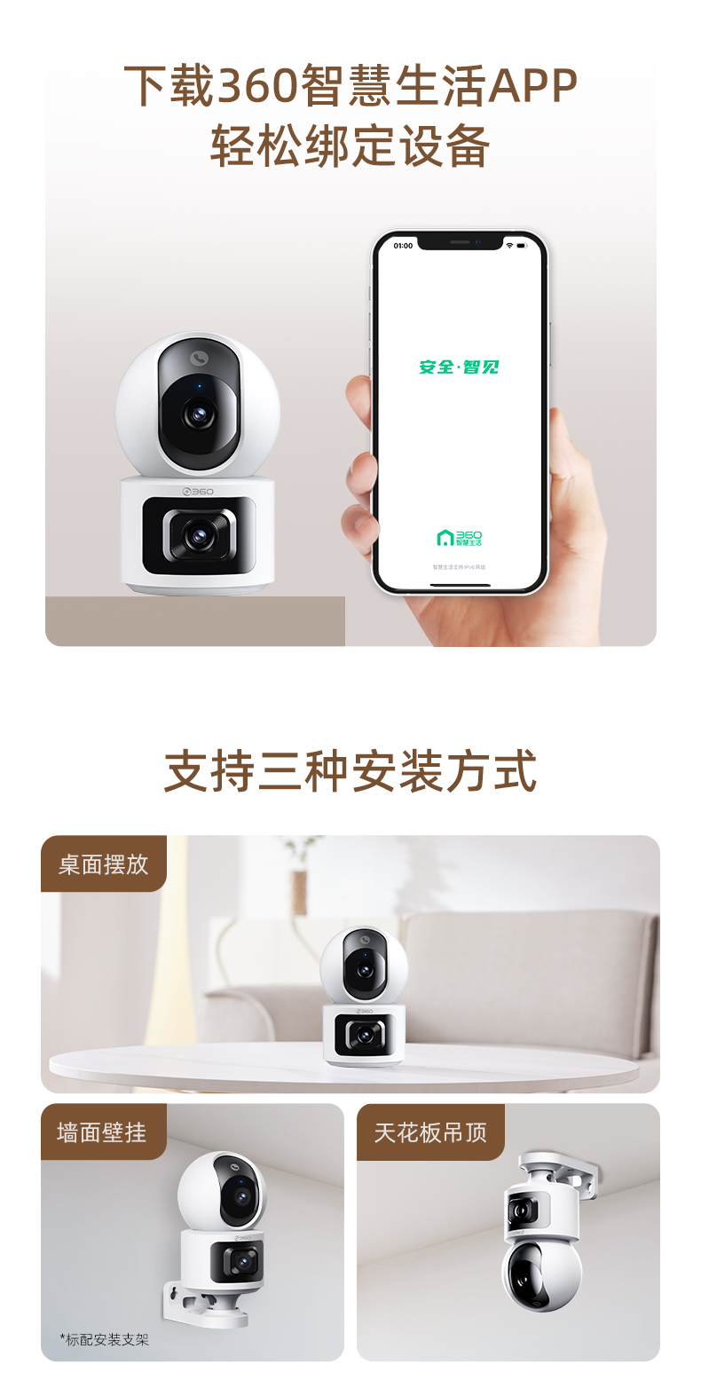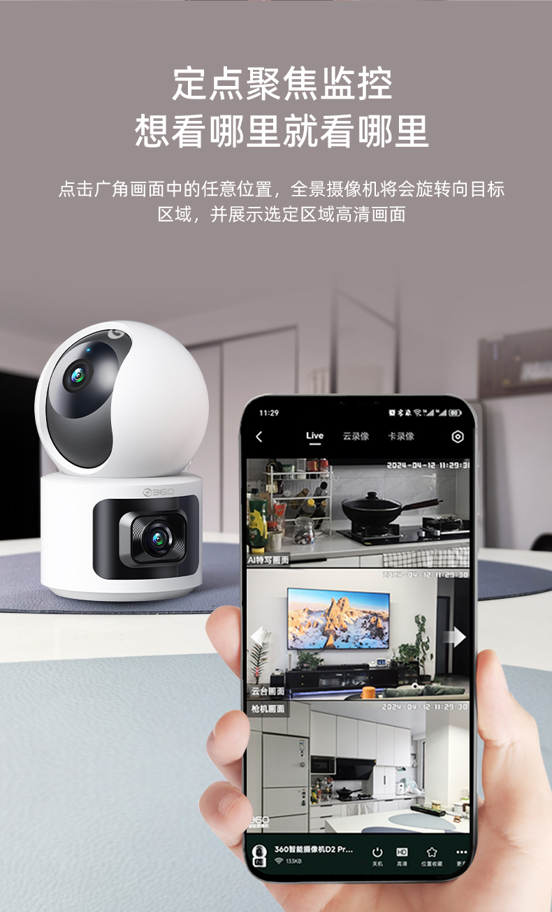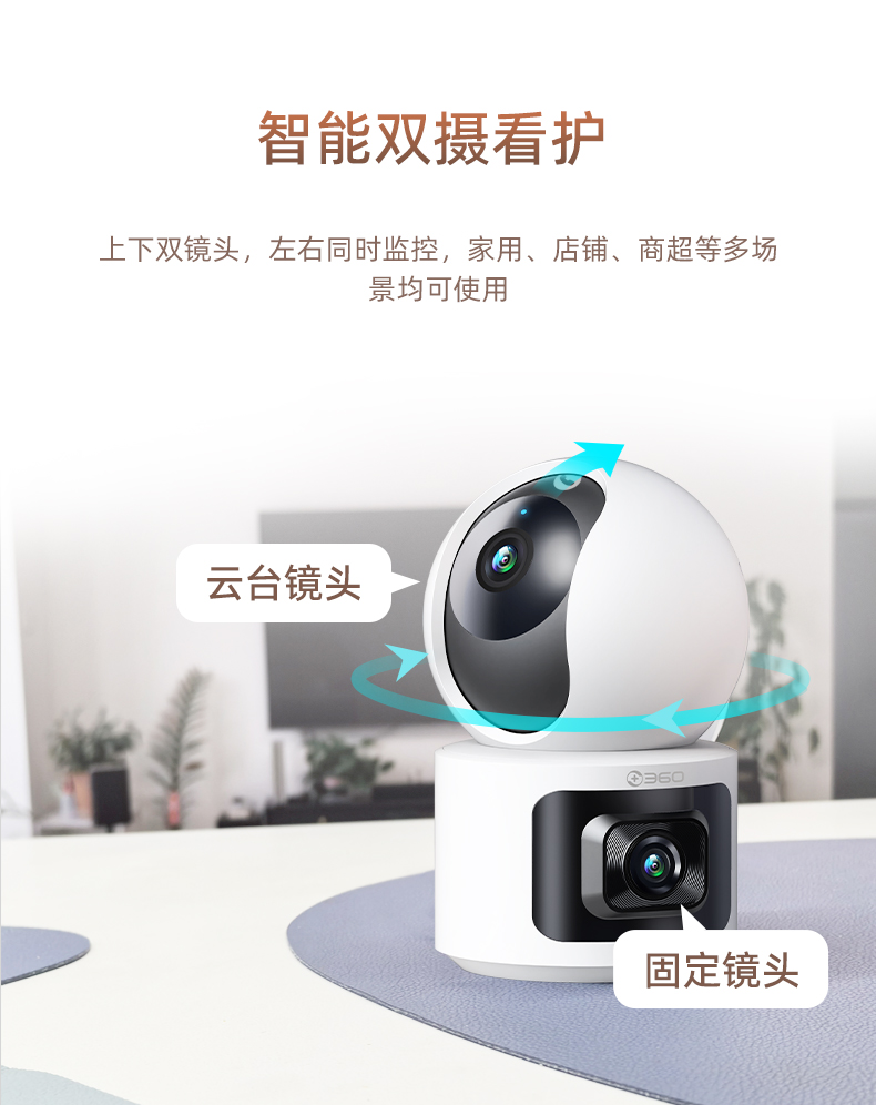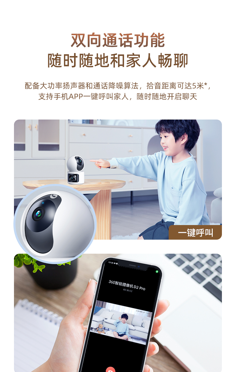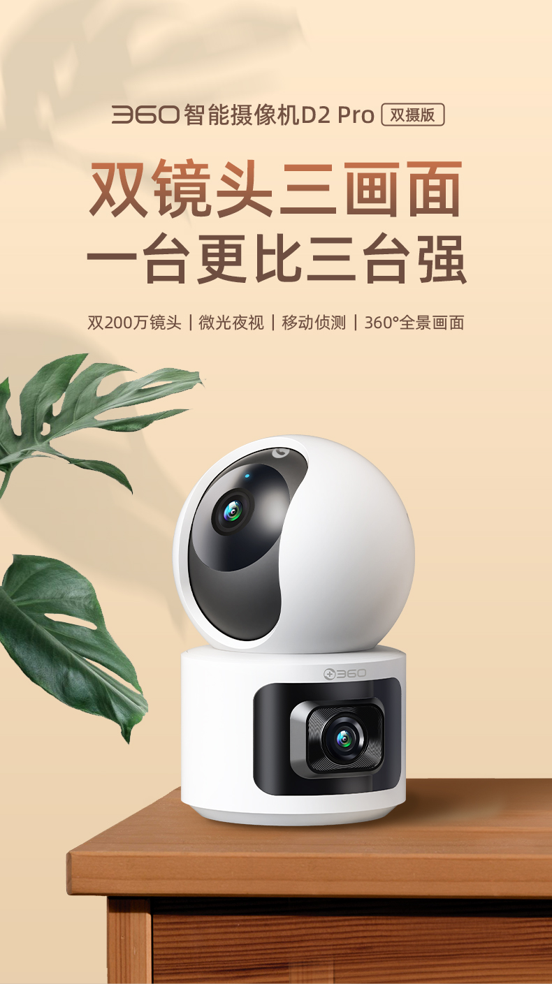 【超值】360智能摄像机D2 Pro双摄版 双200万镜头 微光夜视 移动侦测 360度全景画面