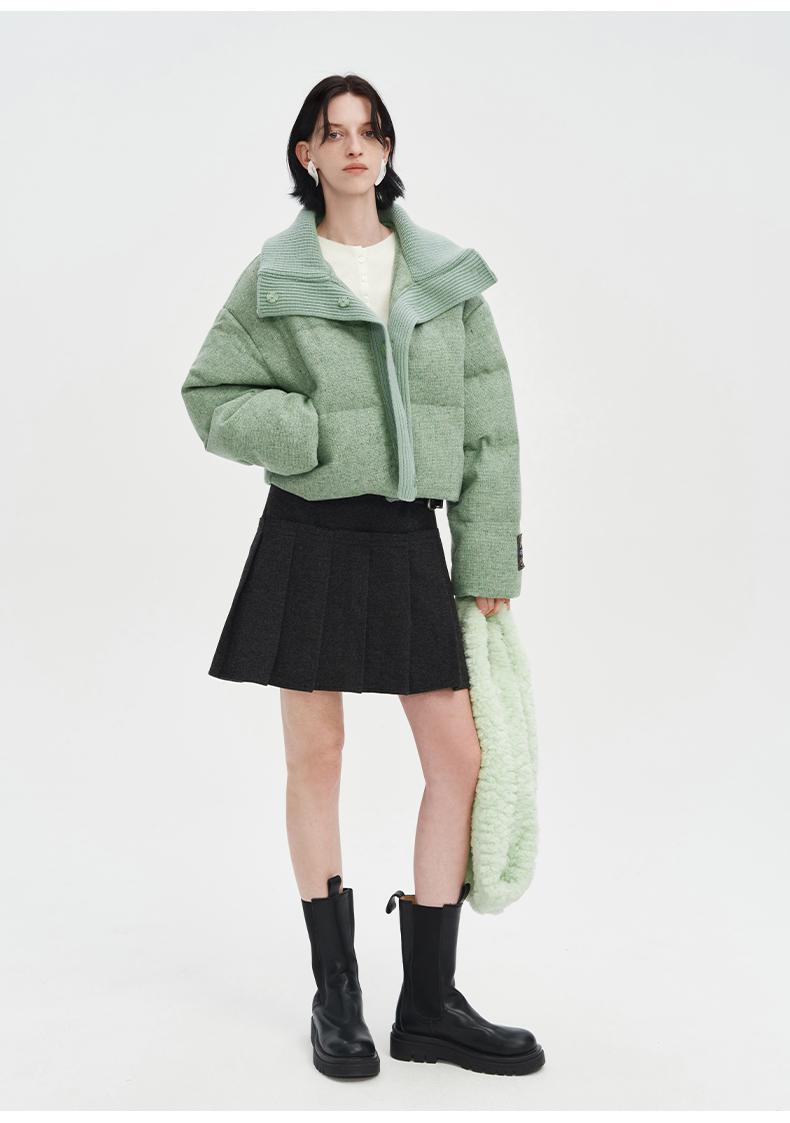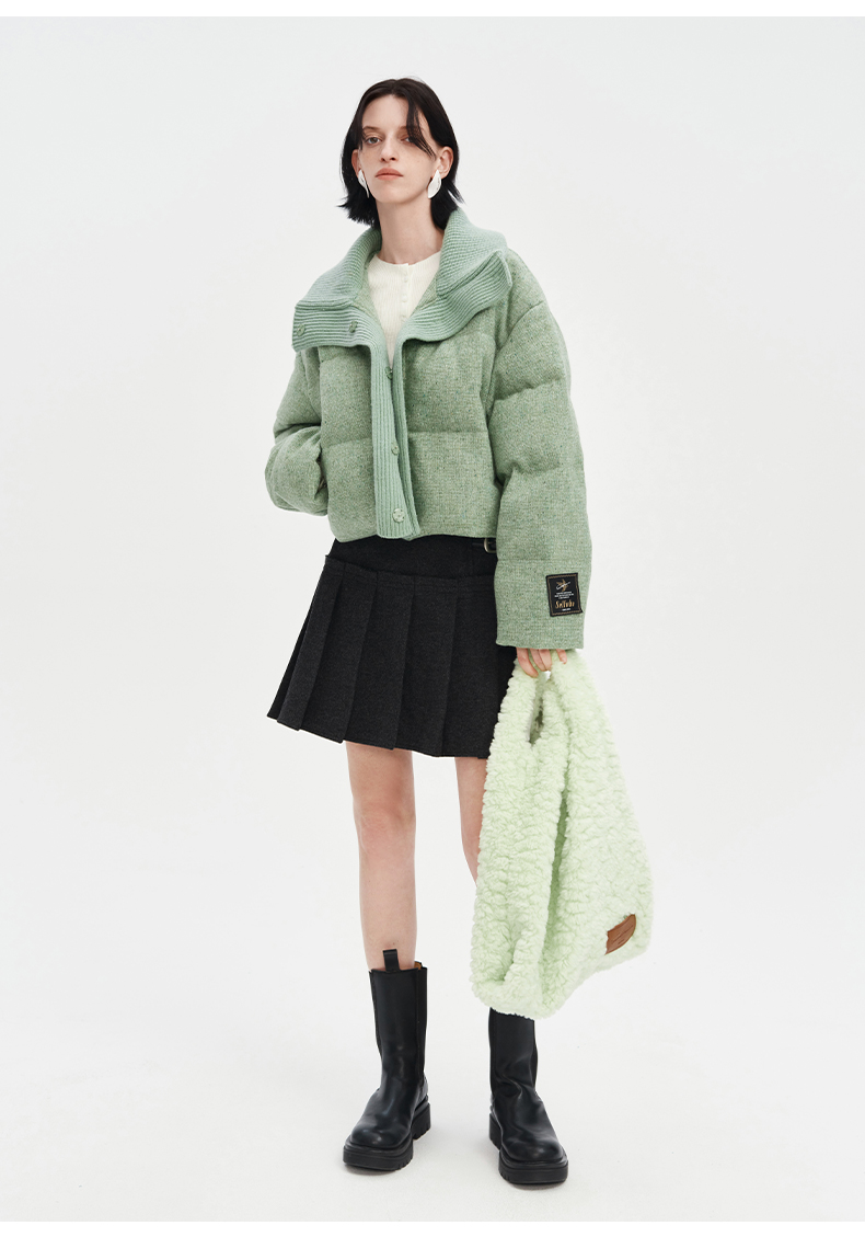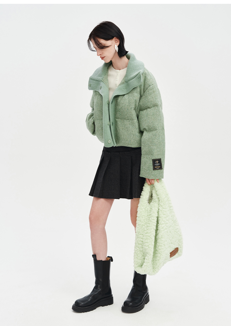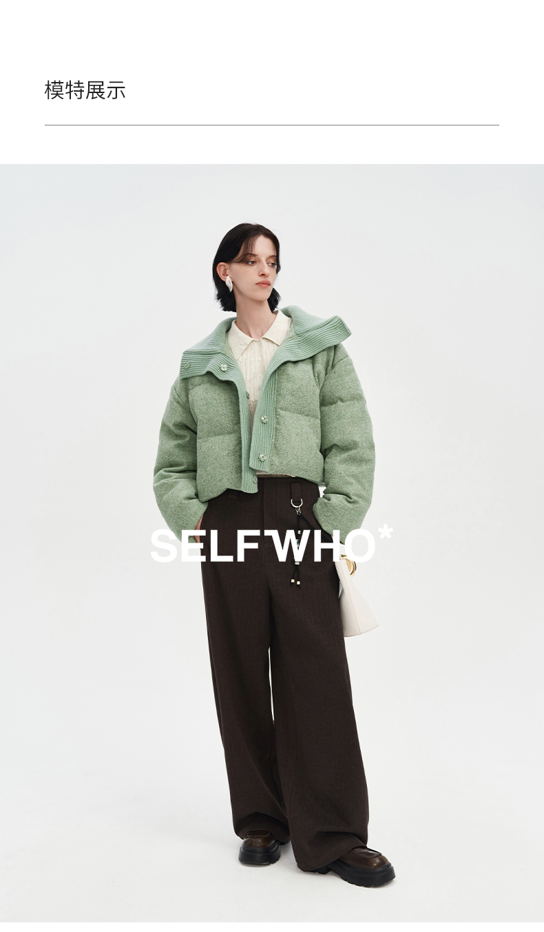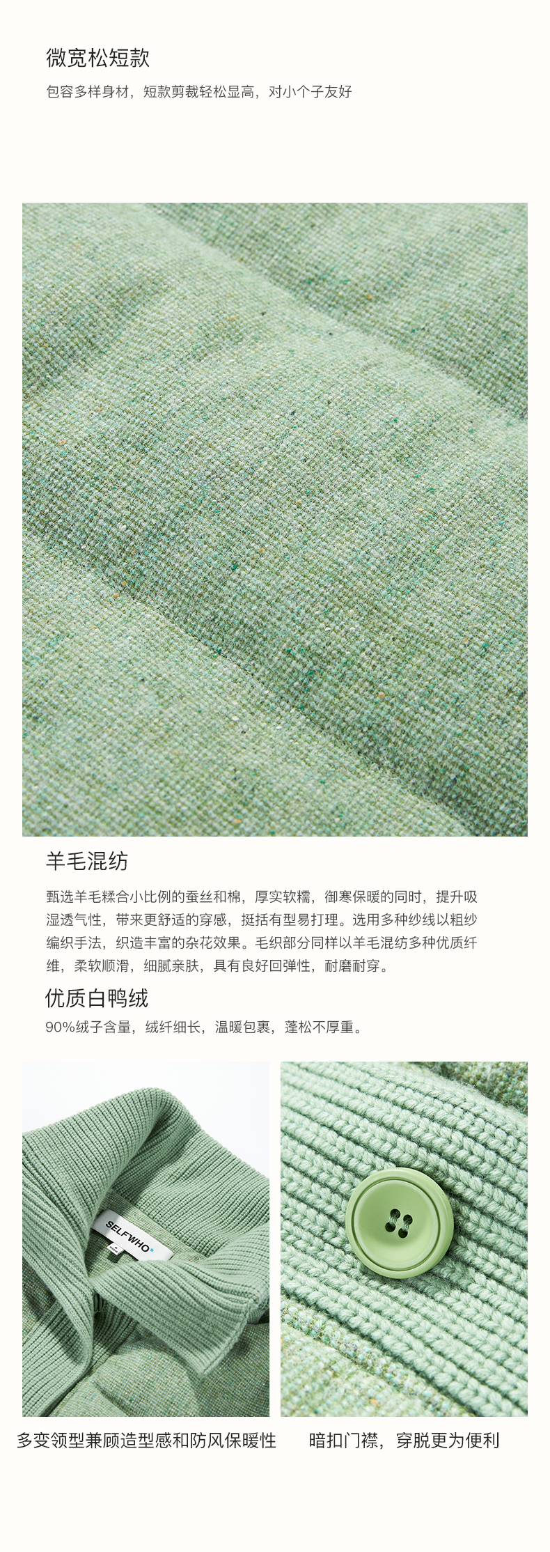 SELFWHO90白鸭绒毛织拼接羽绒服女2024冬保暖防寒绿色翻领短外套