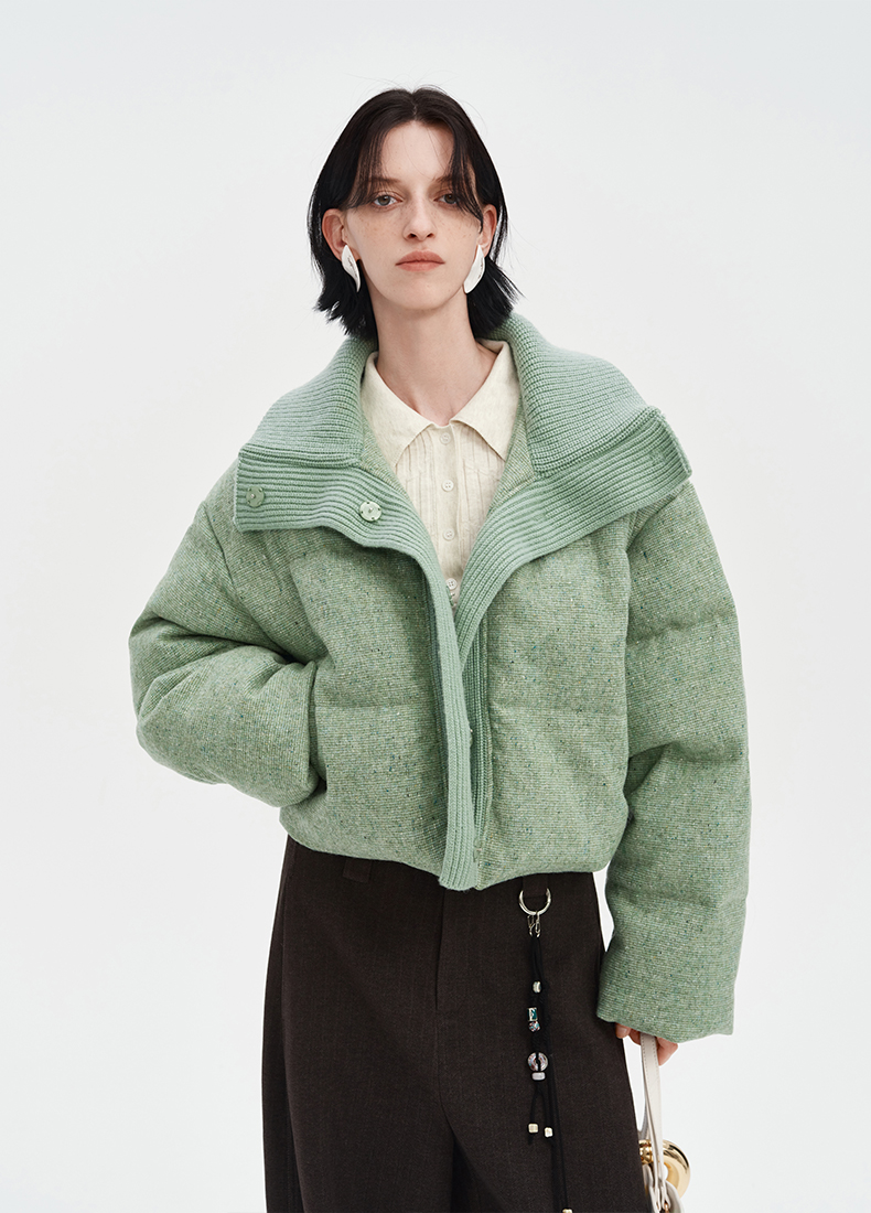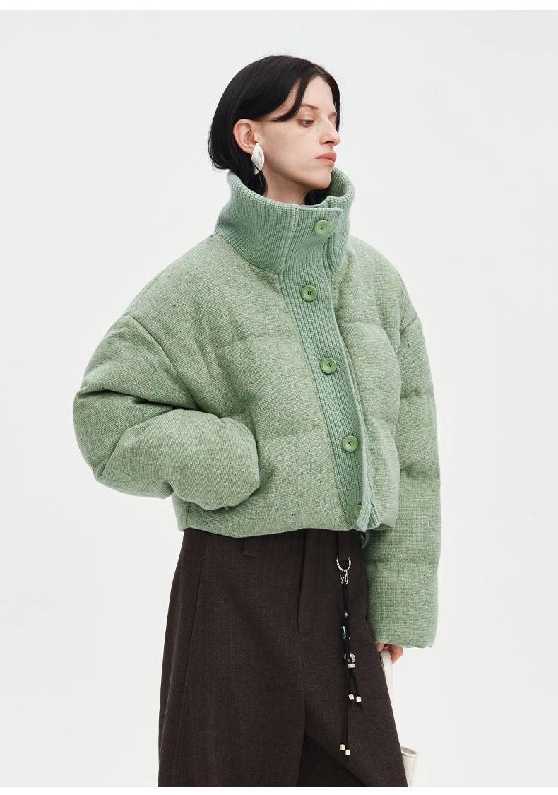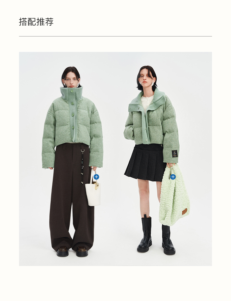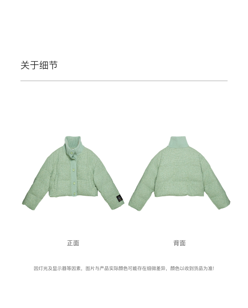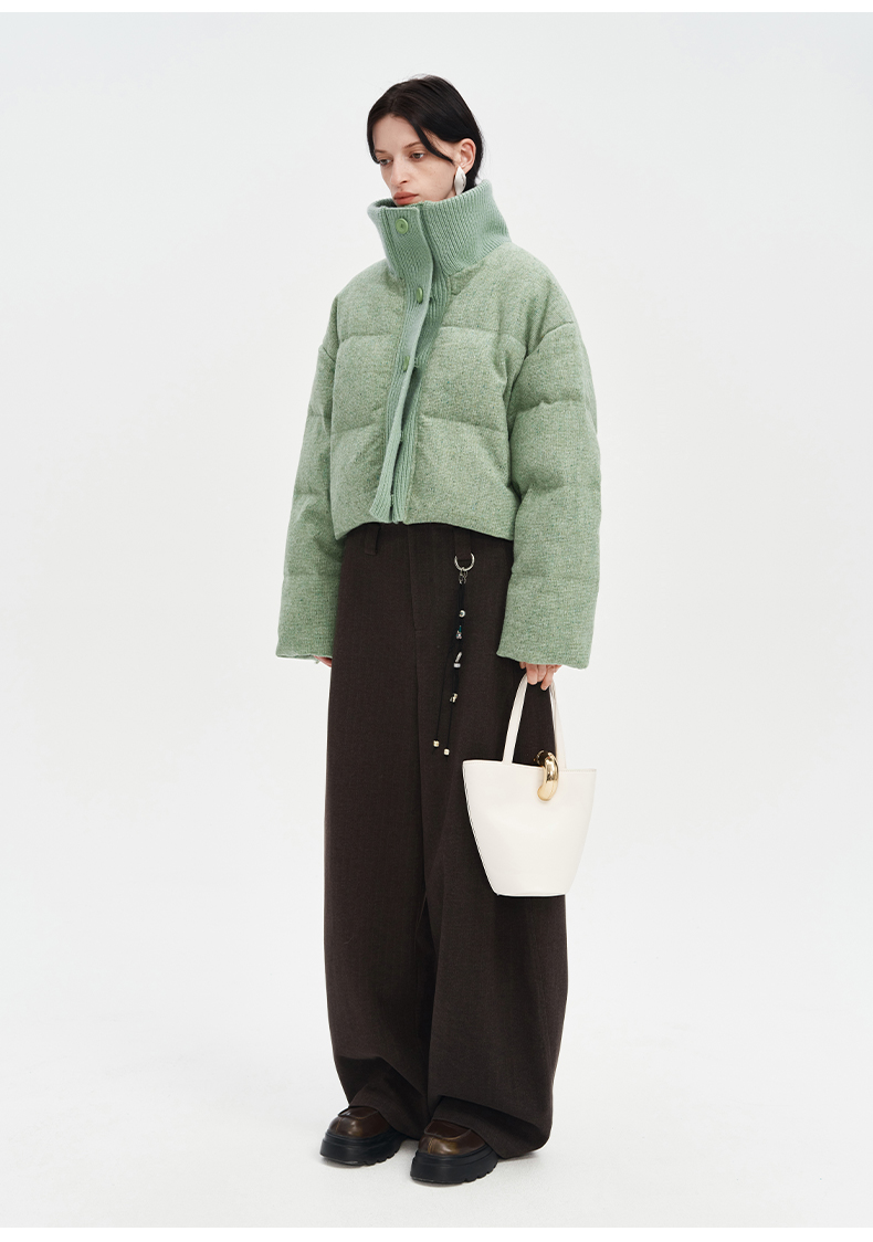 SELFWHO90白鸭绒毛织拼接羽绒服女2024冬保暖防寒绿色翻领短外套