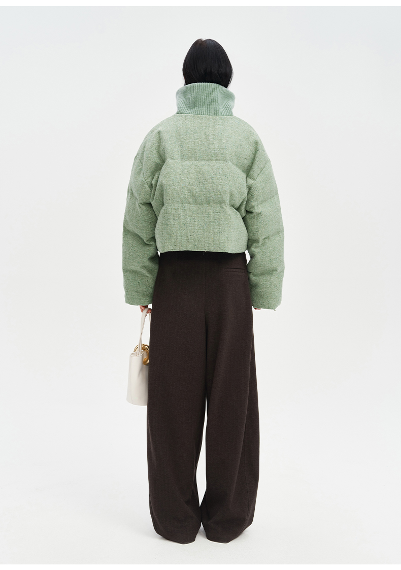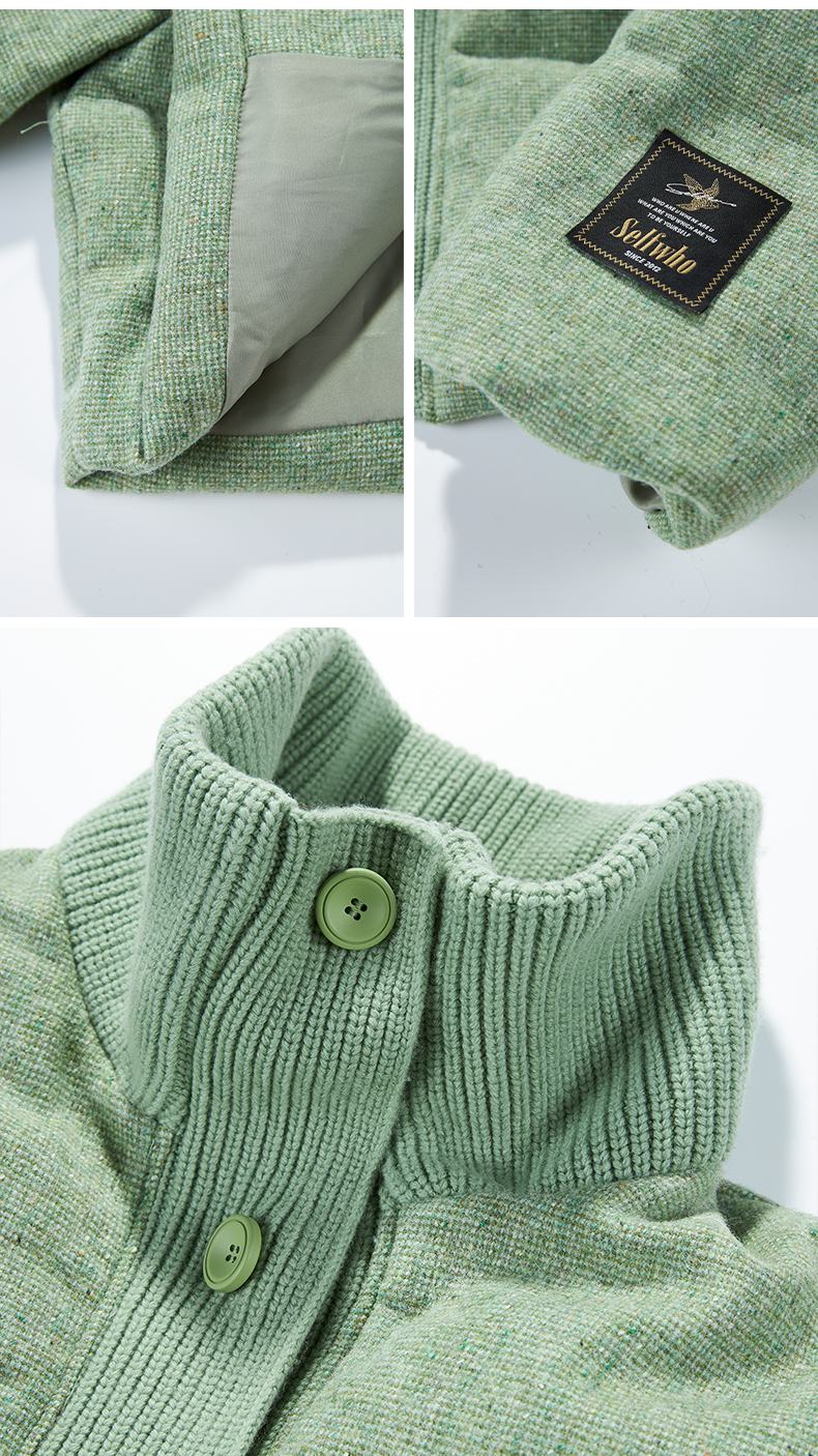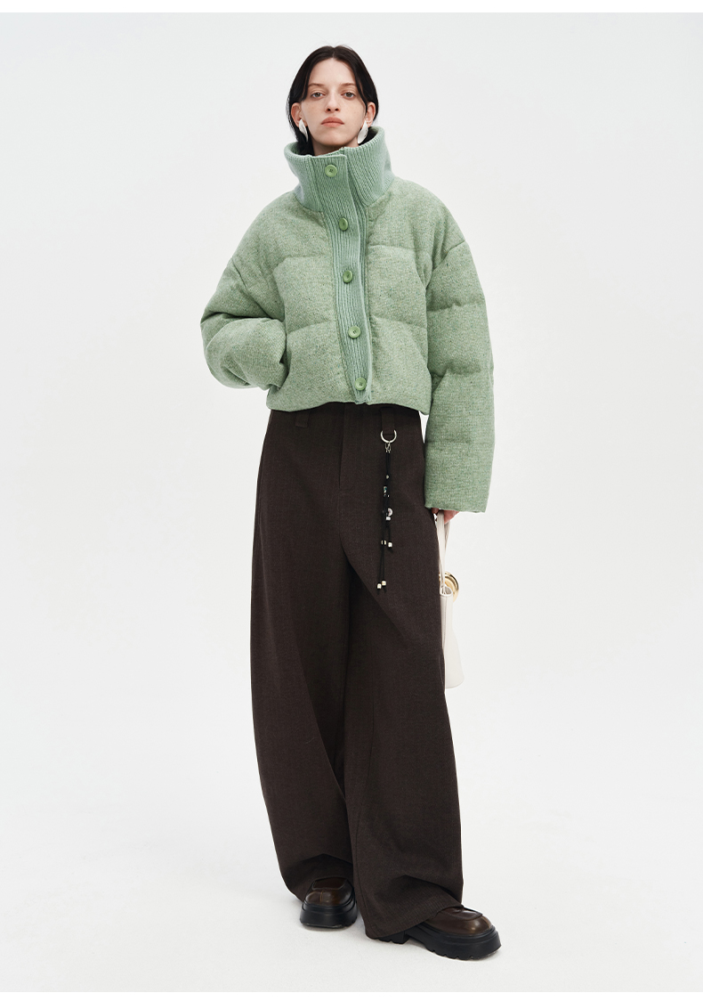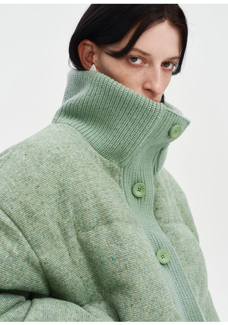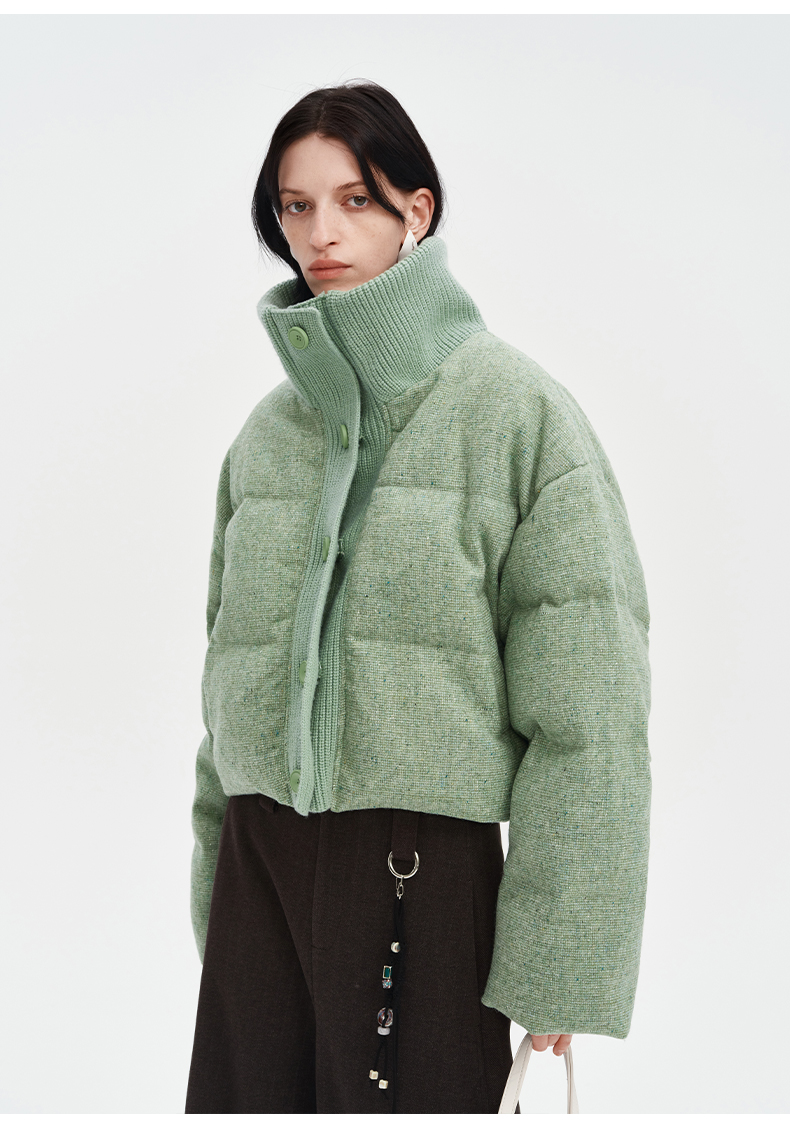 SELFWHO90白鸭绒毛织拼接羽绒服女2024冬保暖防寒绿色翻领短外套