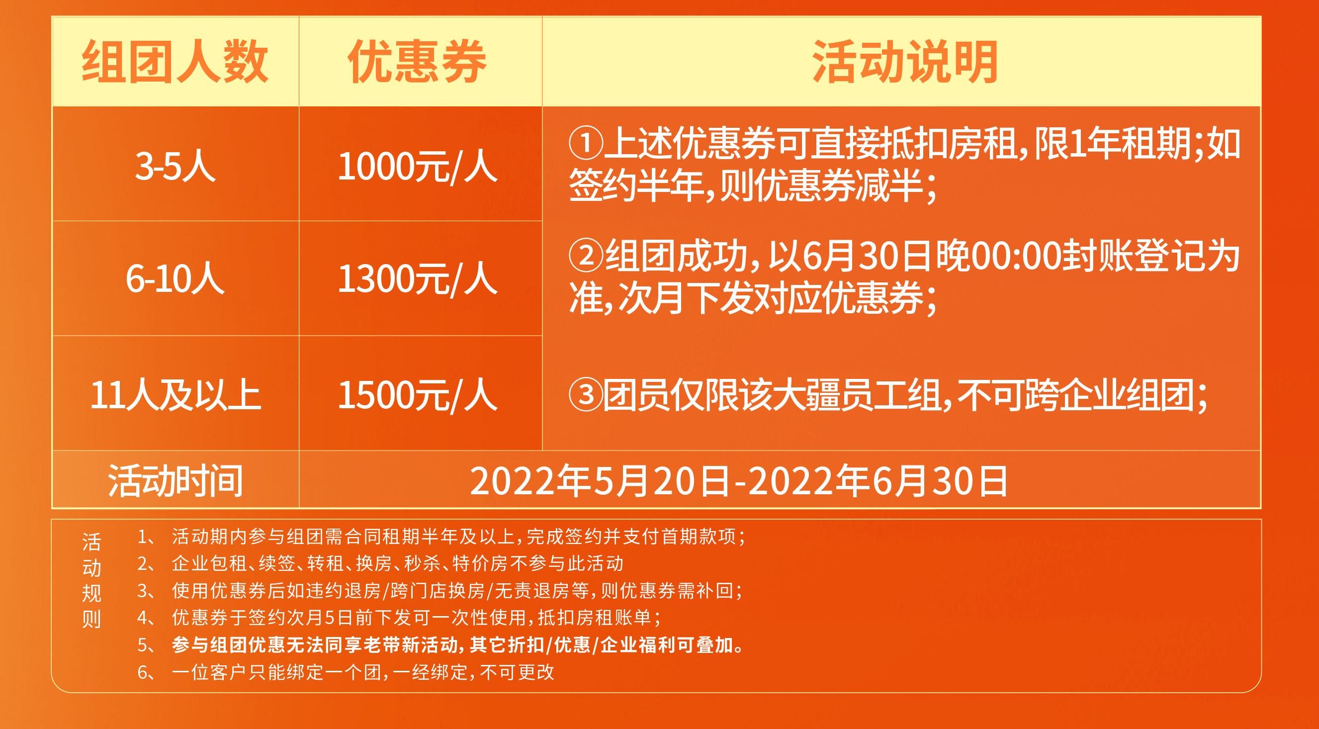 1、活动期内参与组团需合同租期半年及以上,完成签约并支付首期款项;