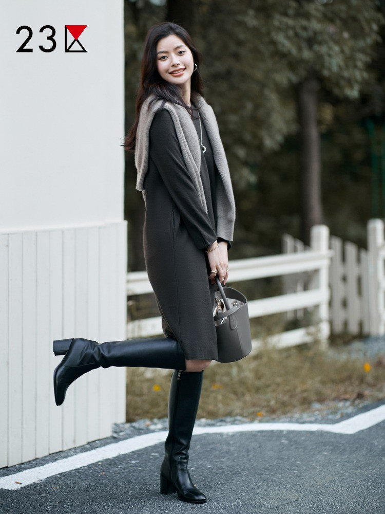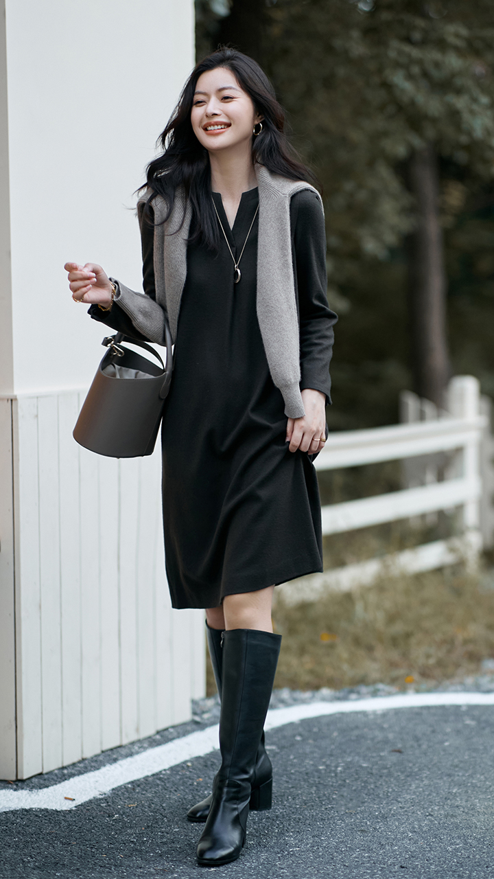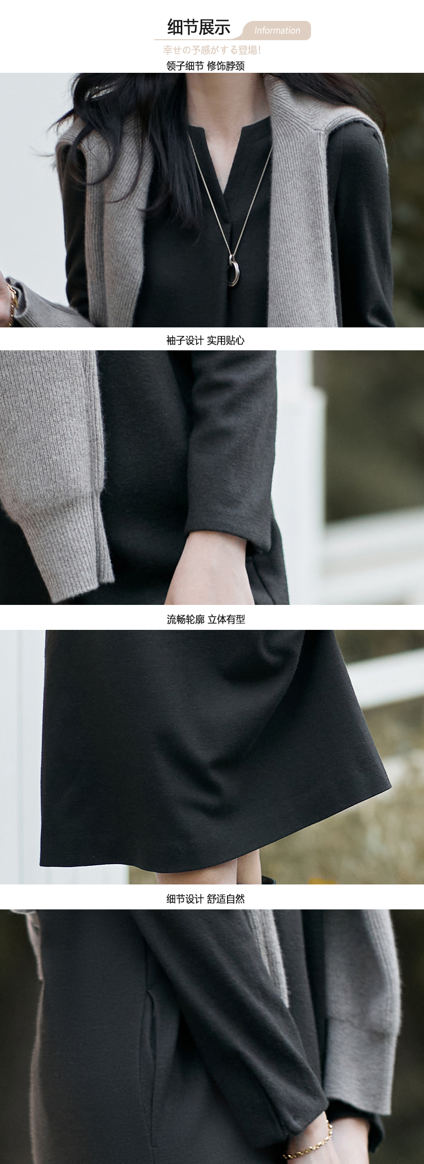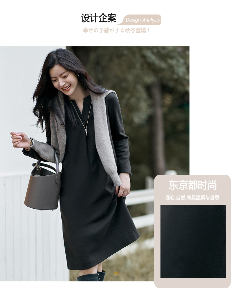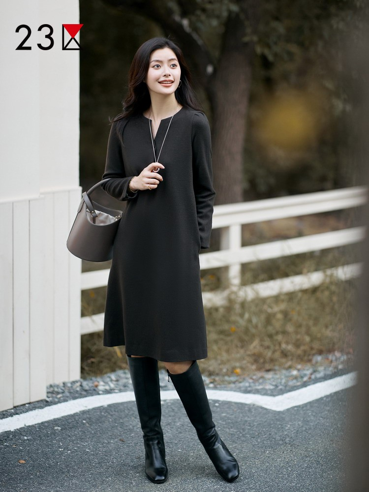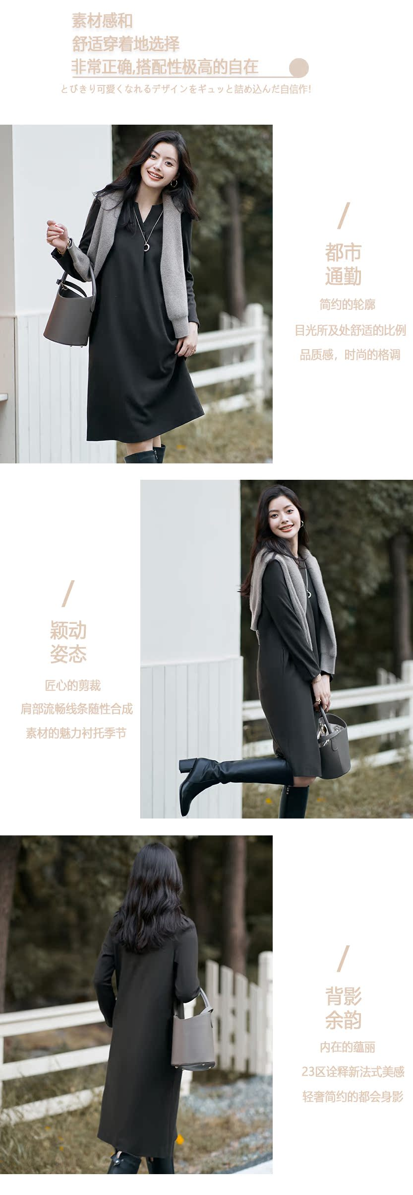 23区日系秋冬季通勤宽松纯羊毛直筒连衣裙V领套头连身裙商场同款